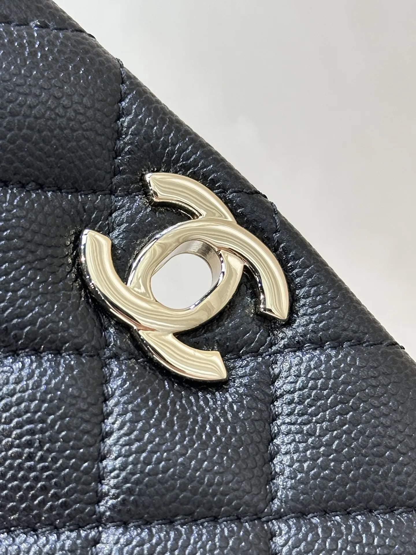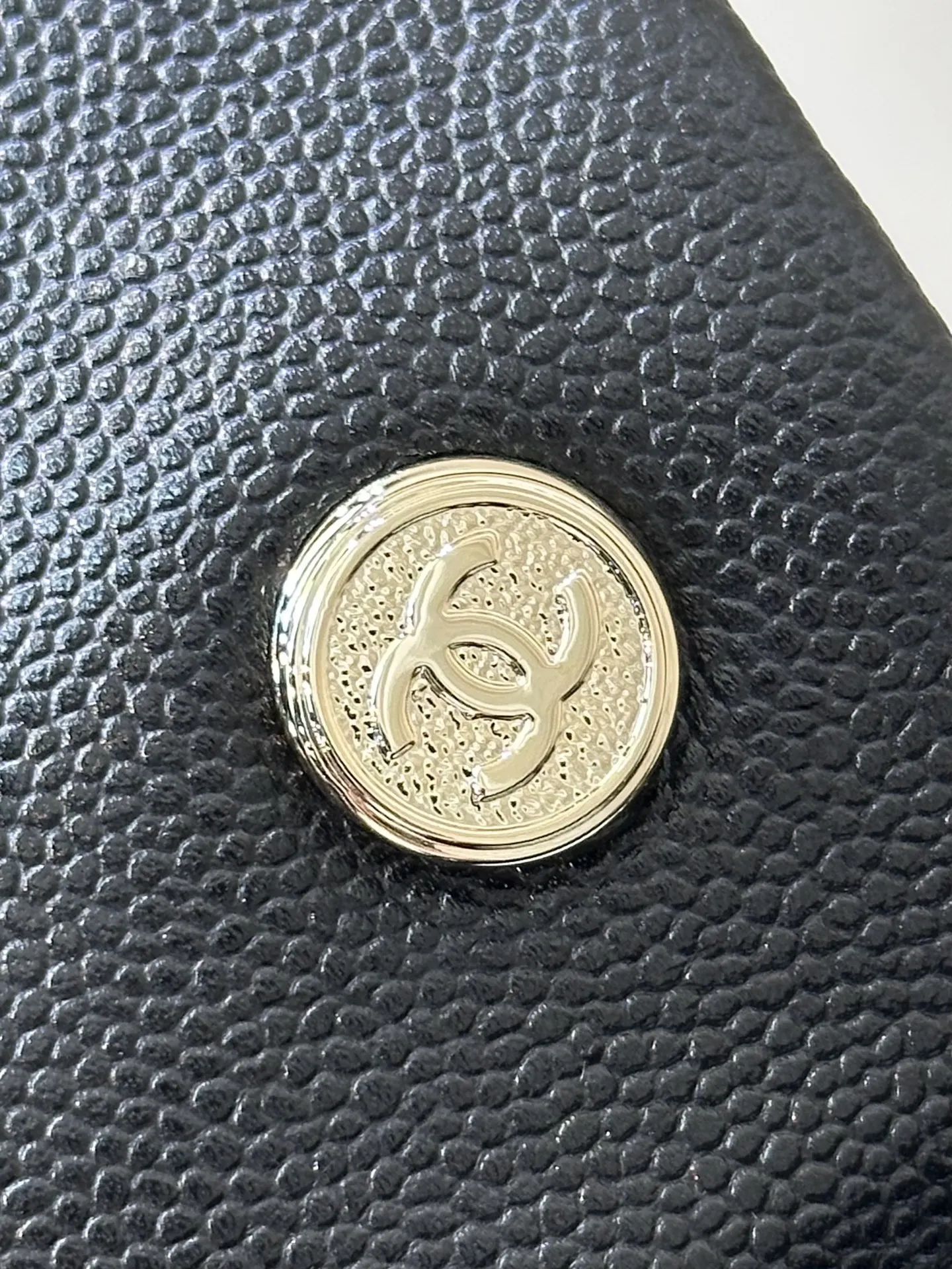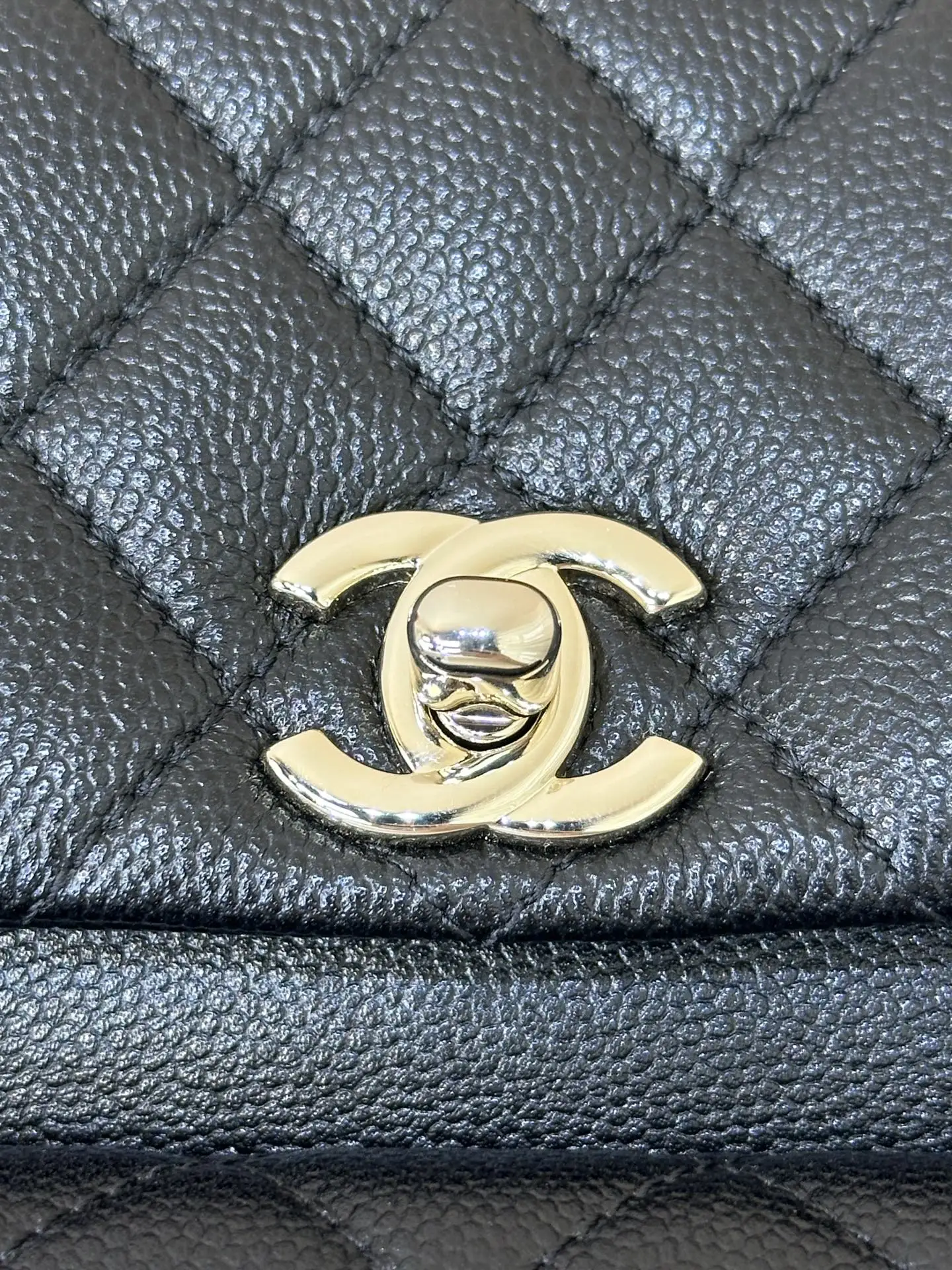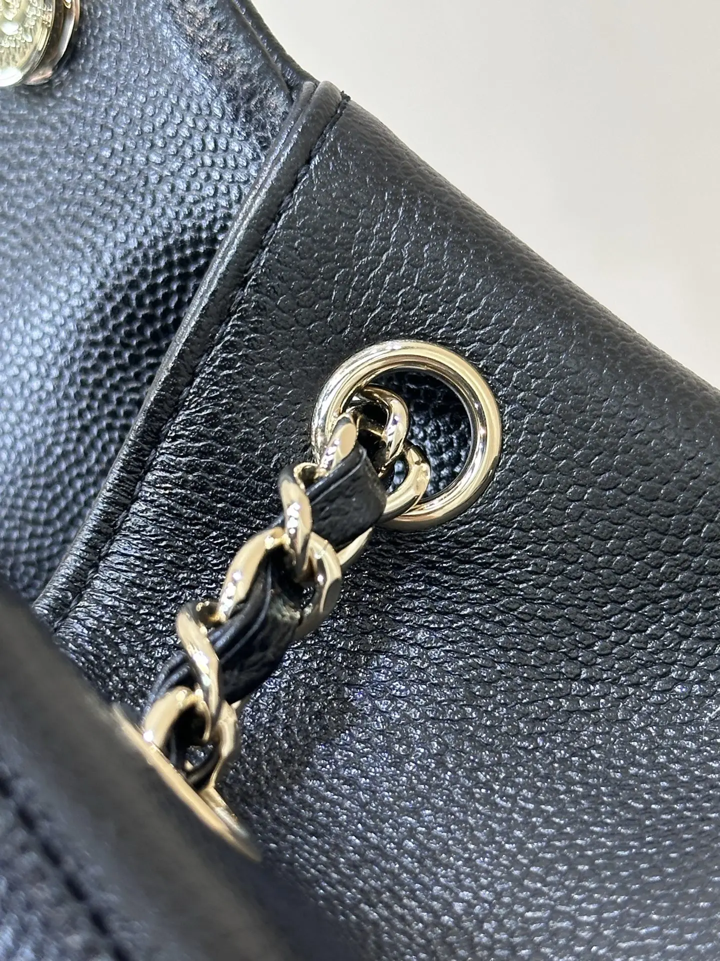 4399/ 淡淡的金色五金搭配黑色鱼子酱质感很好 链条是亮面感 中间是皮拼链设计 这个设计的要求非常高不仅要做好链条的光感还要做好皮质的精致 除了原厂几乎做不到 包身上的五金采用真金电镀的工艺 亮泽的质感