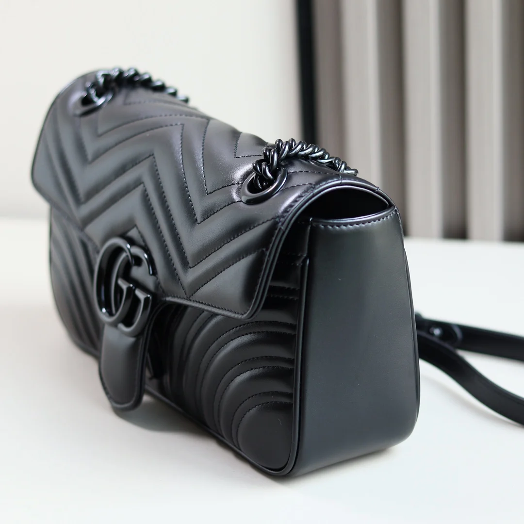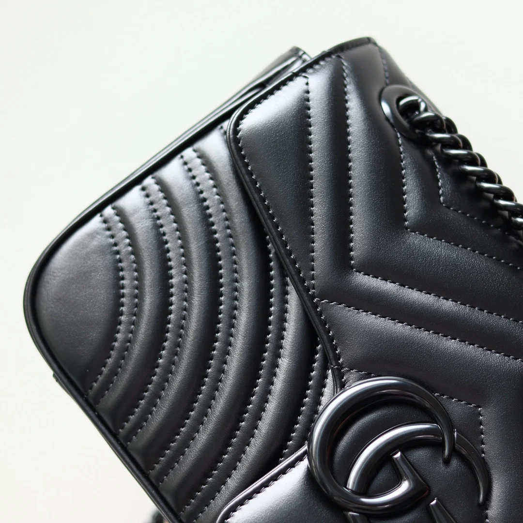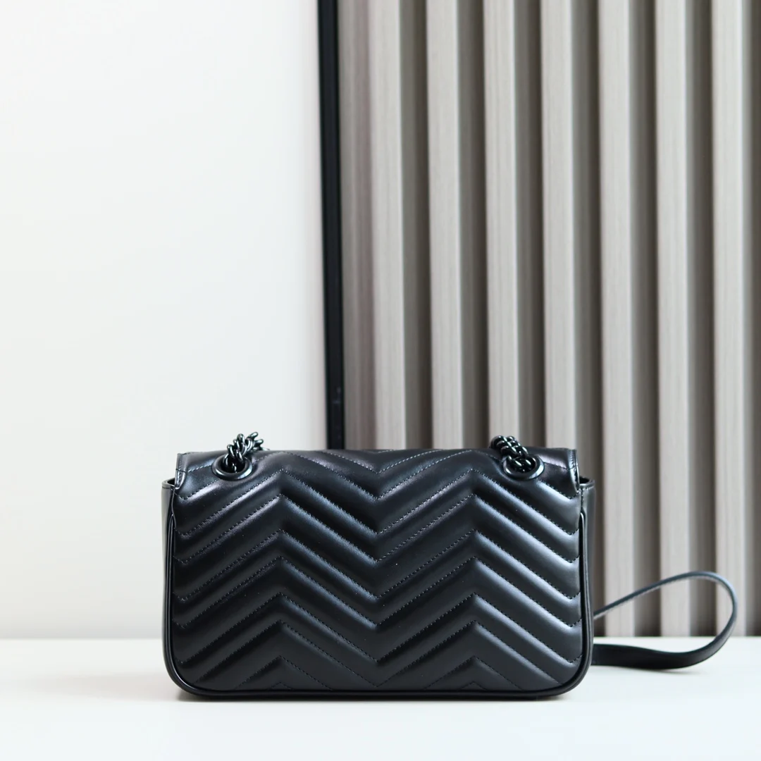 GG Marmont系列金属链迷你肩背包 结构柔软 超大翻盖点缀双G配件 全新色系采用绗缝V形皮革 搭配配有单色调配件 滑链肩带设计精巧 背法多样 可在肩背和手提之间自由转换