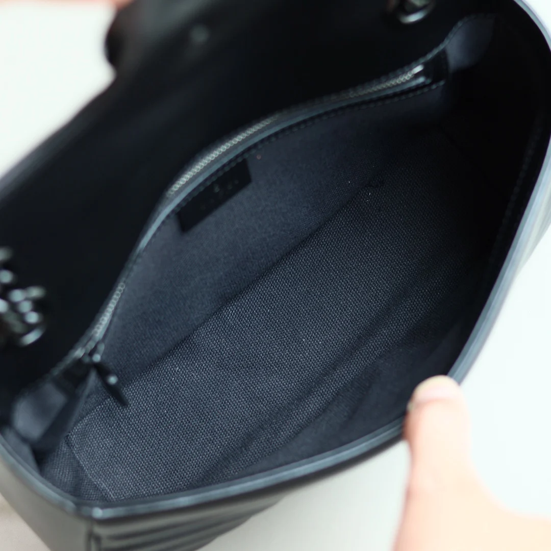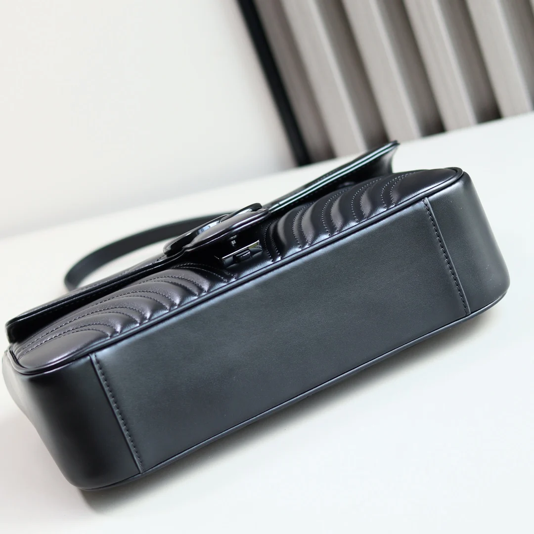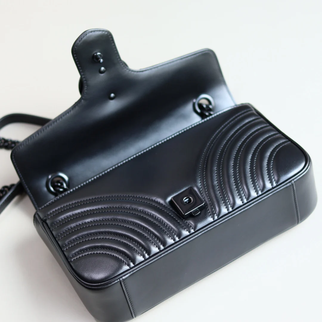 GG Marmont系列金属链迷你肩背包 结构柔软 超大翻盖点缀双G配件 全新色系采用绗缝V形皮革 搭配配有单色调配件 滑链肩带设计精巧 背法多样 可在肩背和手提之间自由转换