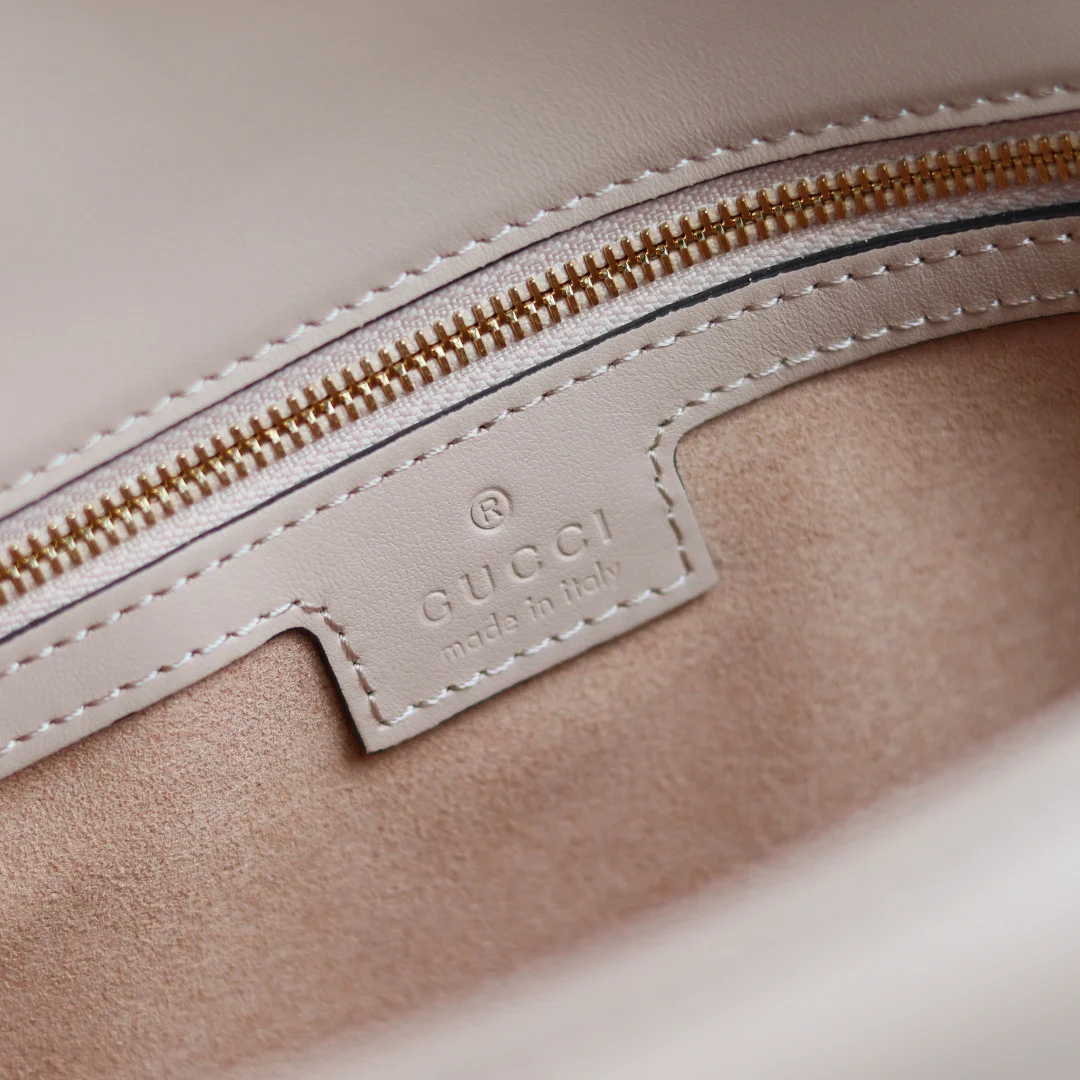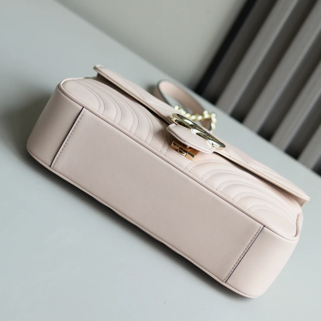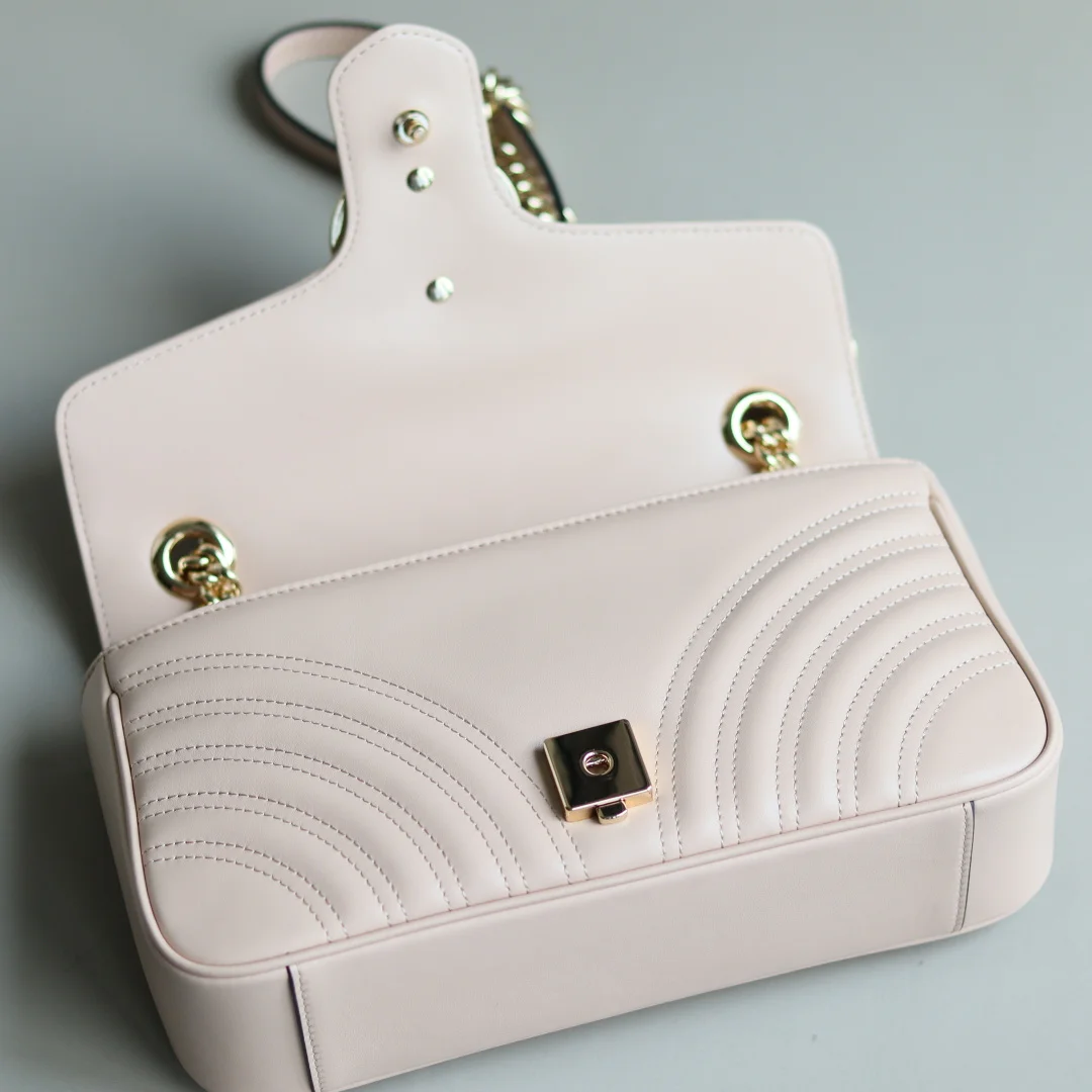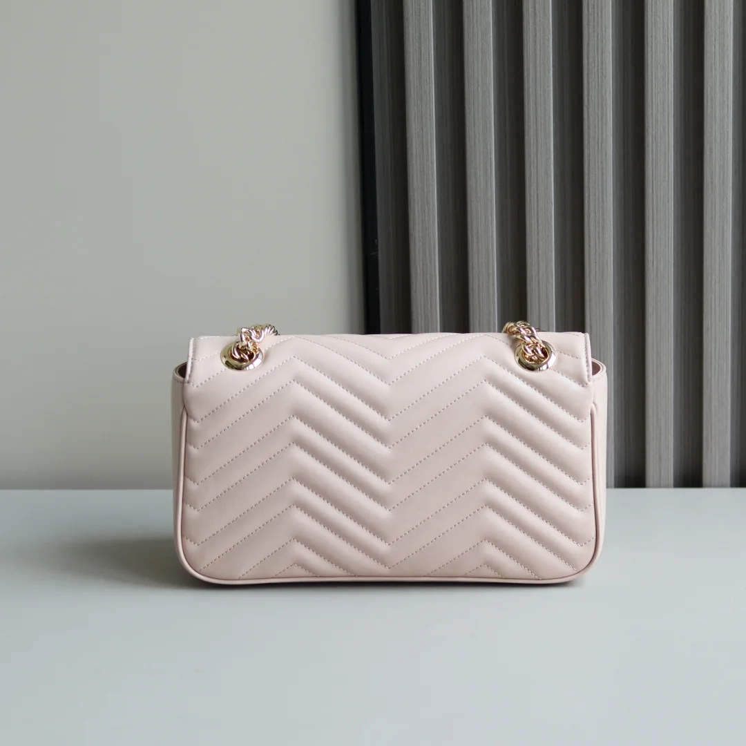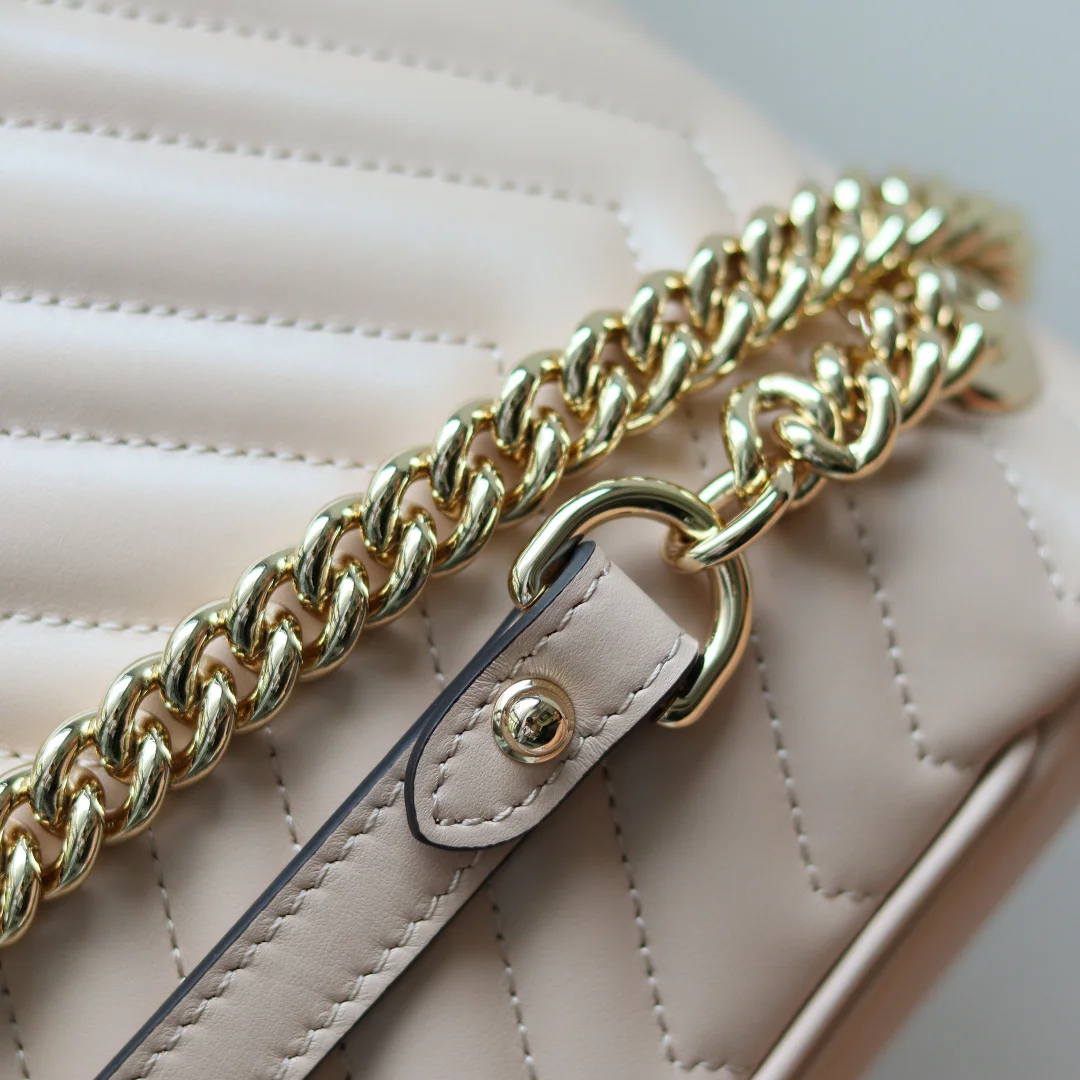 原厂皮 新品 GG Marmont系列绗缝迷你手袋 这款GG Marmont系列迷你手袋采用高辨识度造型 中性浅米色绗缝V型皮革材质 包身略显挺括 翻盖开合设计 配有双G配件 最大可容纳 iPhone Pro Max/Plus Airpods耳机 小包和唇膏