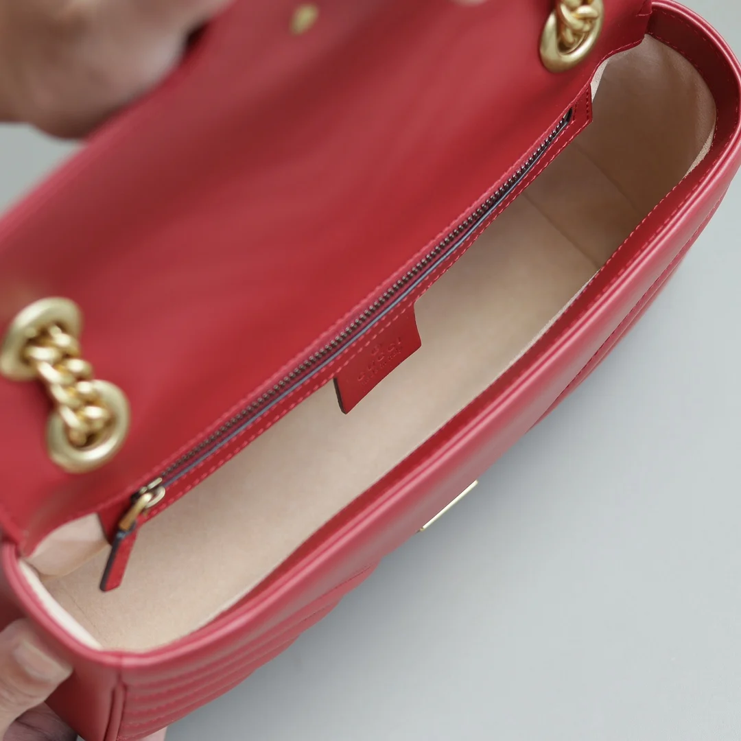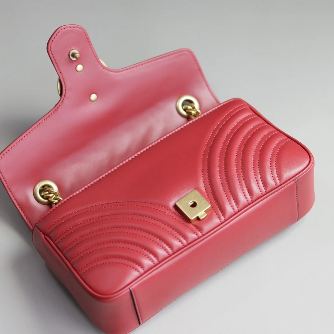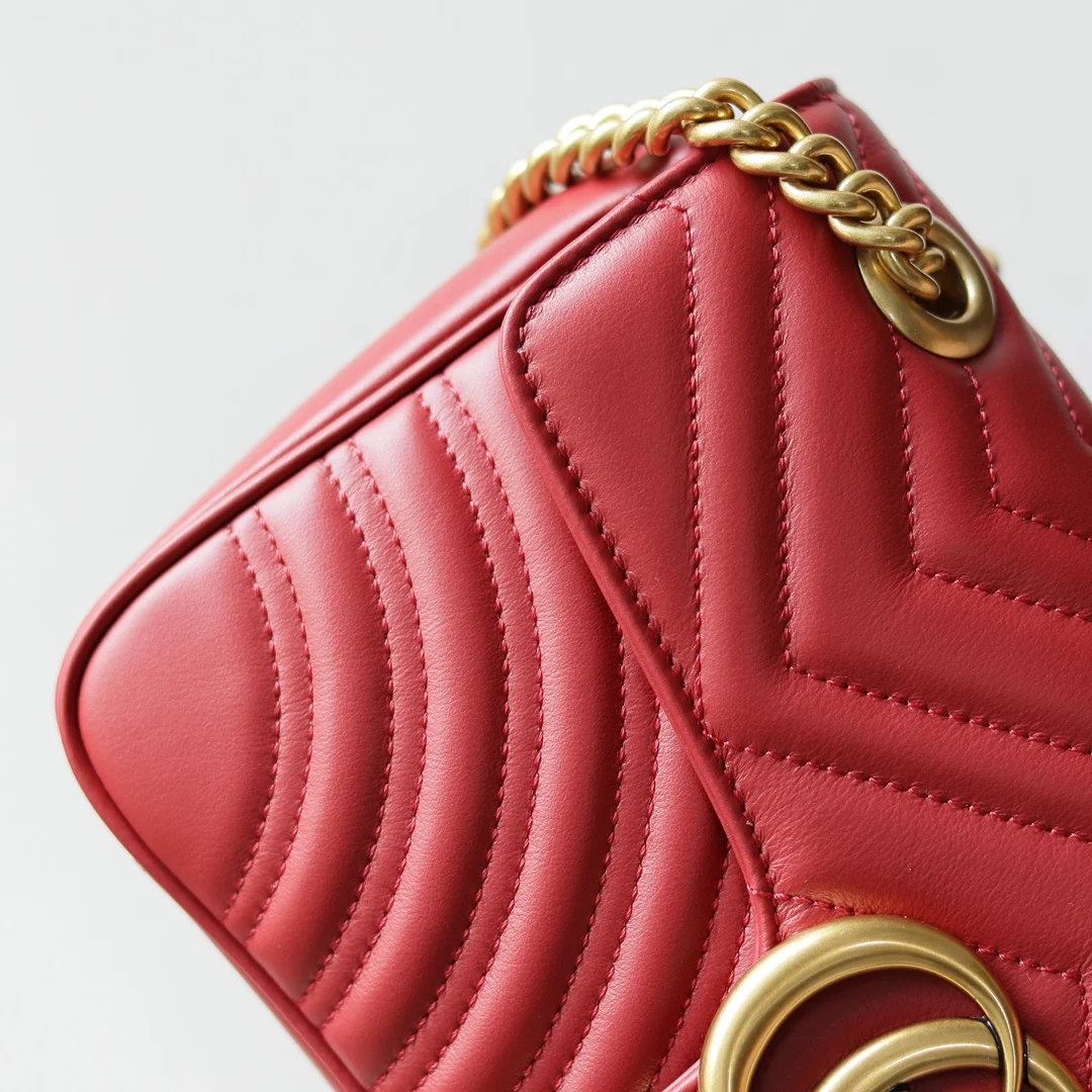 (原厂皮)全新升级版 GG Marmont 波浪纹链条包 进口小牛皮手感极其柔软, 进口高定赤色古铜五金. 有质感有份量. 款号 443497大红 尺寸 26x15x7cm 原单品质.完全正品: