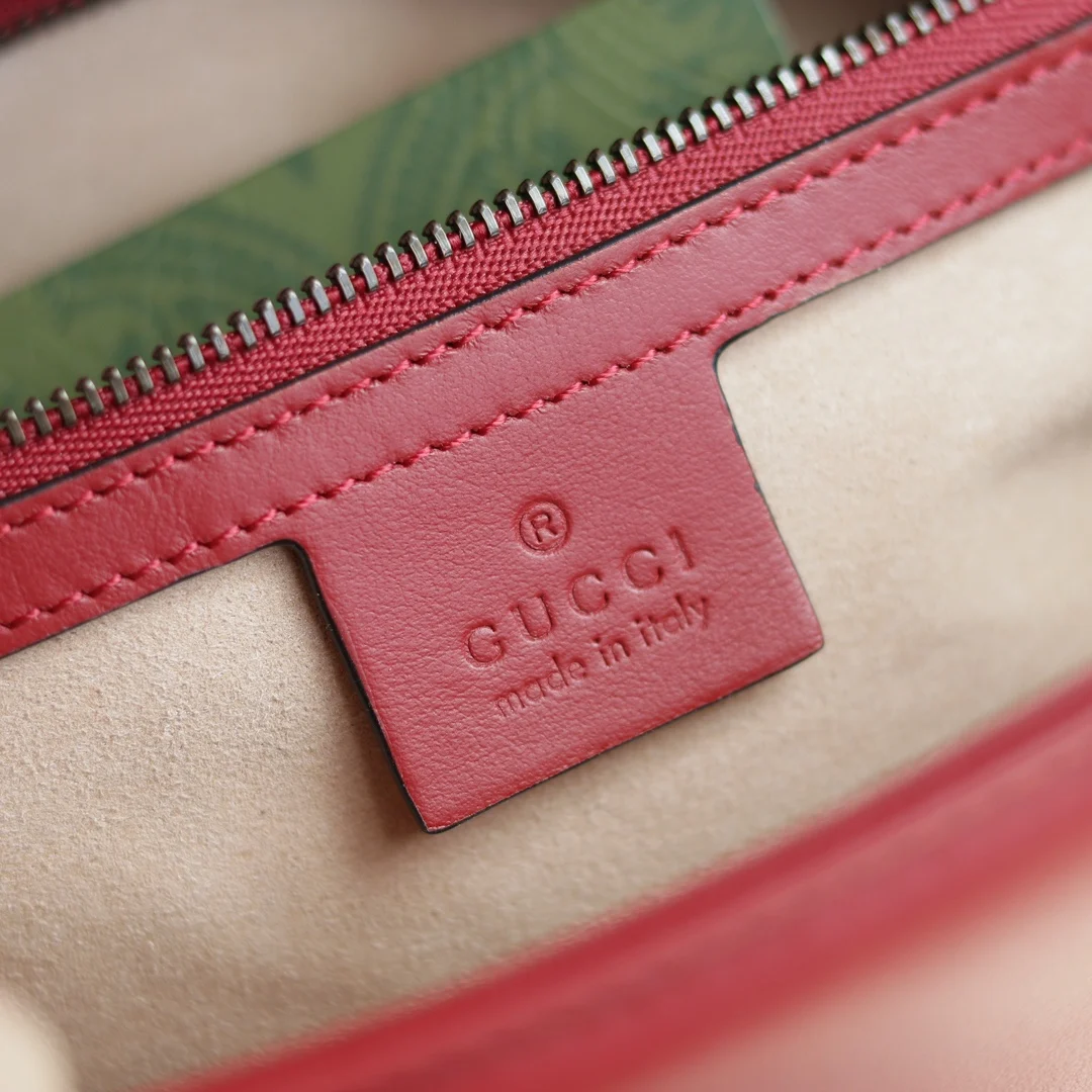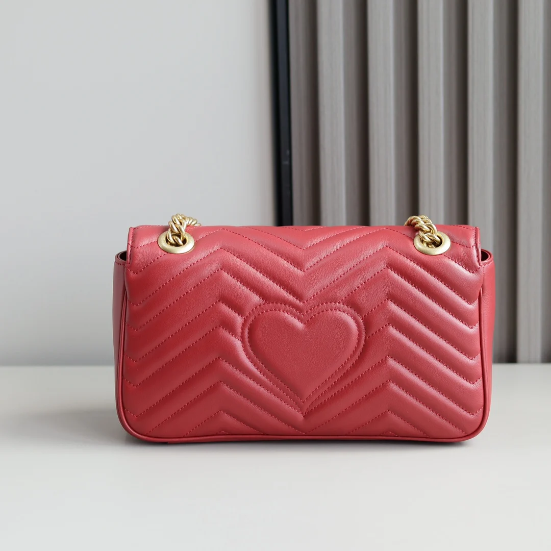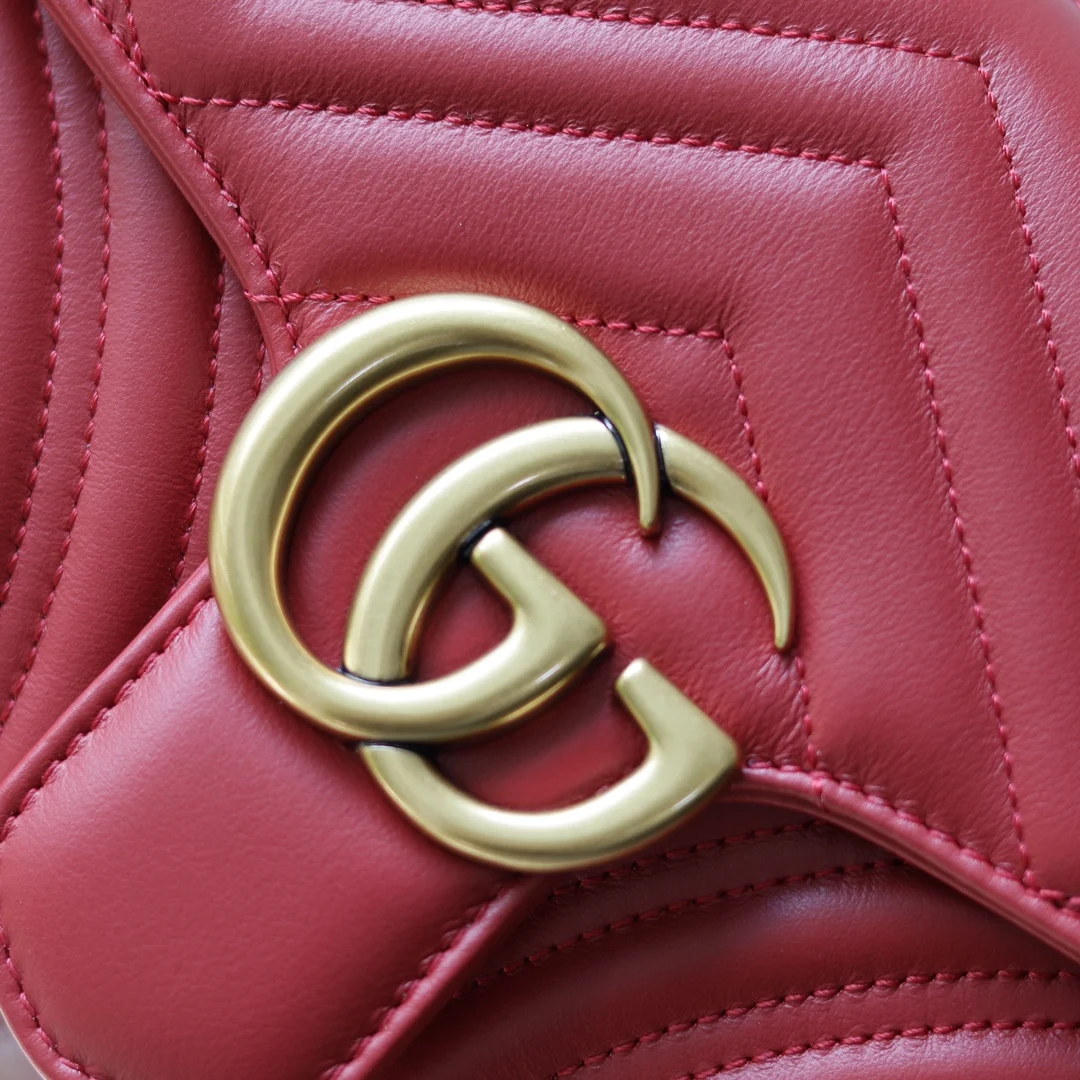 (原厂皮)全新升级版 GG Marmont 波浪纹链条包 进口小牛皮手感极其柔软, 进口高定赤色古铜五金. 有质感有份量. 款号 443497大红 尺寸 26x15x7cm 原单品质.完全正品: