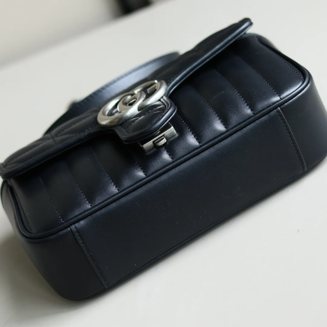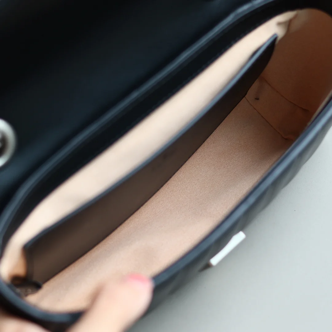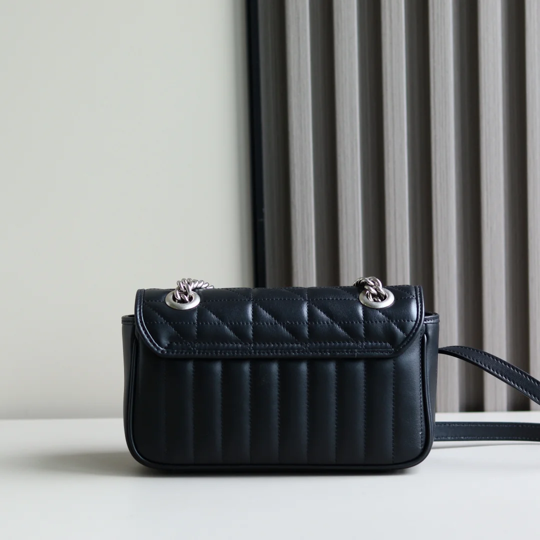 GG Silver marmont Aria-时尚咏叹调 系列不断大胆探索品牌的经典符号素 作为古驰宠儿精选手袋的一员 GGMarmont系列以其标志性的绗缝皮革和双G字母交织配件而备受推崇 在这款迷你肩背包上 经典材质融入竖版和斜纹图案 打造别具风情的几何风格设计 尺寸22*13*6cm型号446744