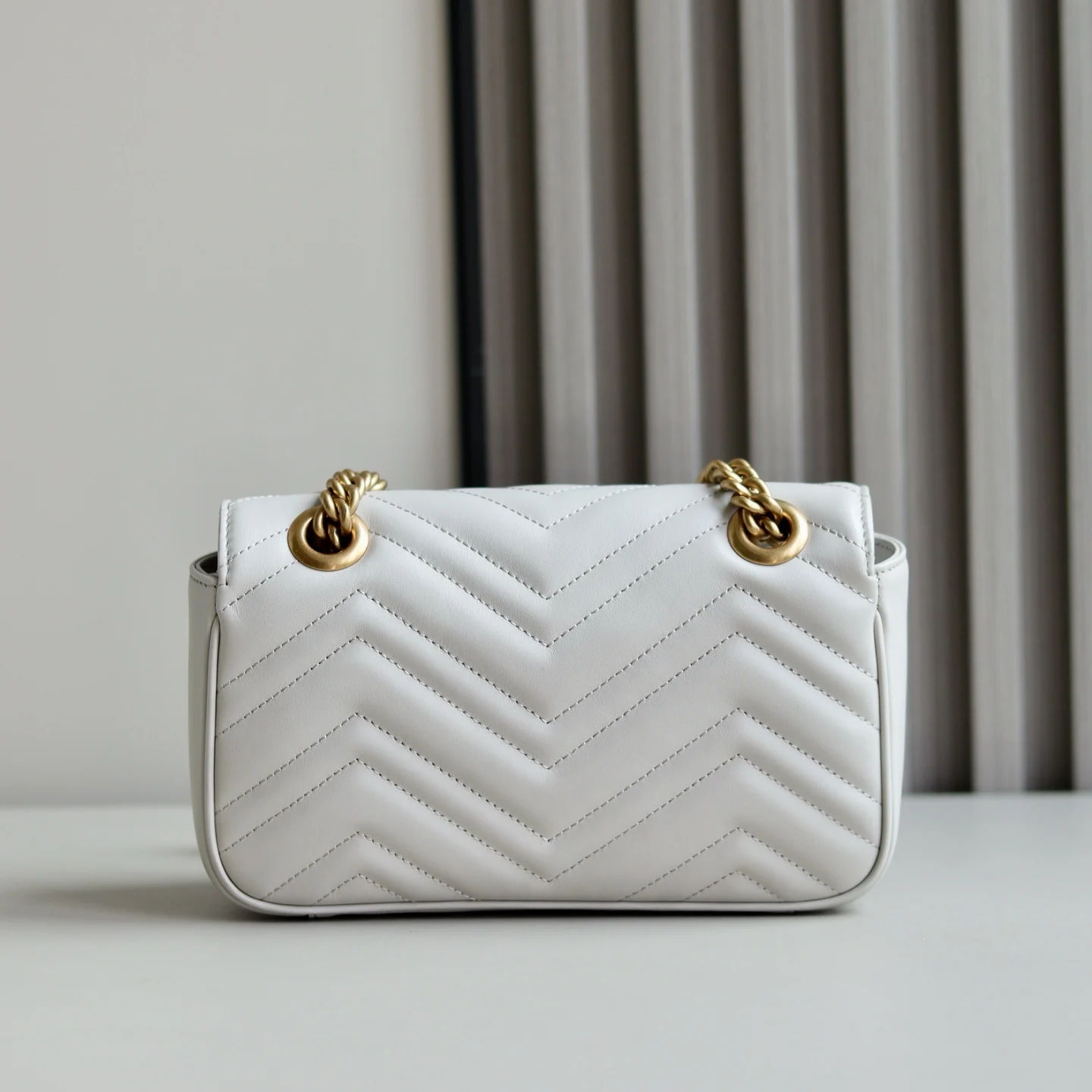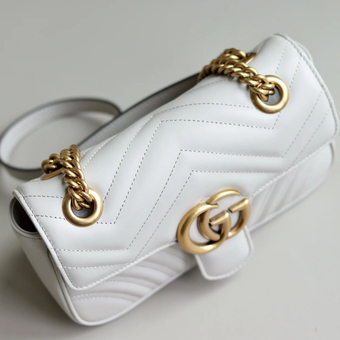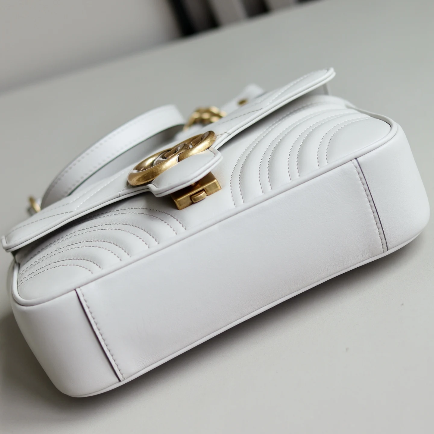 原厂皮 新品 GG Marmont系列绗缝迷你手袋 这款GG Marmont系列迷你手袋采用高辨识度造型 中性浅米色绗缝V型皮革材质 包身略显挺括 翻盖开合设计 配有双G配件 最大可容纳 iPhone Pro Max/Plus Airpods耳机 小钱包和唇膏