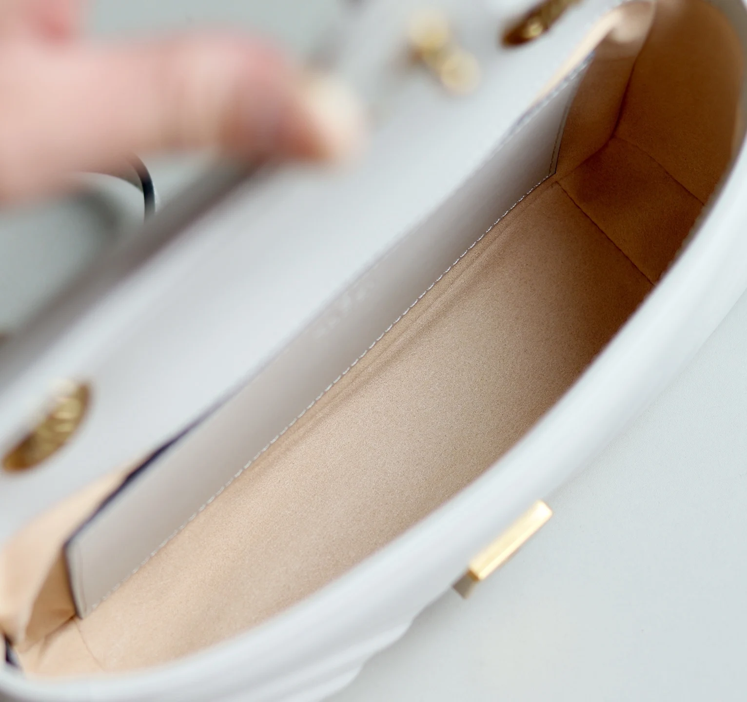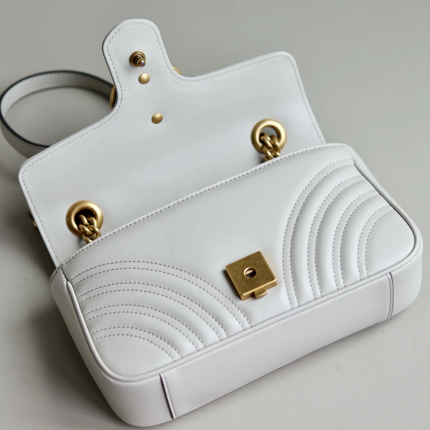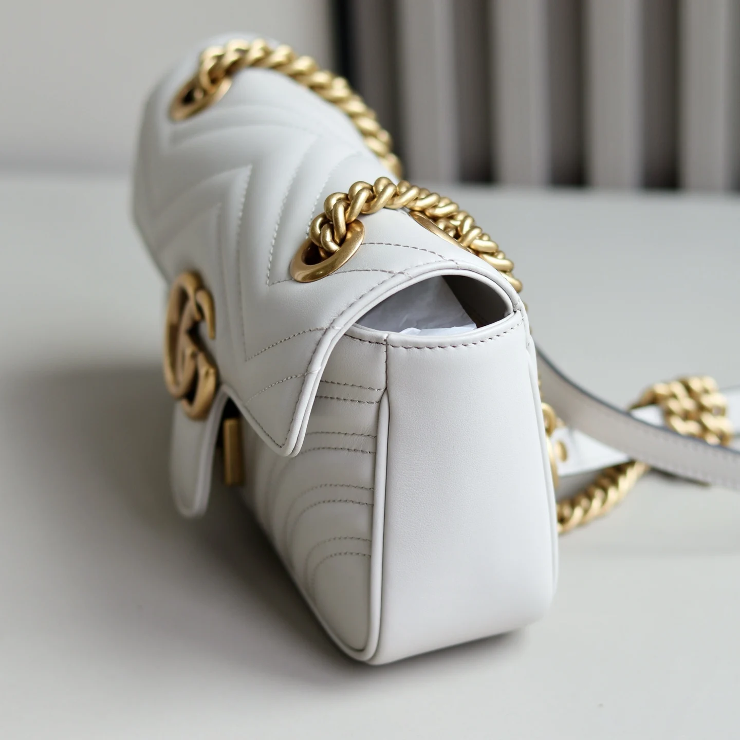 原厂皮 新品 GG Marmont系列绗缝迷你手袋 这款GG Marmont系列迷你手袋采用高辨识度造型 中性浅米色绗缝V型皮革材质 包身略显挺括 翻盖开合设计 配有双G配件 最大可容纳 iPhone Pro Max/Plus Airpods耳机 小钱包和唇膏