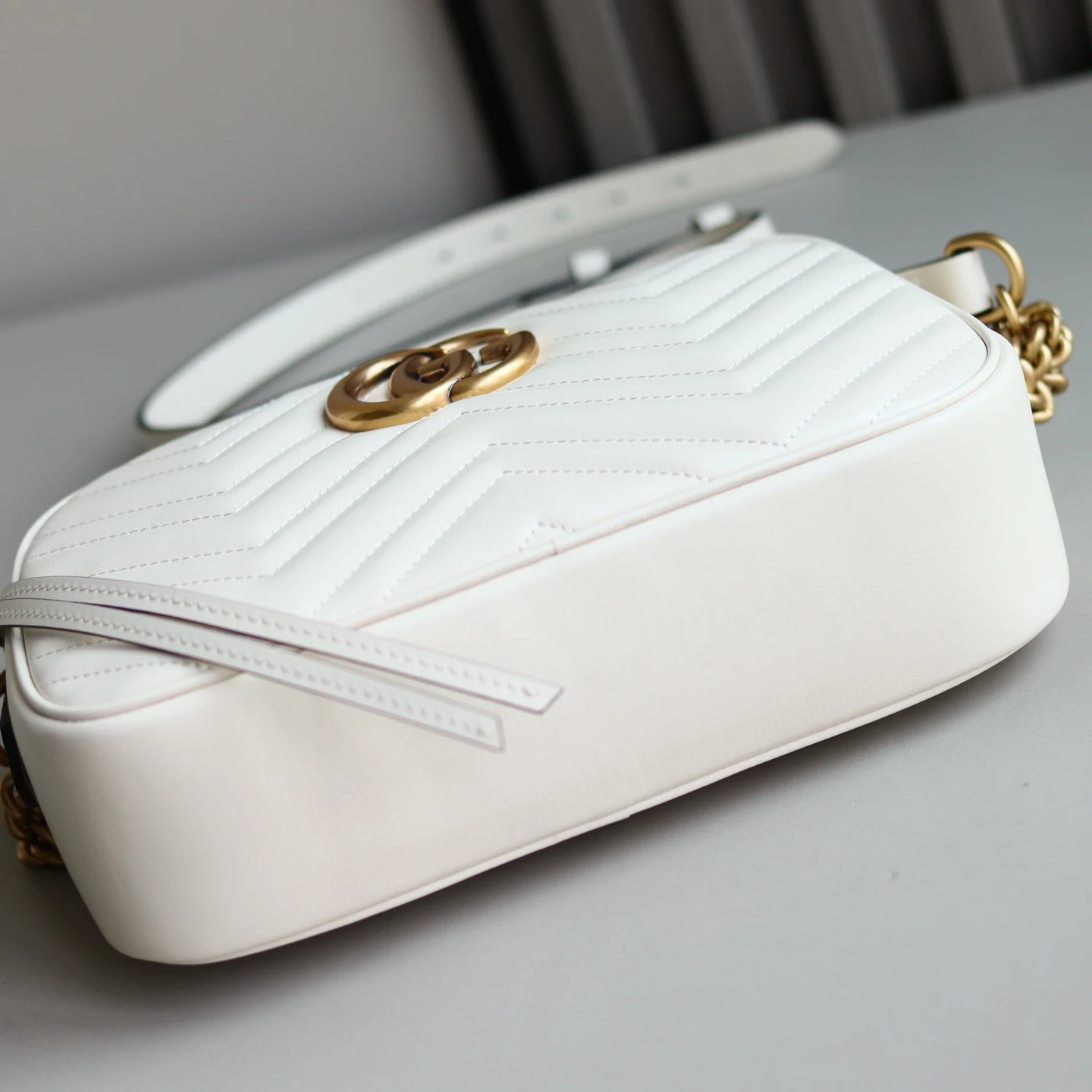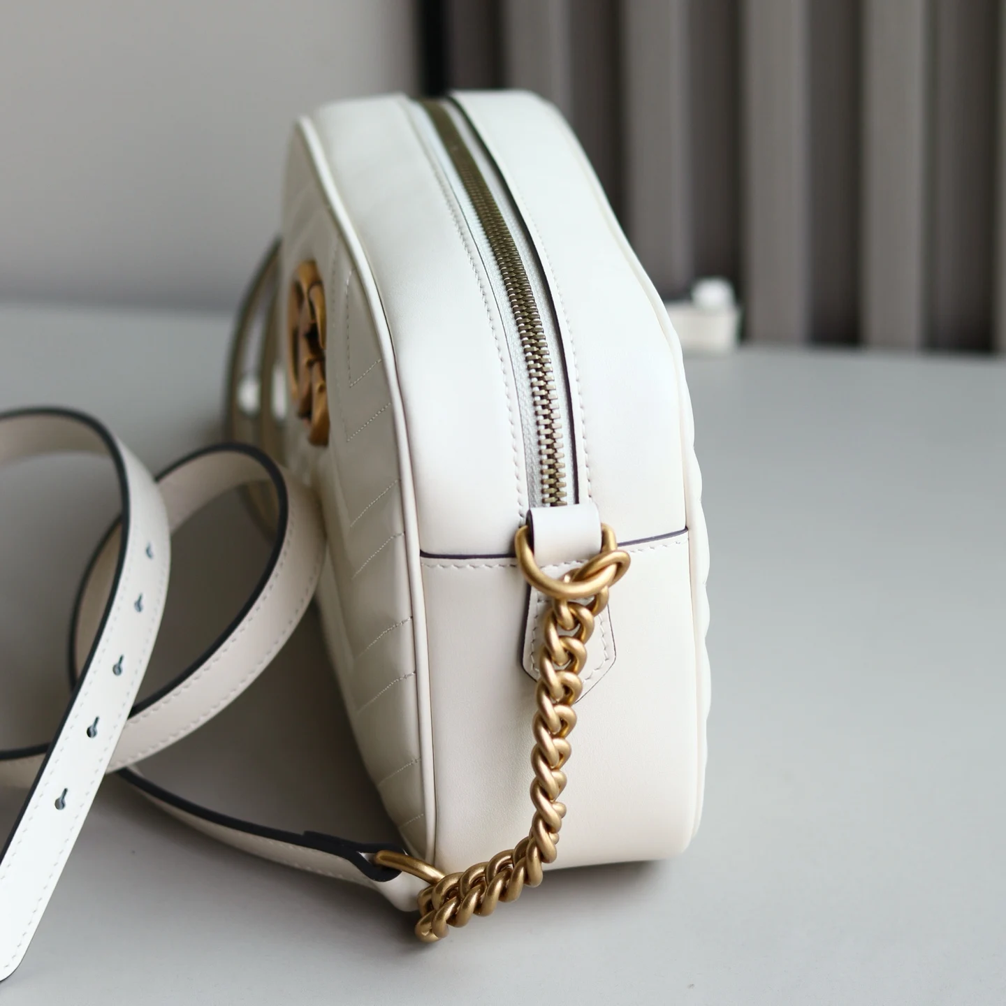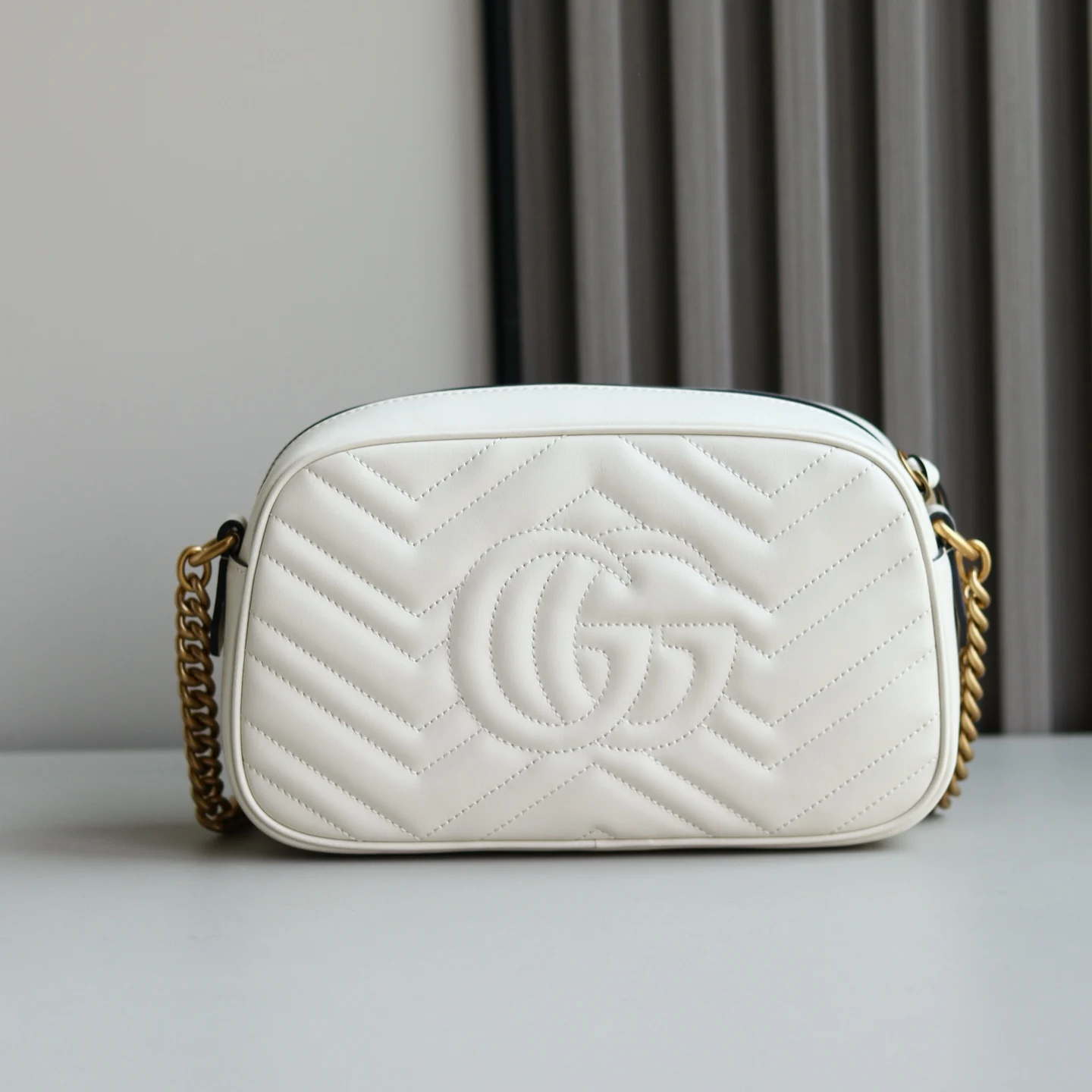 原厂皮 GG Marmont原厂系列 优雅精巧的设计可是俘获了不少少女的芳心 也是全球达人必备的百搭单品 型号 447632 尺寸 24 x 13 x 7cm 颜色:米白