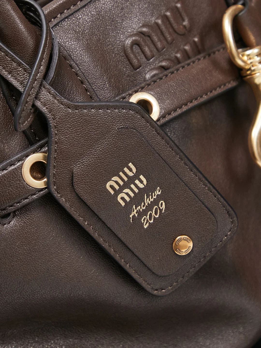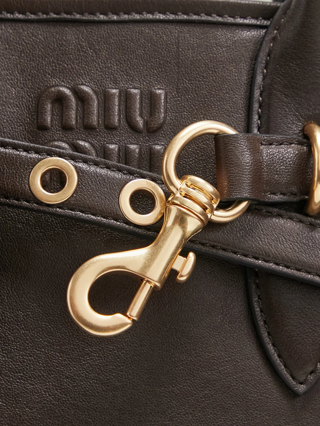 Aventure包袋展现出简约随性的魅力 重新诠释经典线条 这款柔软的Nappa变体展现出多功能和实用的态度 并通过精致独特的细节得到提升 aventure nappa皮革手袋灵感源自miu典藏设计 结构经过调整 变得更加轻便 焕发全新个性 饰以压花字母徽标 增添标志性素 复古金色五金配件 亚麻混纺衬里 配拉链口袋和贴袋 长手腕适合用作手提或单肩