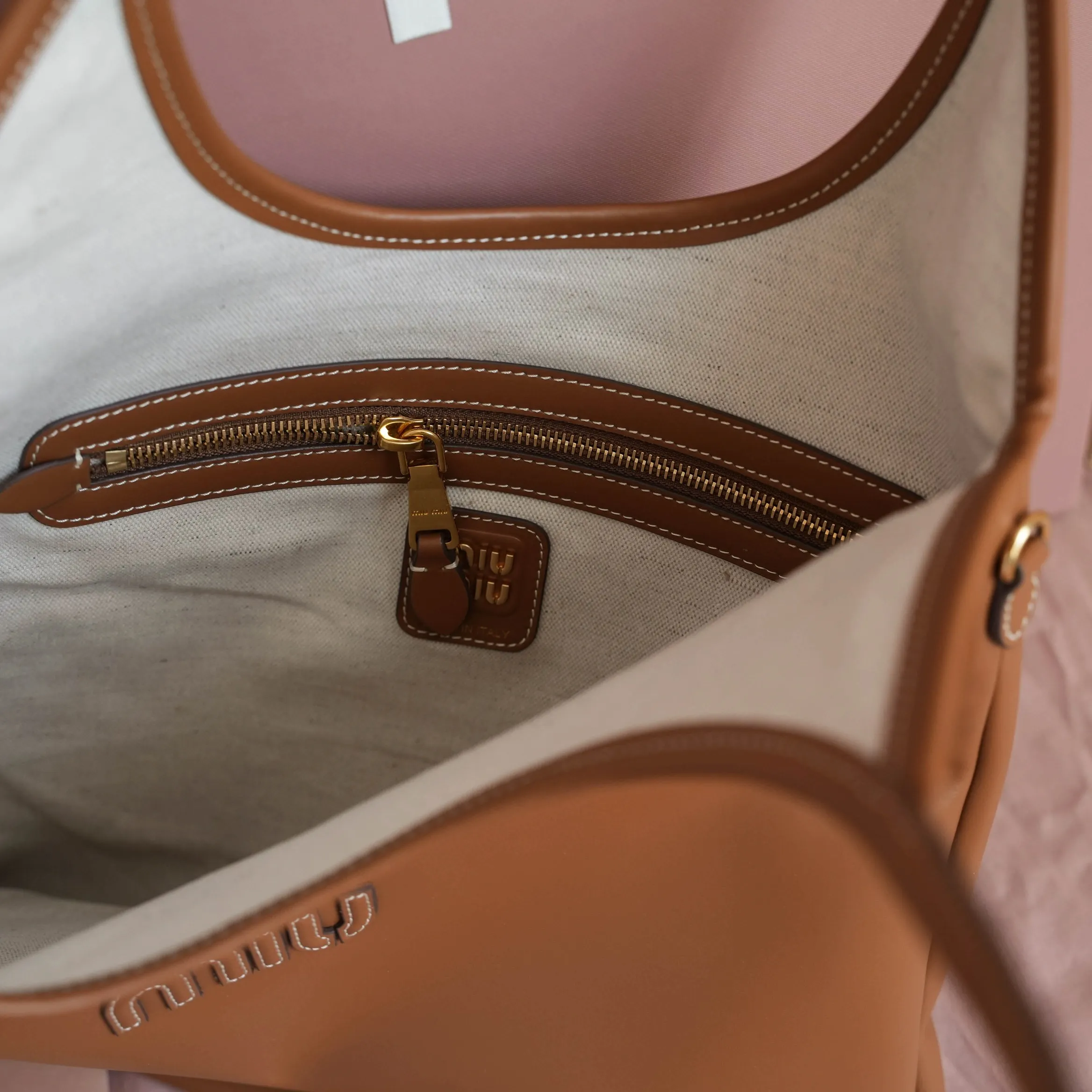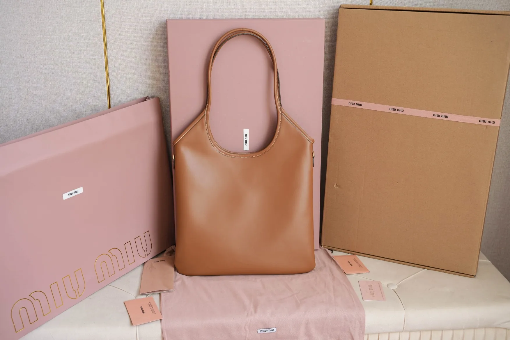 5BG231 Miu家新款伊势丹限定托特包 官网主推 今年绝对爆款式 顶级进口小牛皮 皮面细腻光滑柔软 质感高级 包身软而不塌 气质随性慵懒 容量超大 日常出街背它回头率百分百 手工缝制皮面Logo标志 内里全新麻布里 配拉链式口袋 尺寸35 X 40Cm