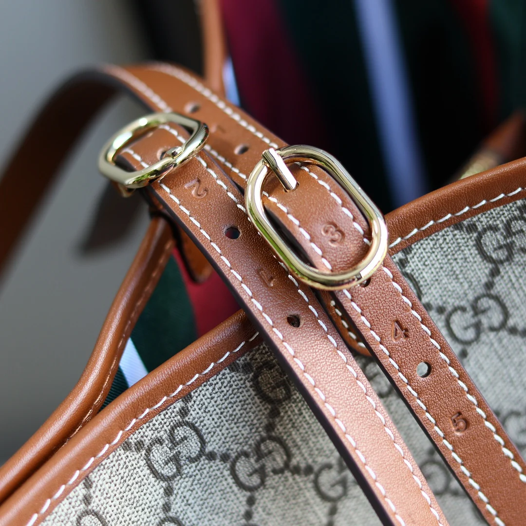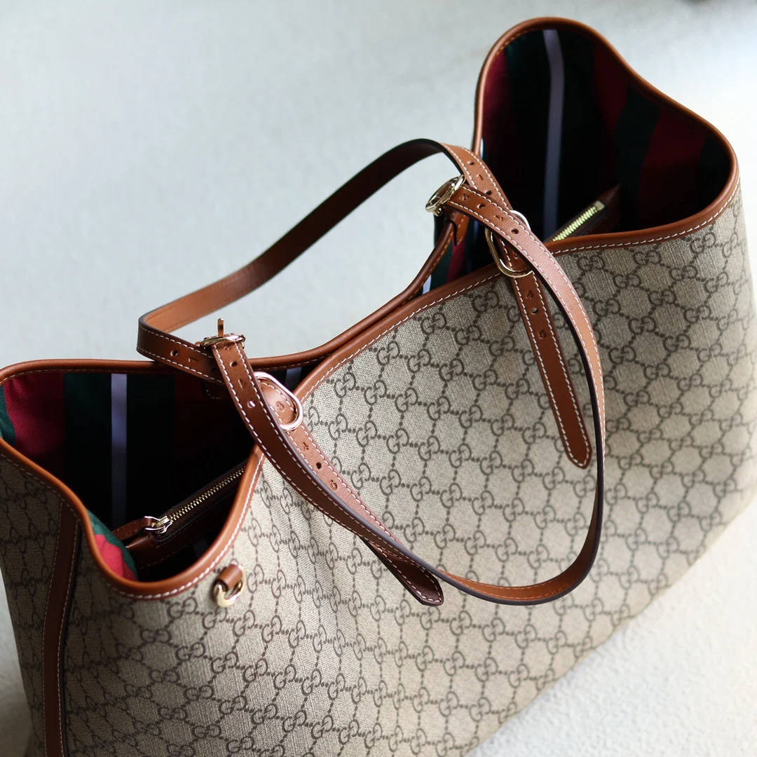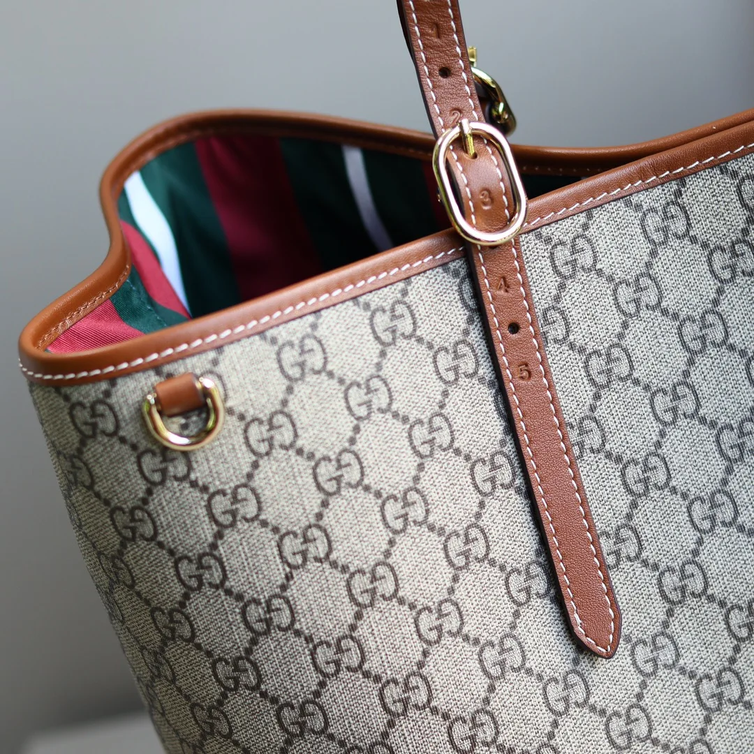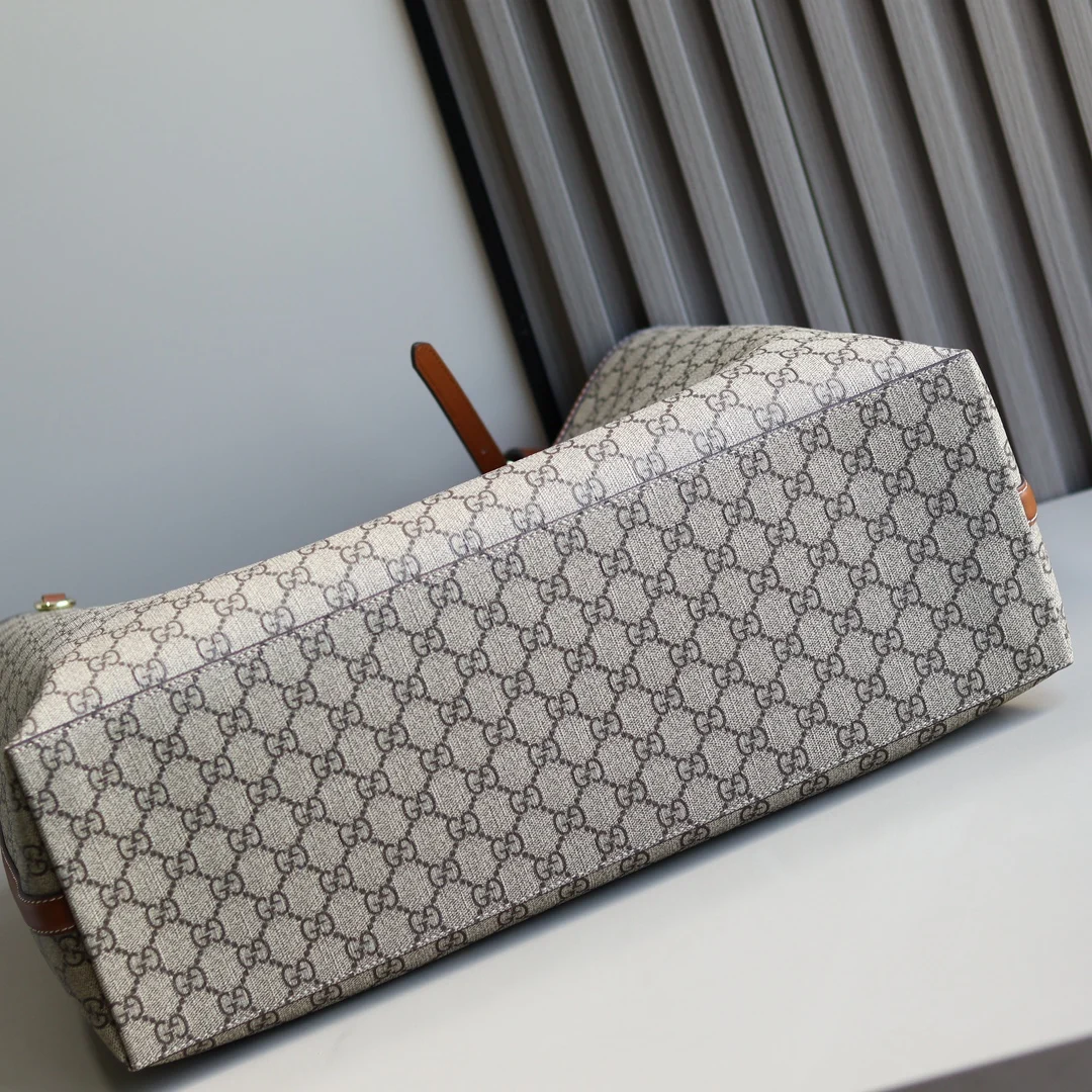 全新GG Emblem系列焕新诠释品牌的隽永优雅风范和精湛工艺 这款大号托特包配有可调节提手 饰以示数孔眼 灵感源自马术世界 型号 815212