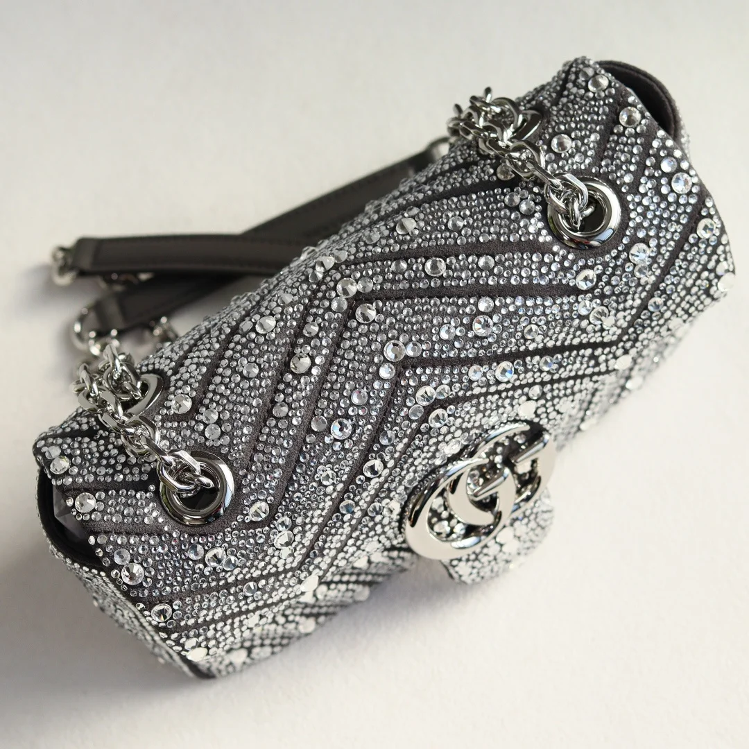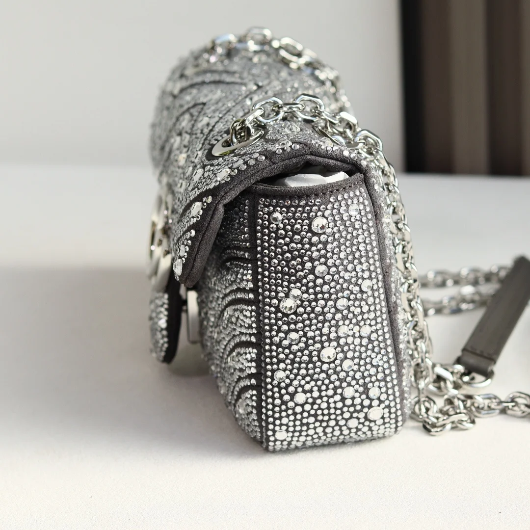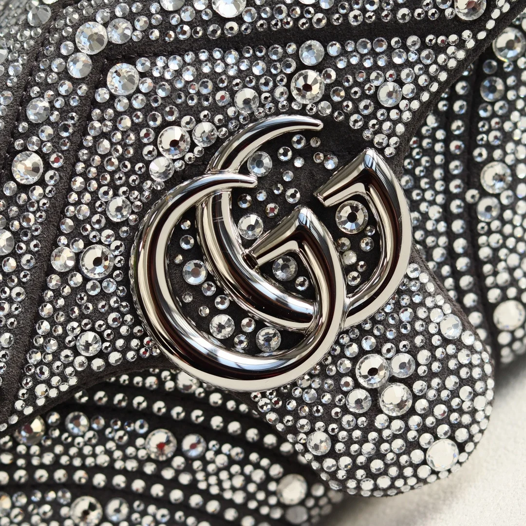 Gucci Marmont马蒙亮钻款双G鎏金与晶光的永恒邂逅马蒙系列复古底蕴 标志性双G徽章之上 满铺手工甄选的璀璨亮钻 在光线下折射出流动星河般的夺目光彩 型号 837280 尺寸 22-125-6cm