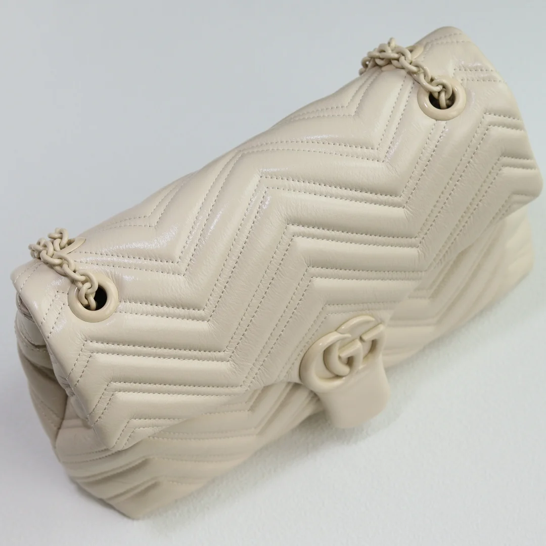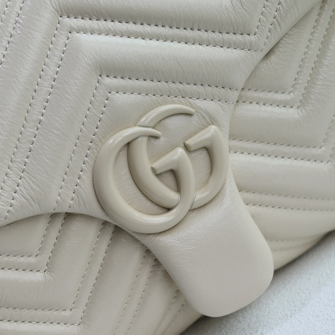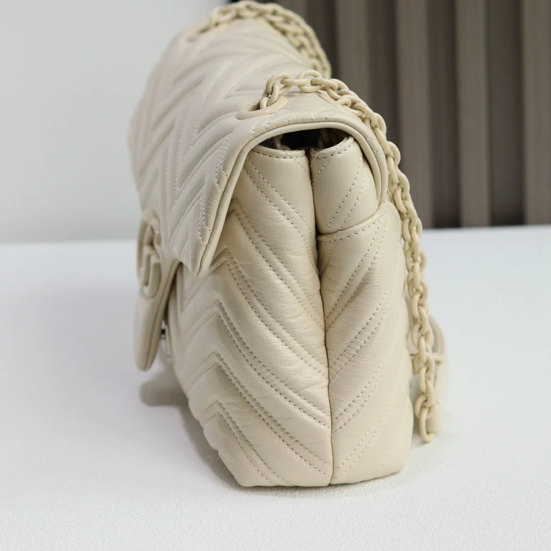 品牌标志性GG Marmont系列大号匠心融蕴经典双G元素和切面链式包带 缔就柔软不失挺括的廓形设计 这款单品采用柔软轻质绗缝V型牛皮革匠造而成 搭配同色调珐琅配件与链条