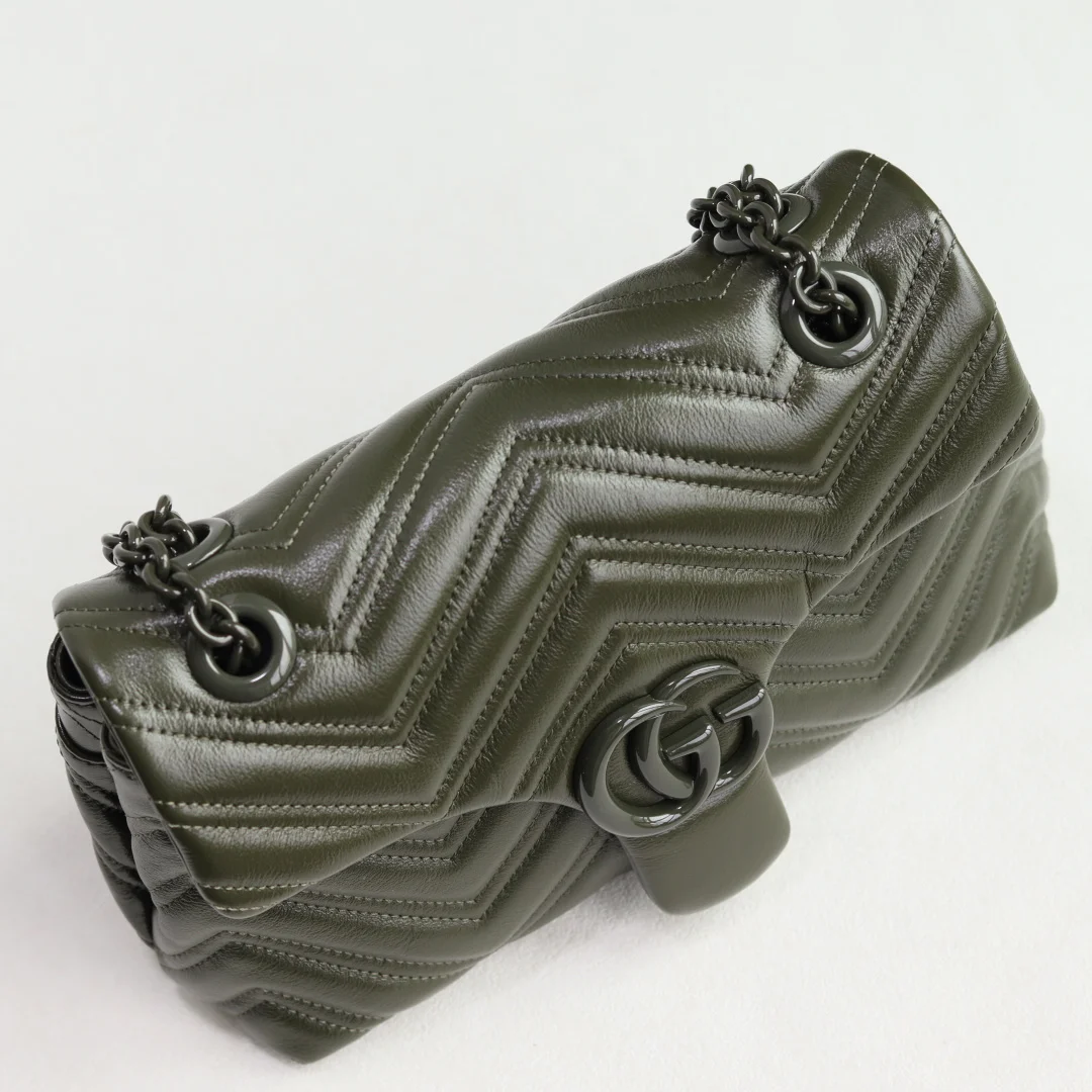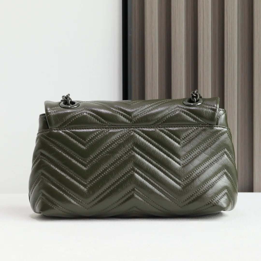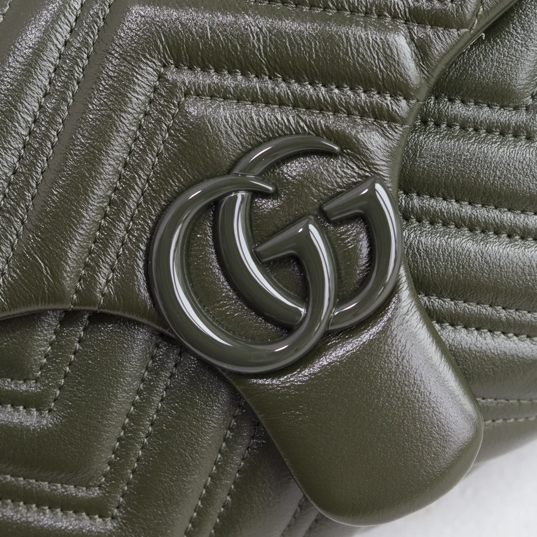 这款品牌经典GG Marmont系列手袋 选用极为柔软的牛皮革匠心打造 缀饰双G造型配件 搭配立体多面的链式肩带 整个包身构造柔软精致