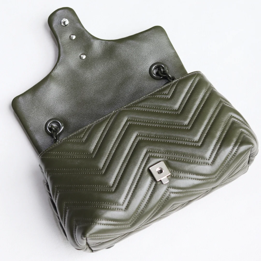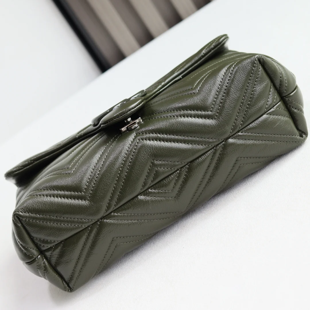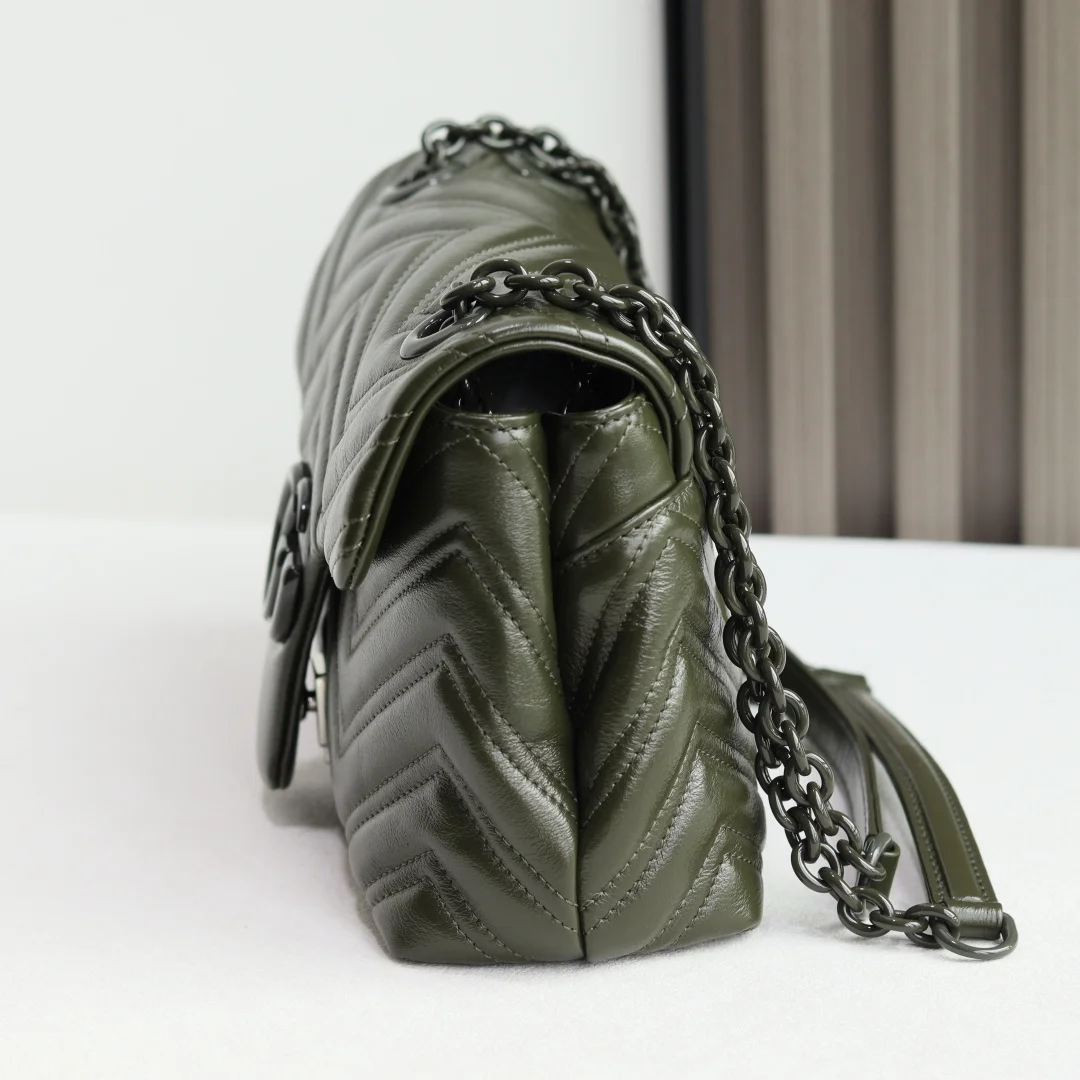这款品牌经典GG Marmont系列手袋 选用极为柔软的牛皮革匠心打造 缀饰双G造型配件 搭配立体多面的链式肩带 整个包身构造柔软精致