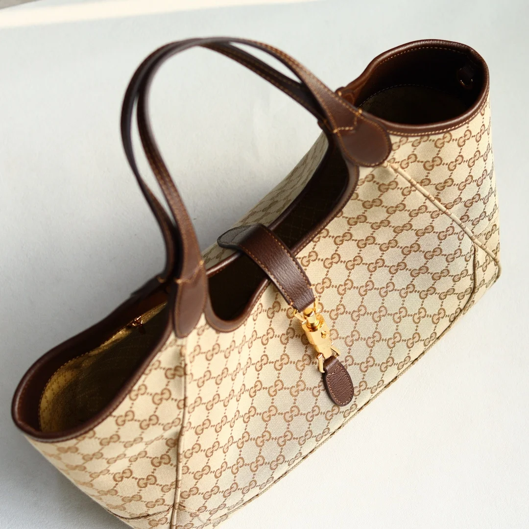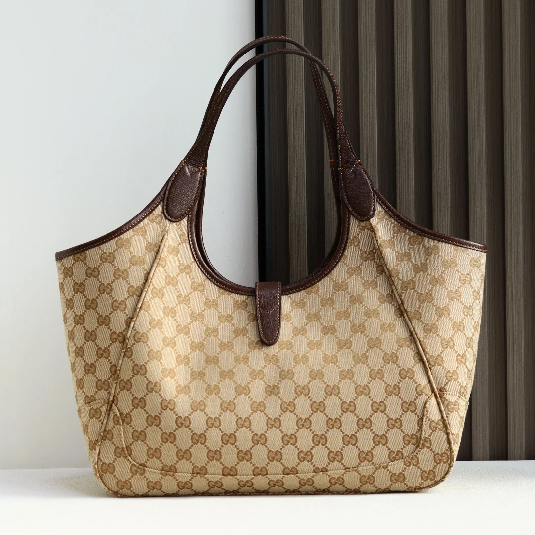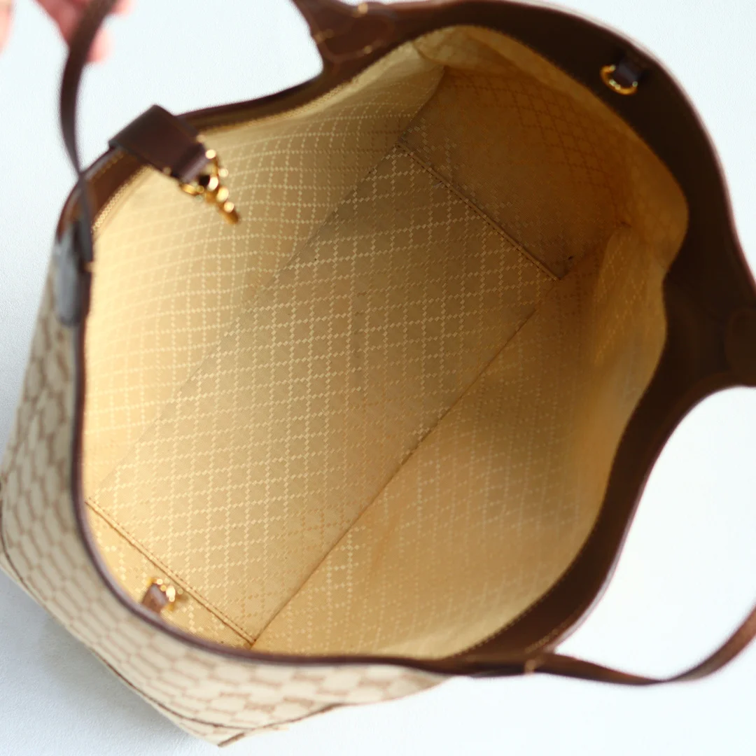 2026春夏系列全新上市 这款全新托特包的设计灵感源自空间宽敞的购物袋和意大利市集的鲜活气息 包身两侧可收紧亦可展开 并配有便捷的推入式锁扣开合 这款托特包甄选轻盈挺括的GG帆布打造 以复古风格沙色配色匠心呈献 源自典藏的钻石菱格纹图案演绎全新衬里 型号 866645 颜色 杏布/棕色