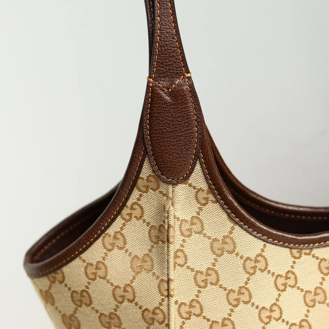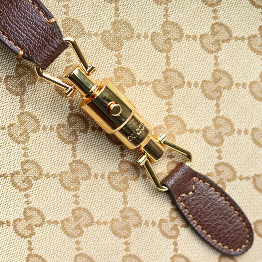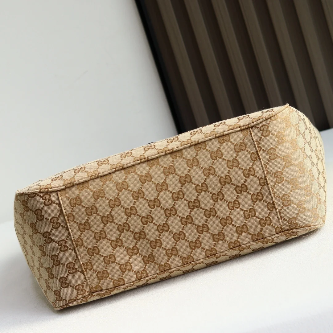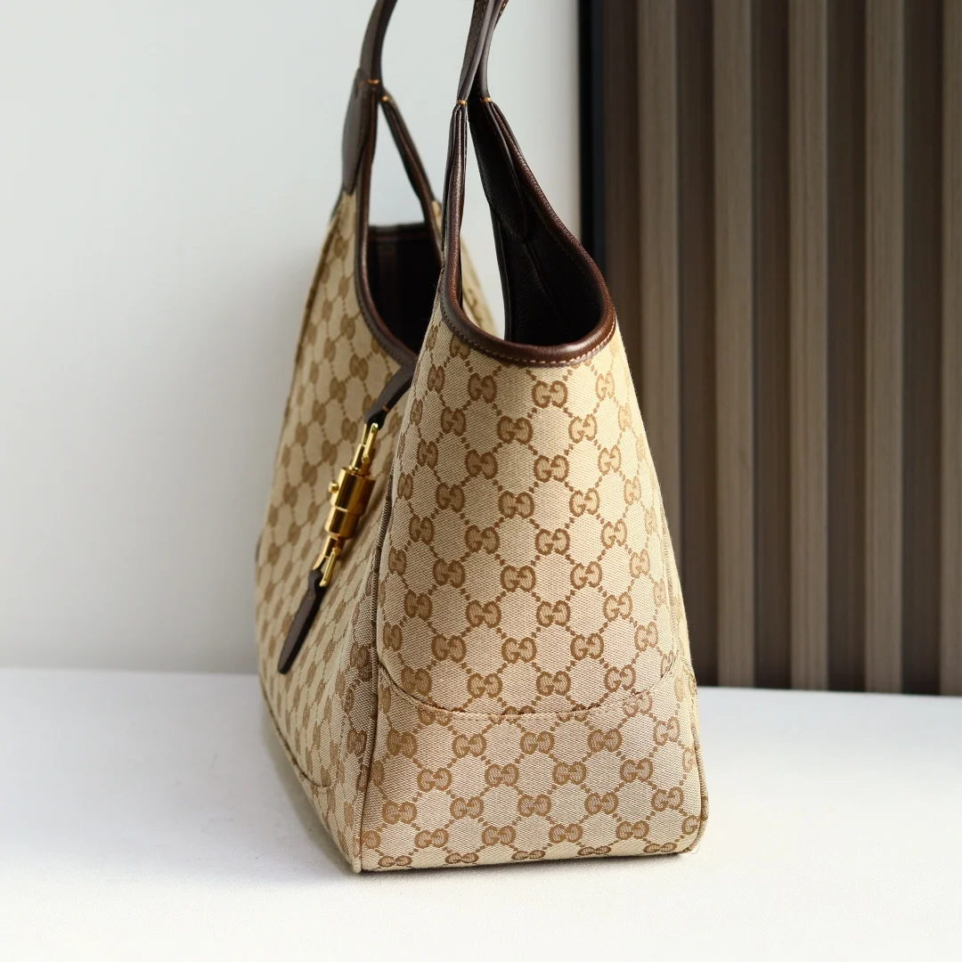 2026春夏系列全新上市 这款全新托特包的设计灵感源自空间宽敞的购物袋和意大利市集的鲜活气息 包身两侧可收紧亦可展开 并配有便捷的推入式锁扣开合 这款托特包甄选轻盈挺括的GG帆布打造 以复古风格沙色配色匠心呈献 源自典藏的钻石菱格纹图案演绎全新衬里 型号 866645 颜色 杏布/棕色