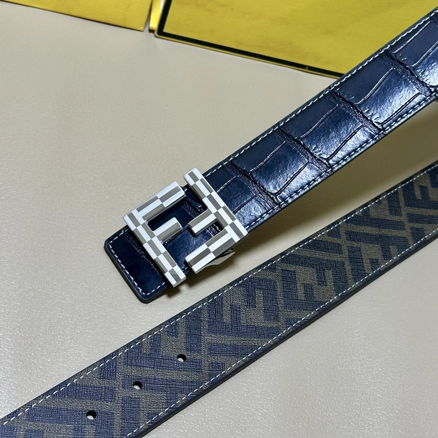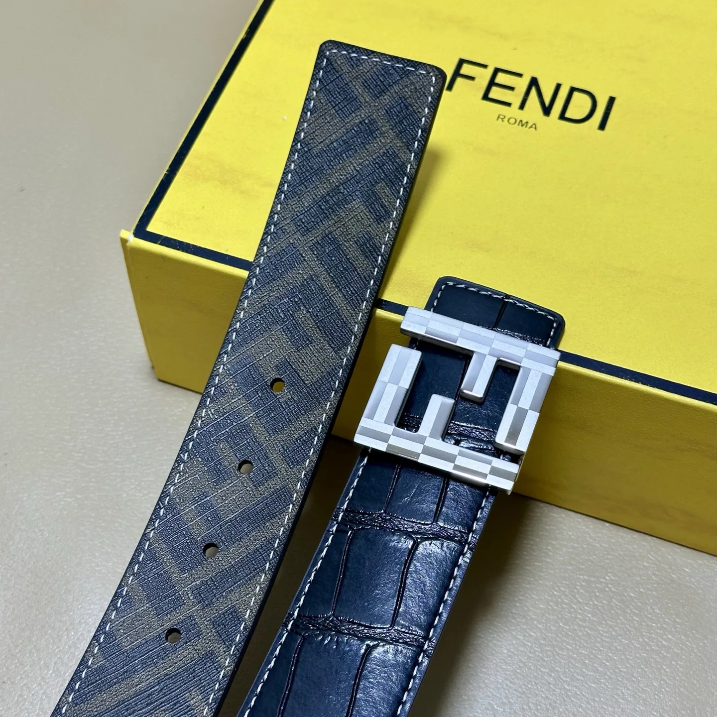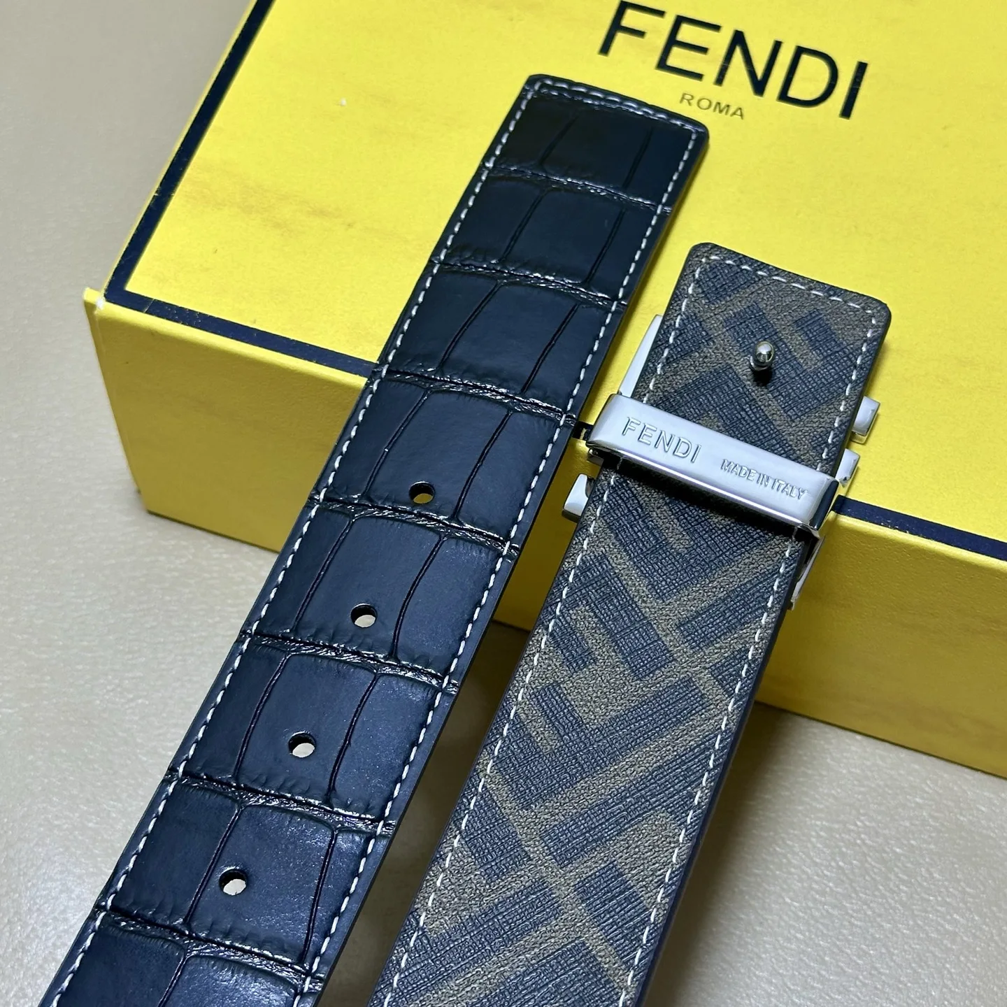 FENDI 芬迪 专柜同款 宽4.0CM 双环正反用腰带 FF按钉搭扣 咖啡色Cuoi Romano皮革材质 反面面料带有烟草黄和黑色FF图案 四方金属饰面 时尚经典 百搭款