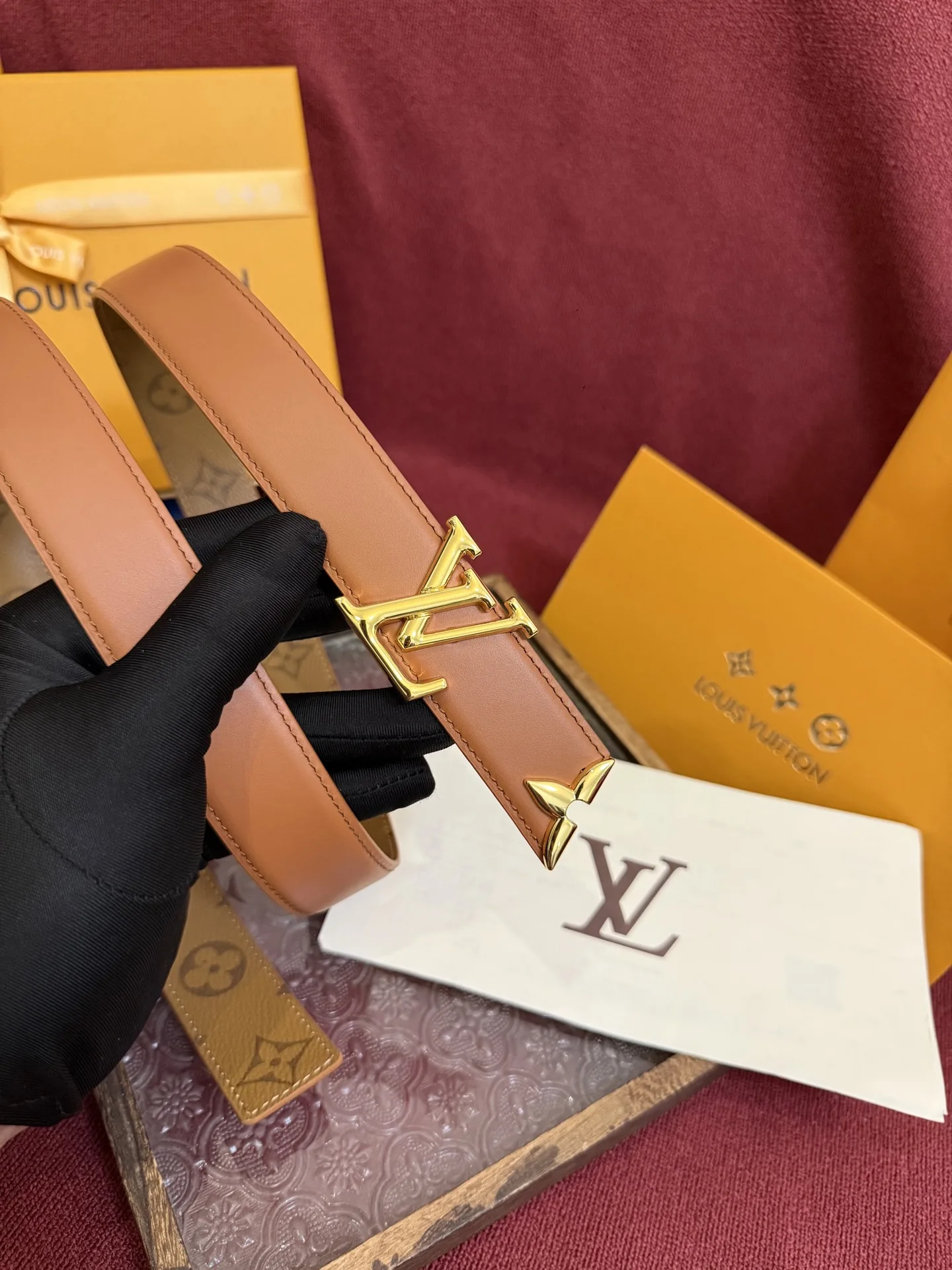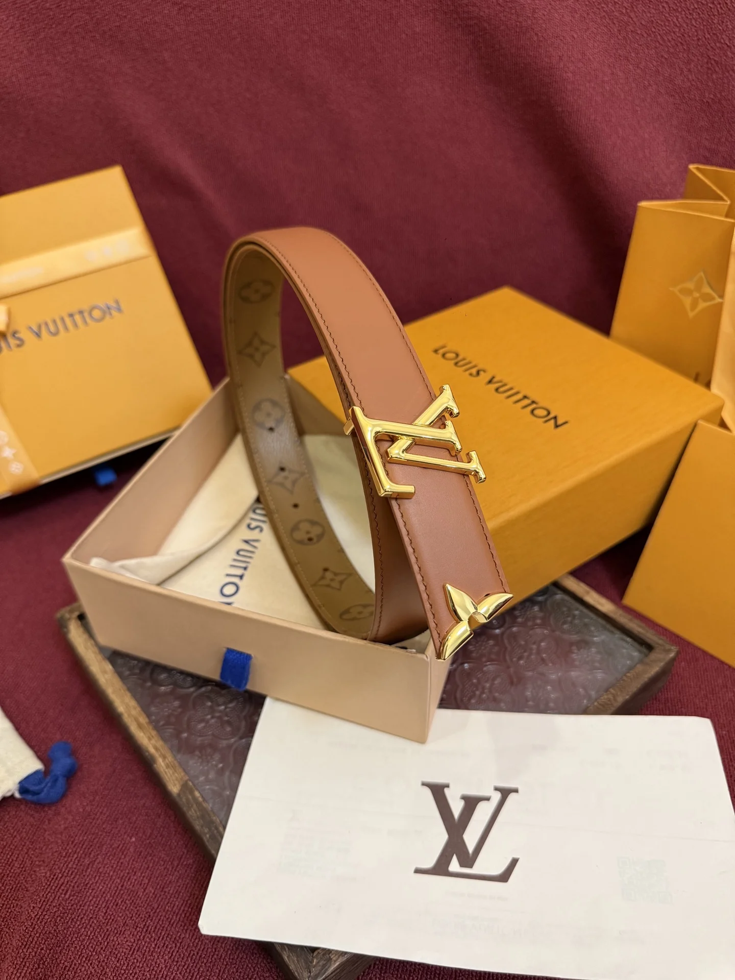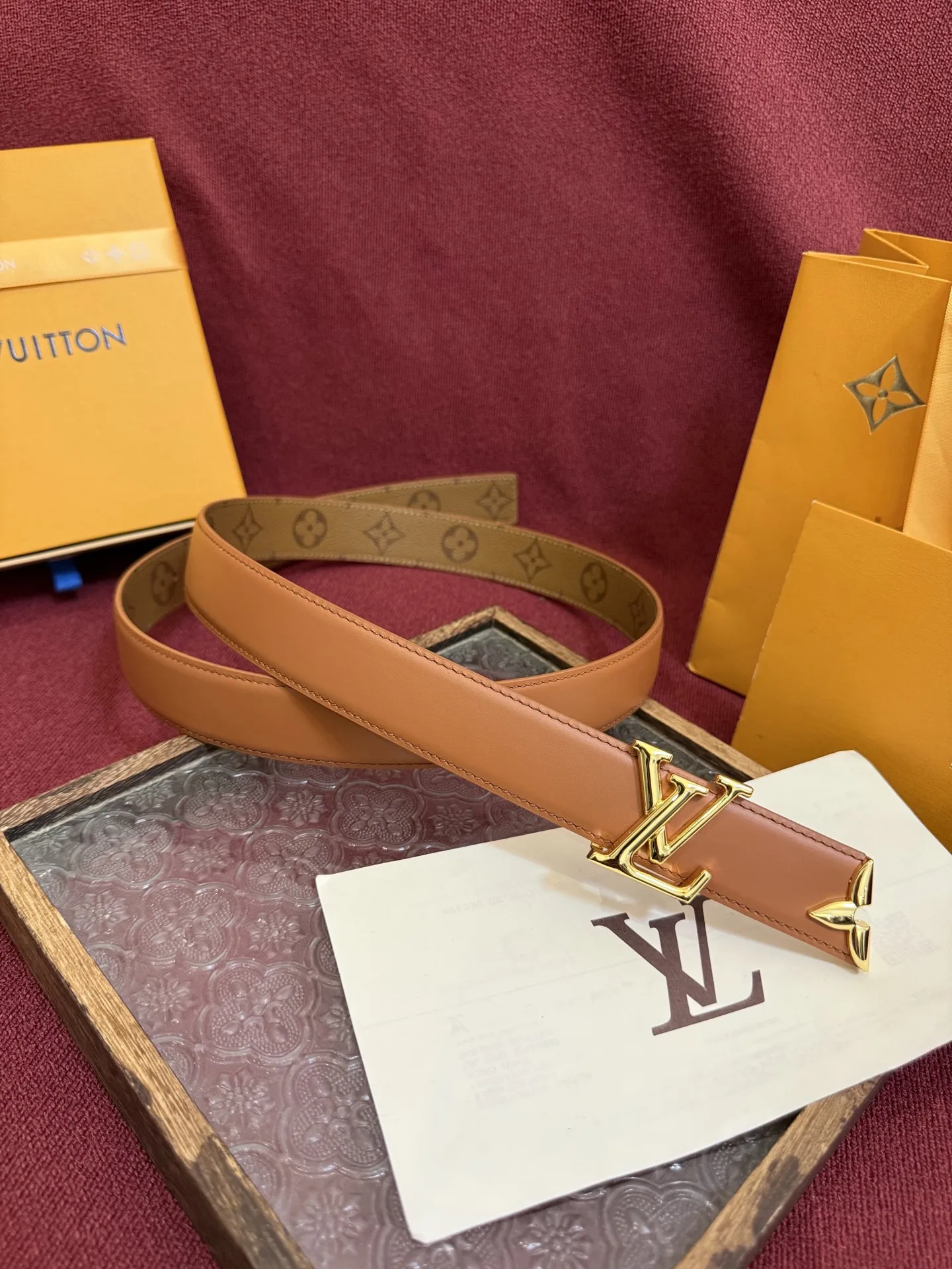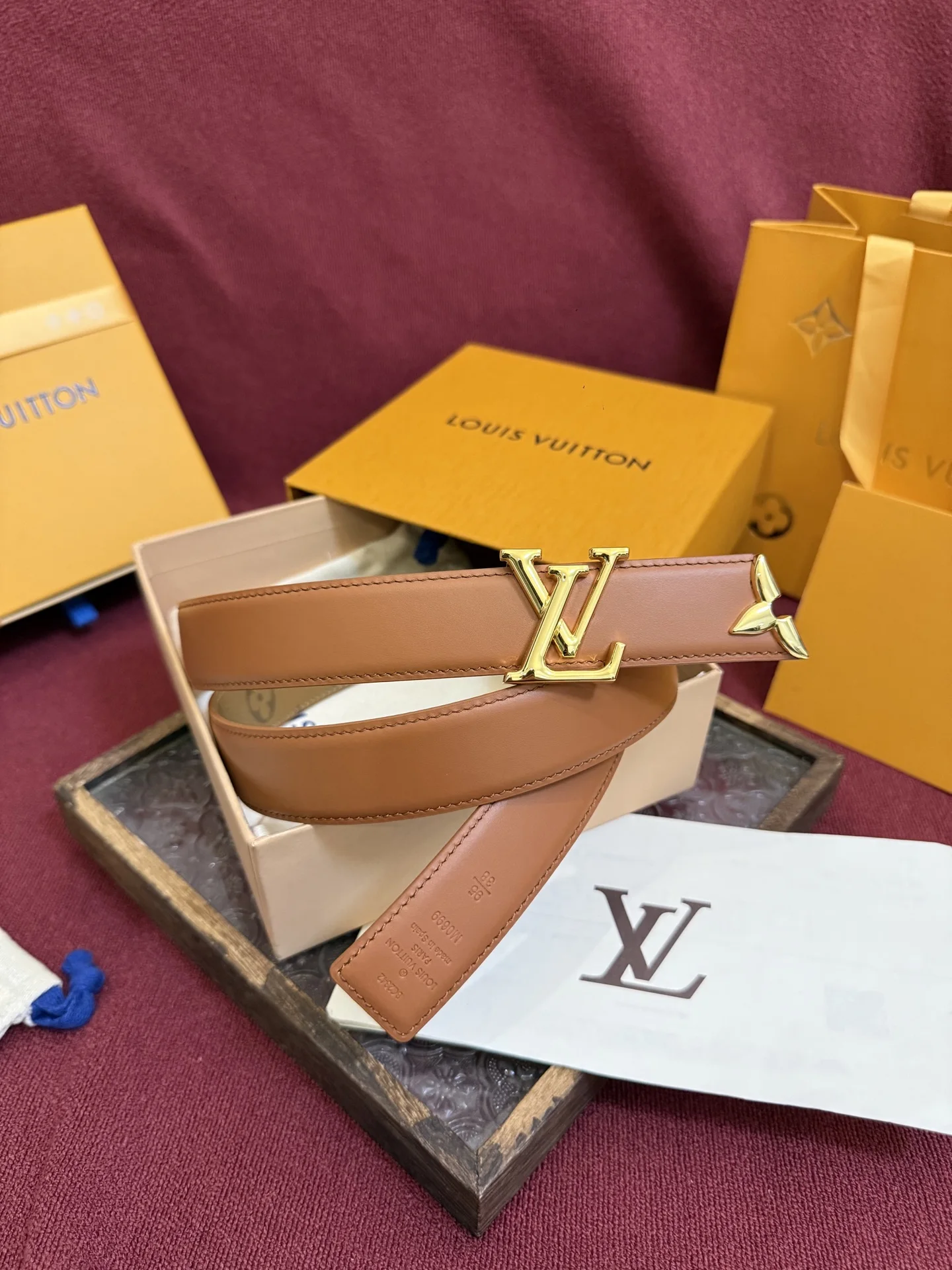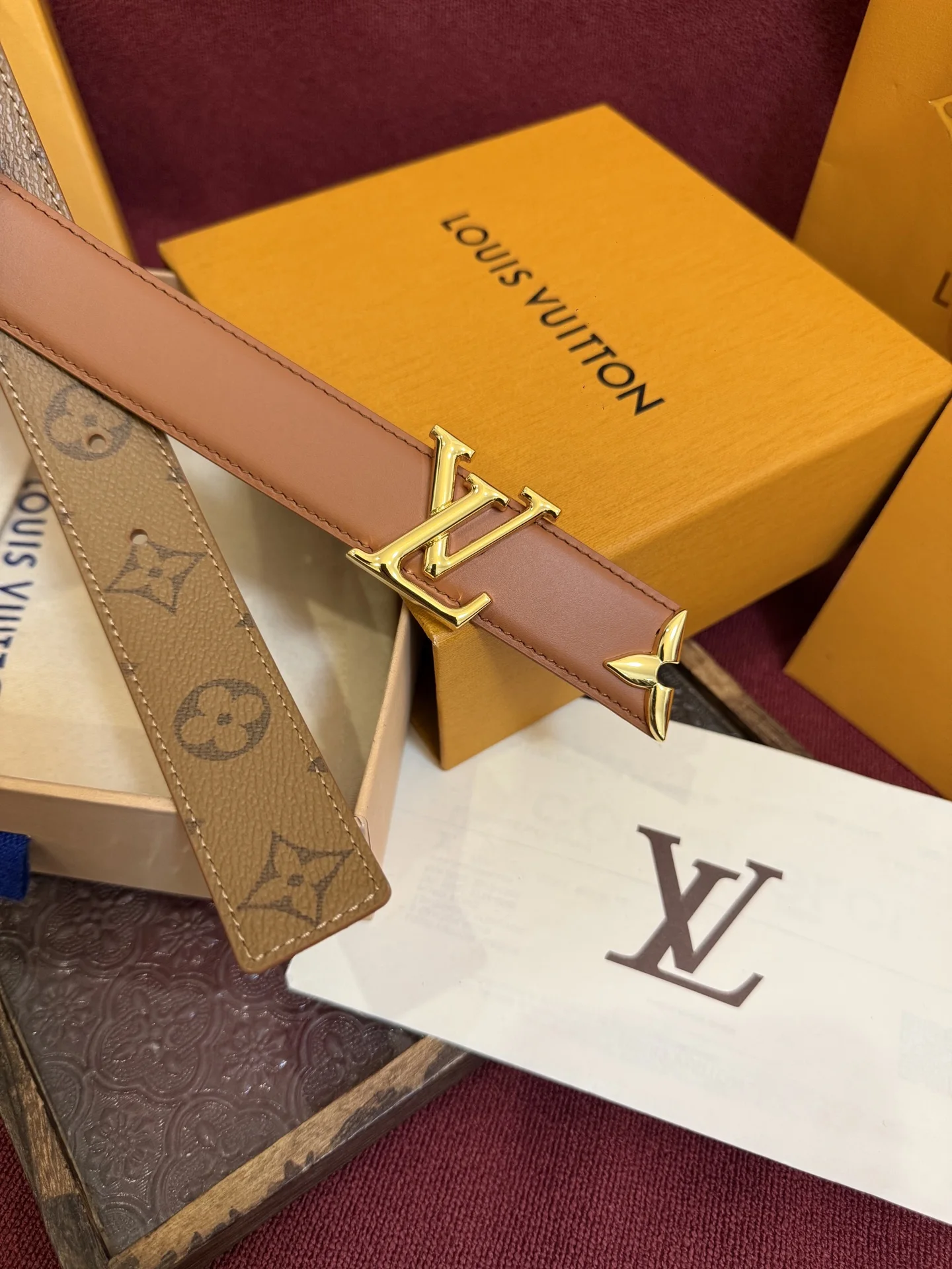 本款 3.0cm Pretty LV 双面腰带凝聚路易威登的奇巧匠艺 由 Monogram 花卉取下的部分点缀末端 与 LV 字母搭扣共同闪烁金属光泽 细腻皮革和 Monogram 帆布分饰两面