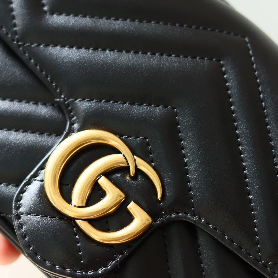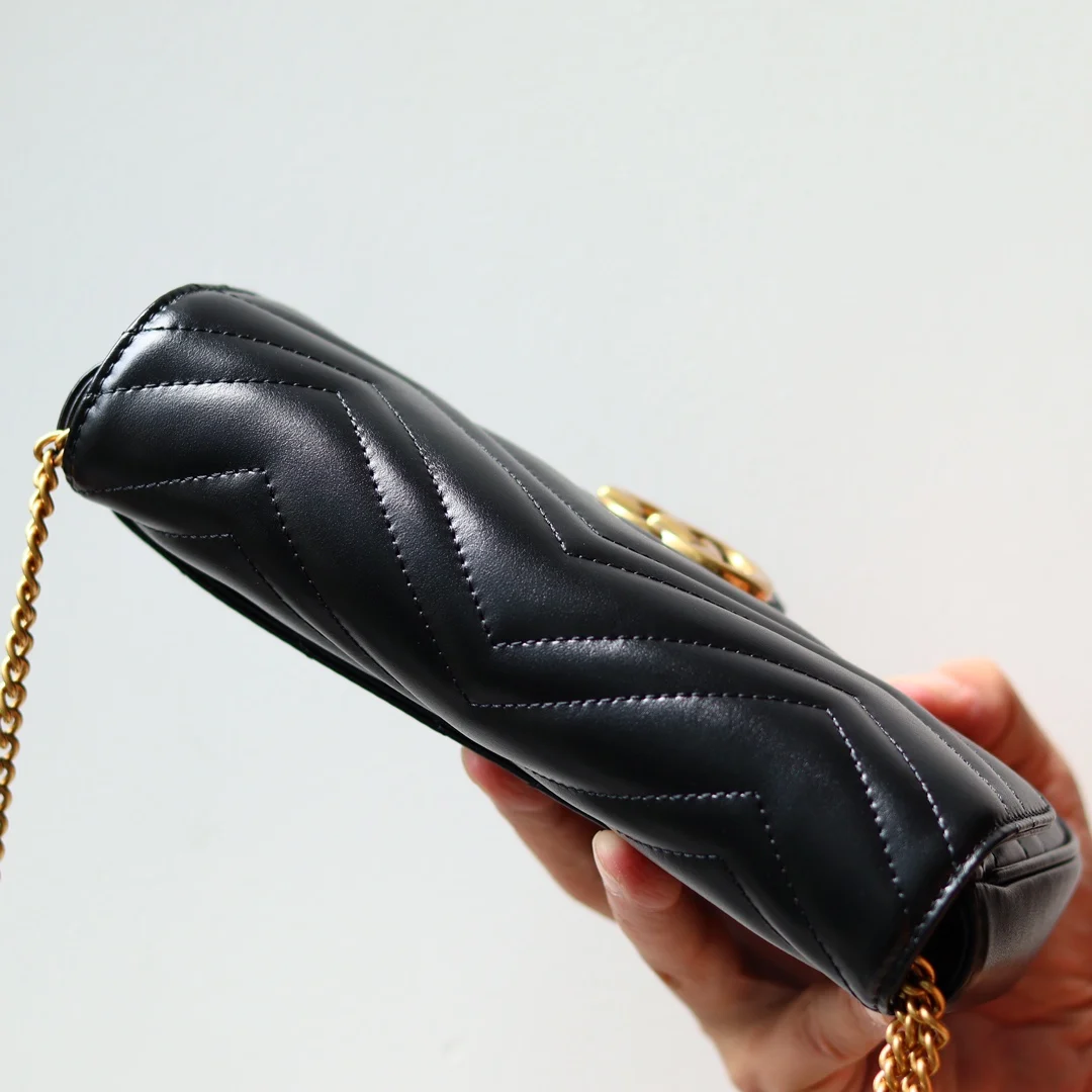简介GG Marmont链条迷你手袋 配有卡包 可以用于将此袋绑缚在另外更大的手袋上 采用颇具结构化的柔软造型 翻盖扣配以GG金属配件 金属配件从70年代经典设计中汲取灵感 采用绗缝人形花纹真皮制作