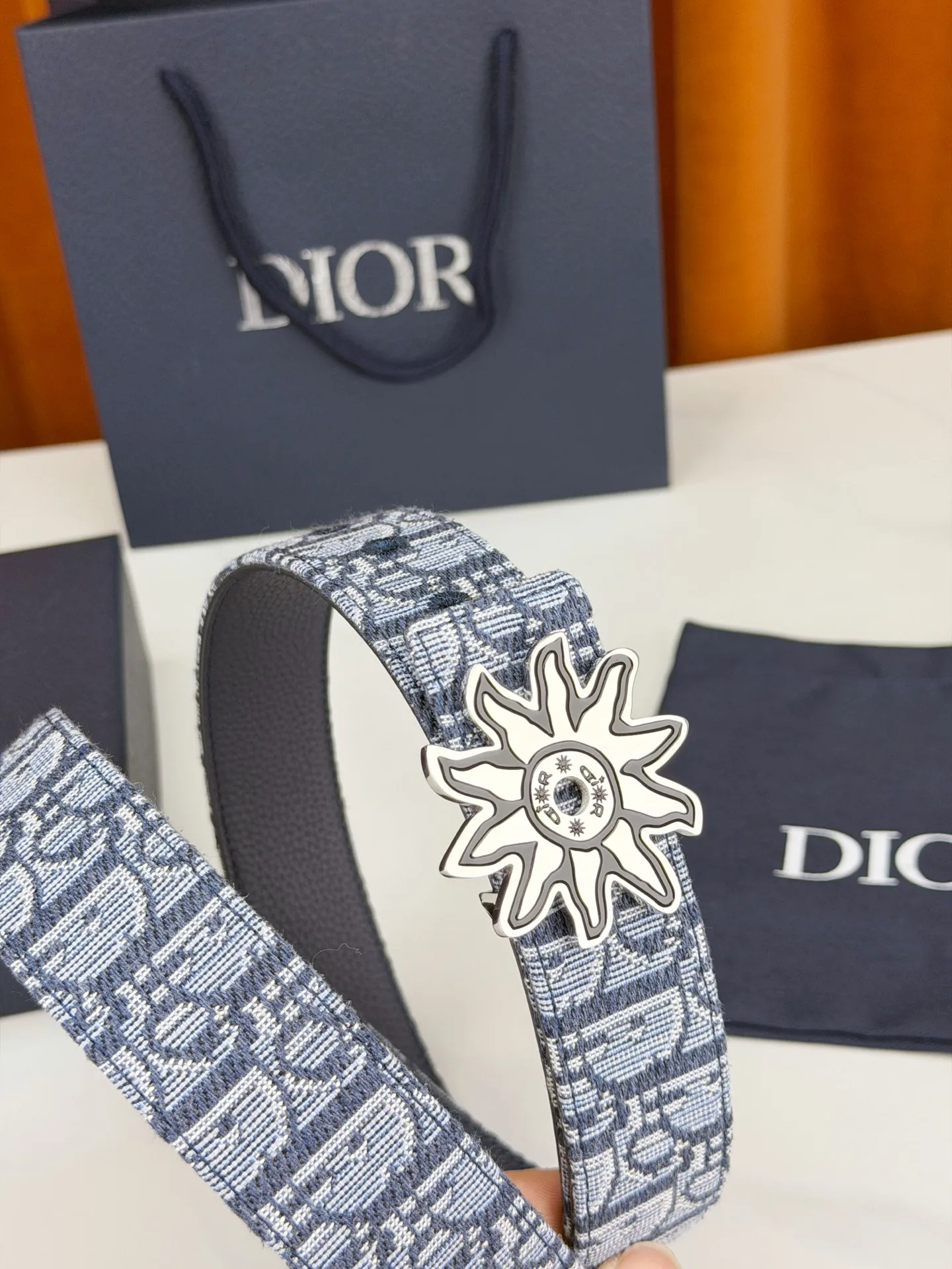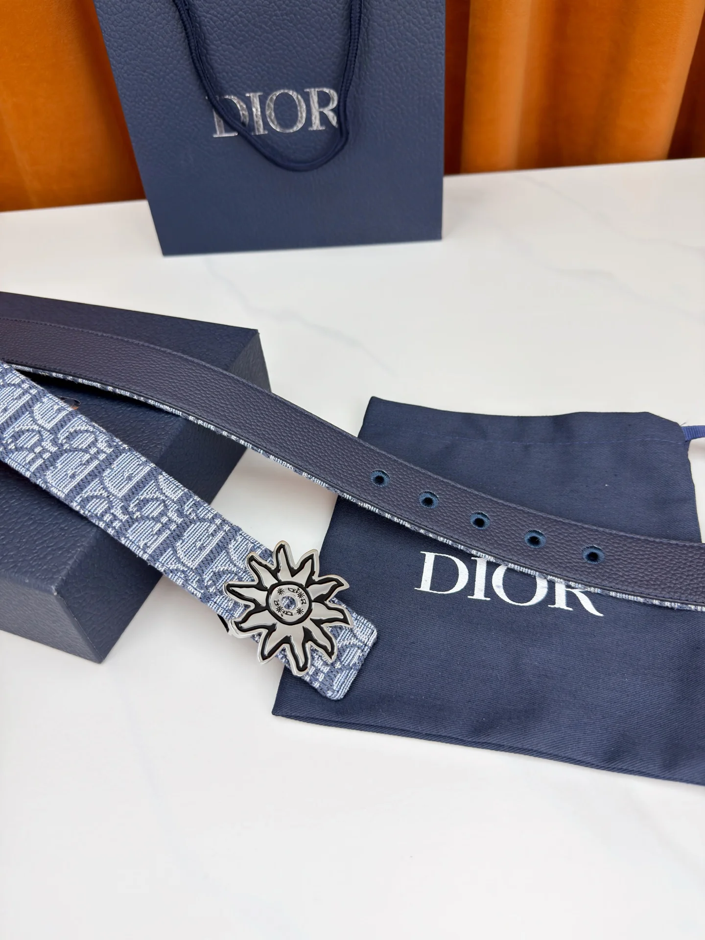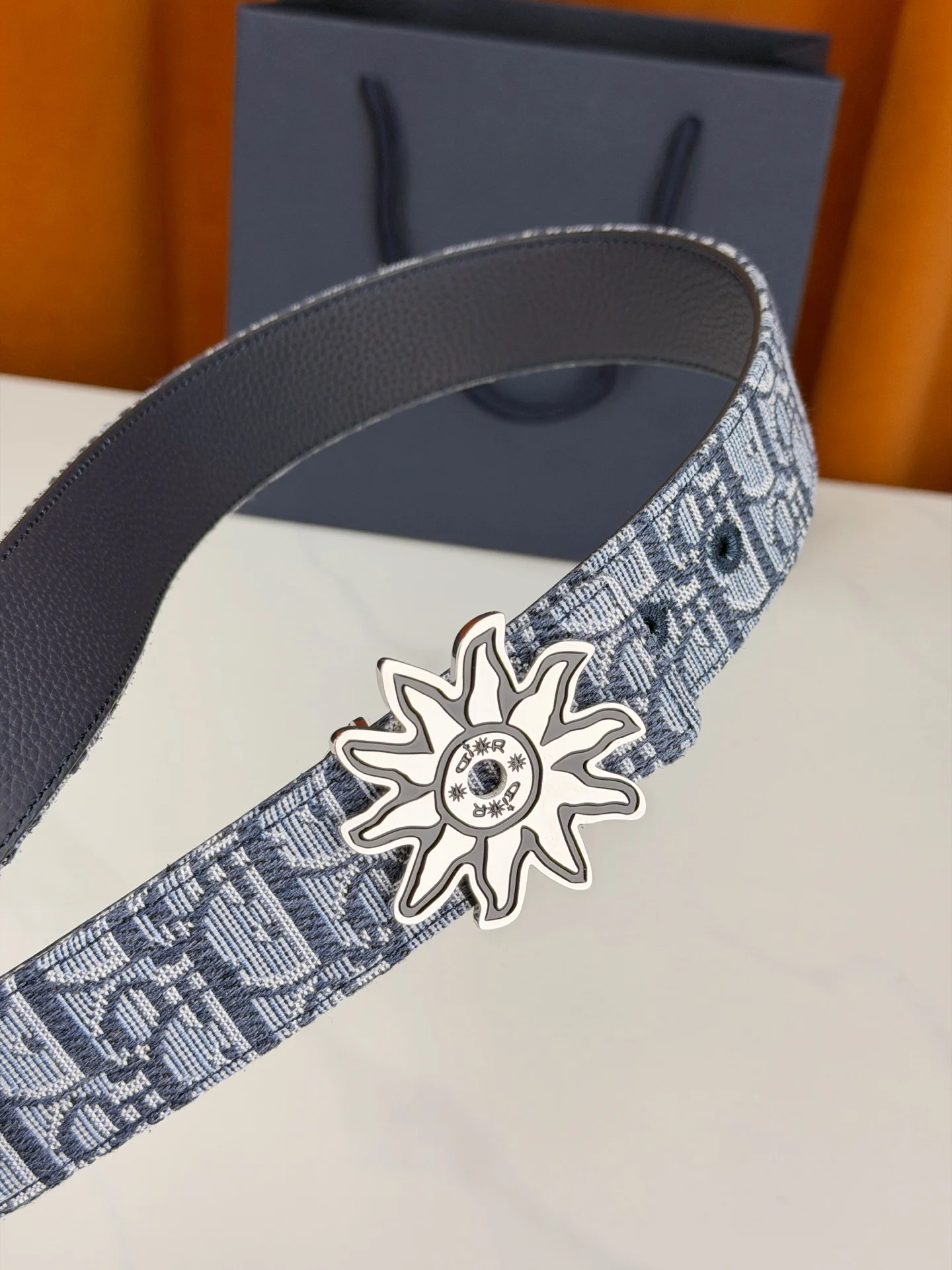 Dior 宽度3.5cm 致敬经典 焕新登场 迪奥35mm系列腰带 以标志性太阳花扣环点亮造型 蓝白老花织物搭配精致皮革 双面设计展现双重格调 简约而不简单 让每一次转身都成为焦点