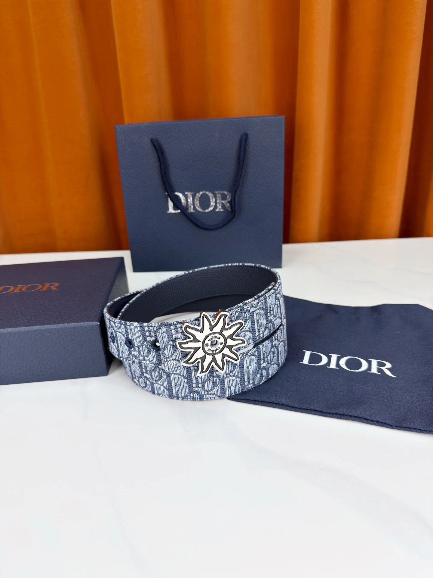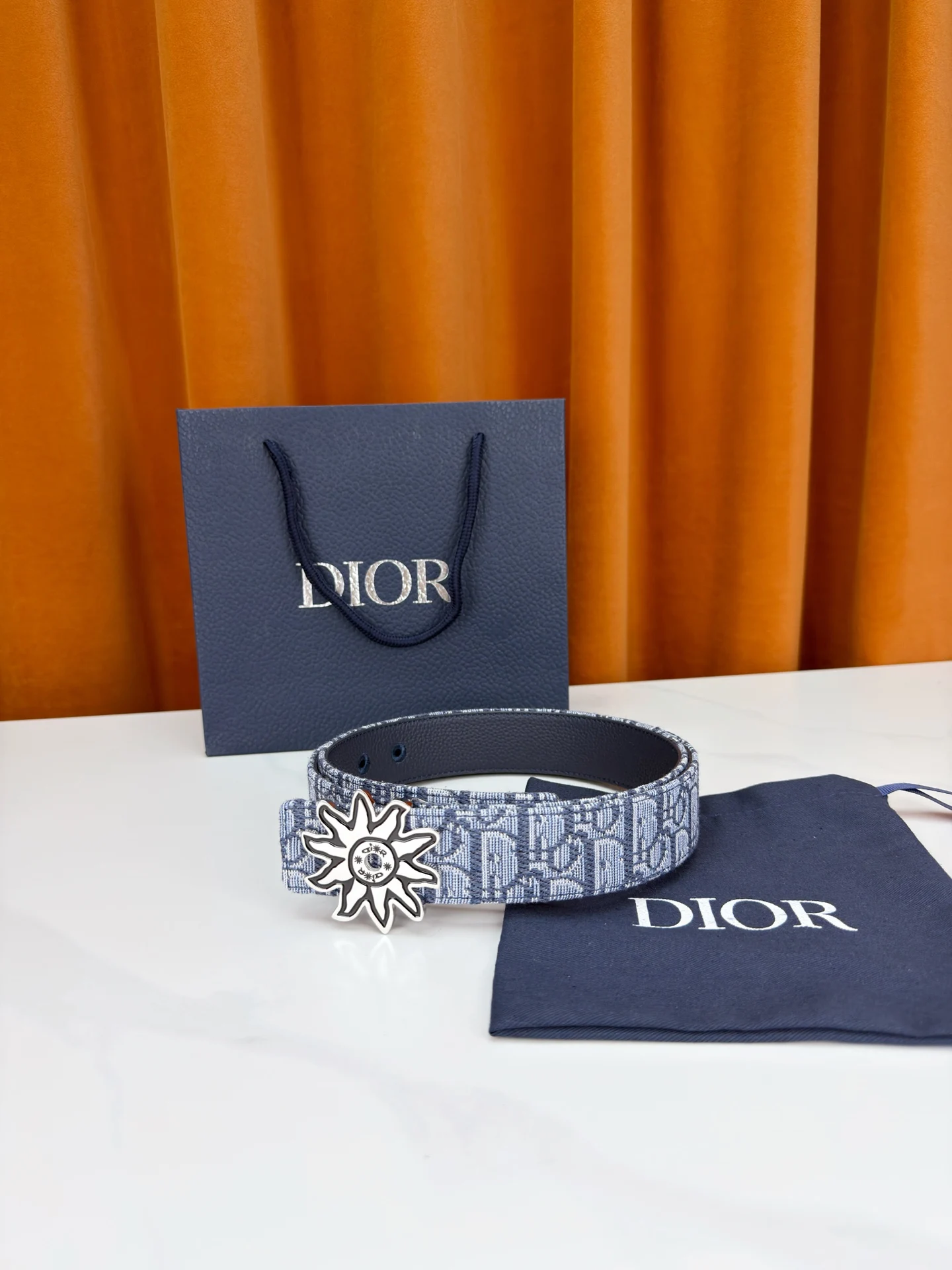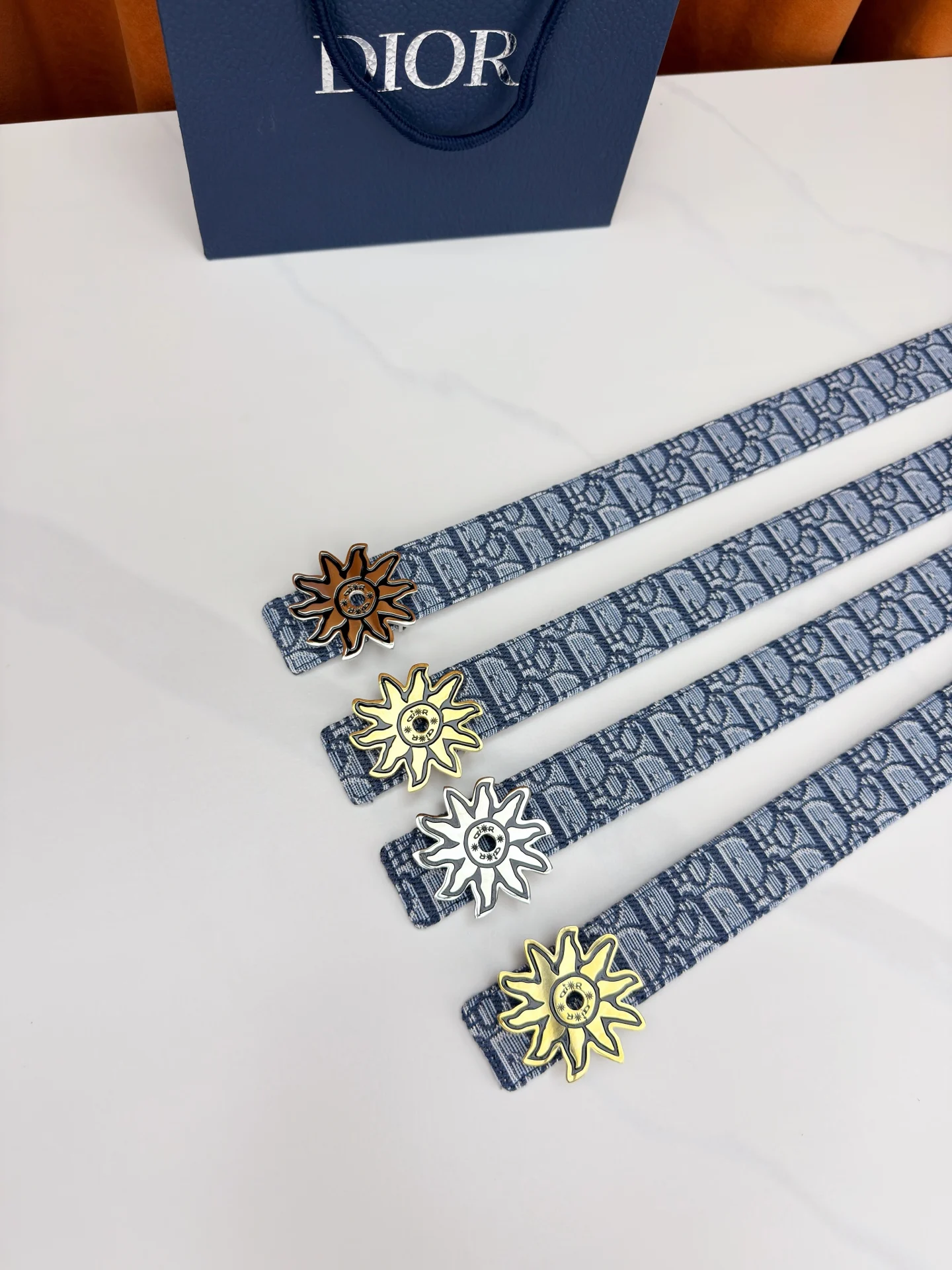 Dior 宽度3.5cm 致敬经典 焕新登场 迪奥35mm系列腰带 以标志性太阳花扣环点亮造型 蓝白老花织物搭配精致皮革 双面设计展现双重格调 简约而不简单 让每一次转身都成为焦点
