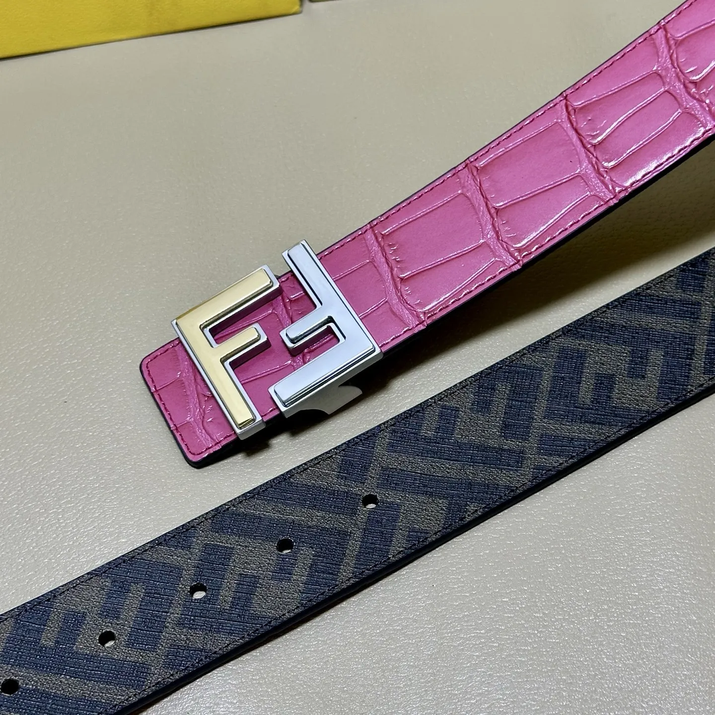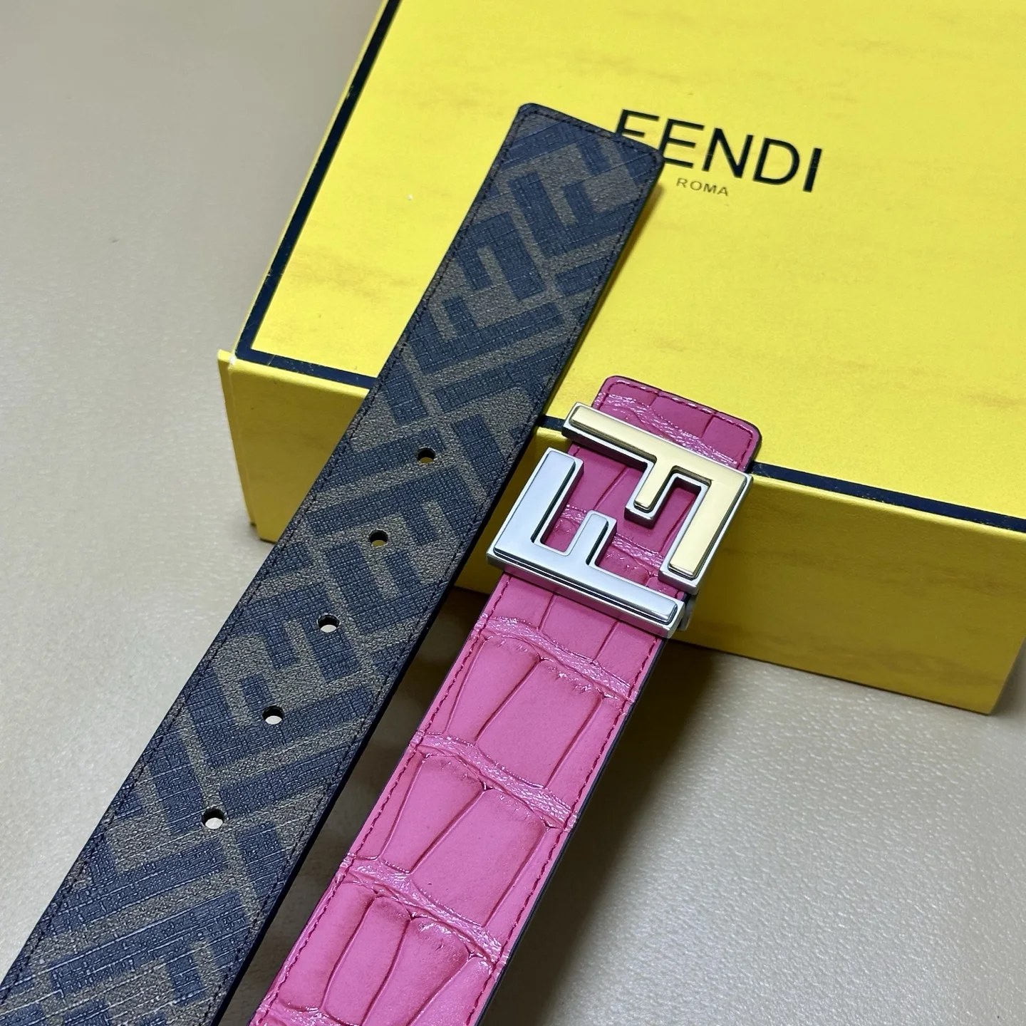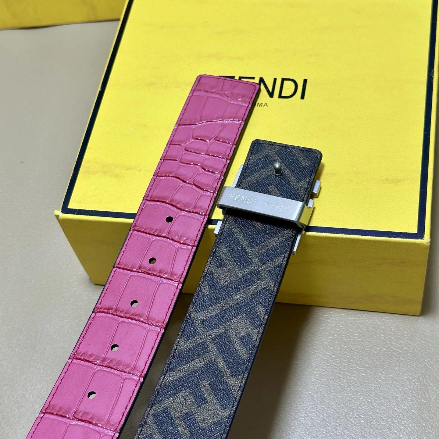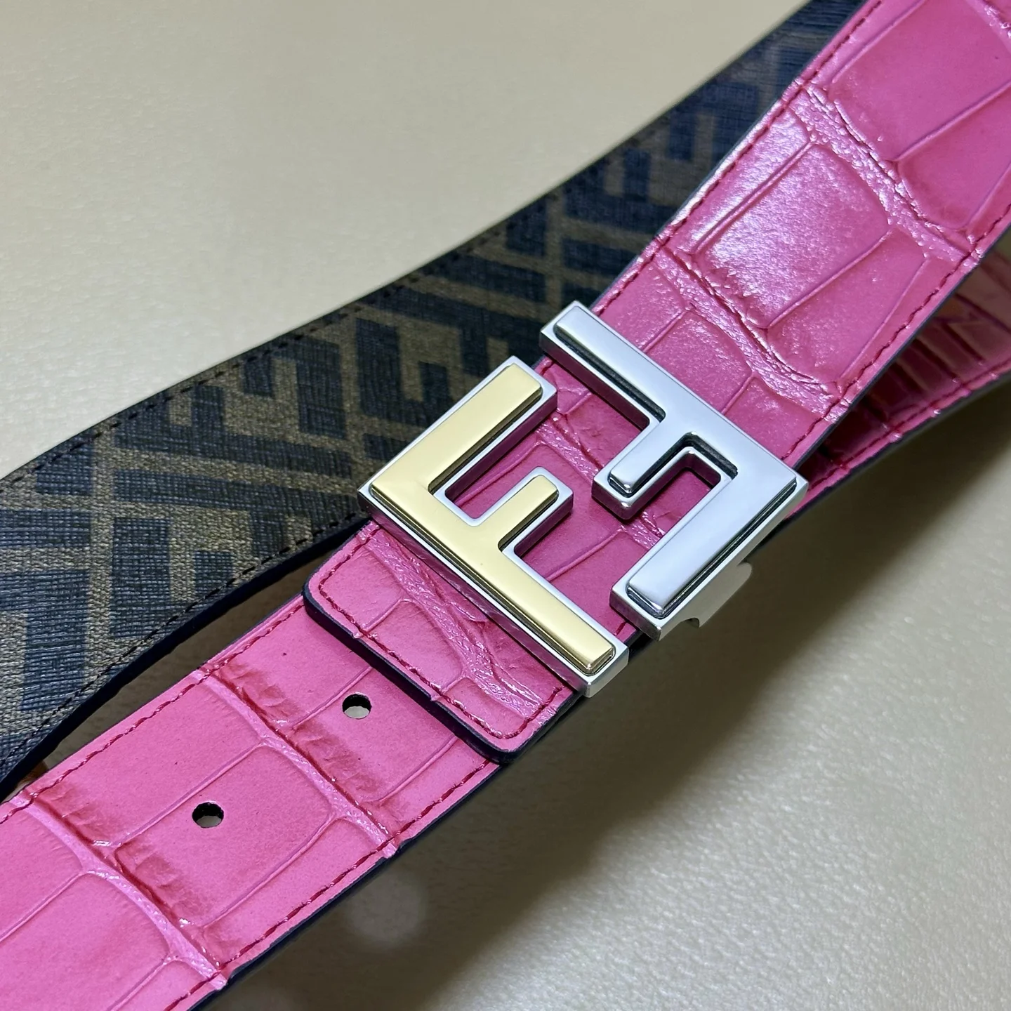 FENDI 芬迪 专柜同款 宽4.0CM 双环正反用腰带 FF按钉搭扣 咖啡色Cuoi Romano皮革材质 反面面料带有烟草黄和黑色FF图案 四方金属饰面 时尚经典 百搭款