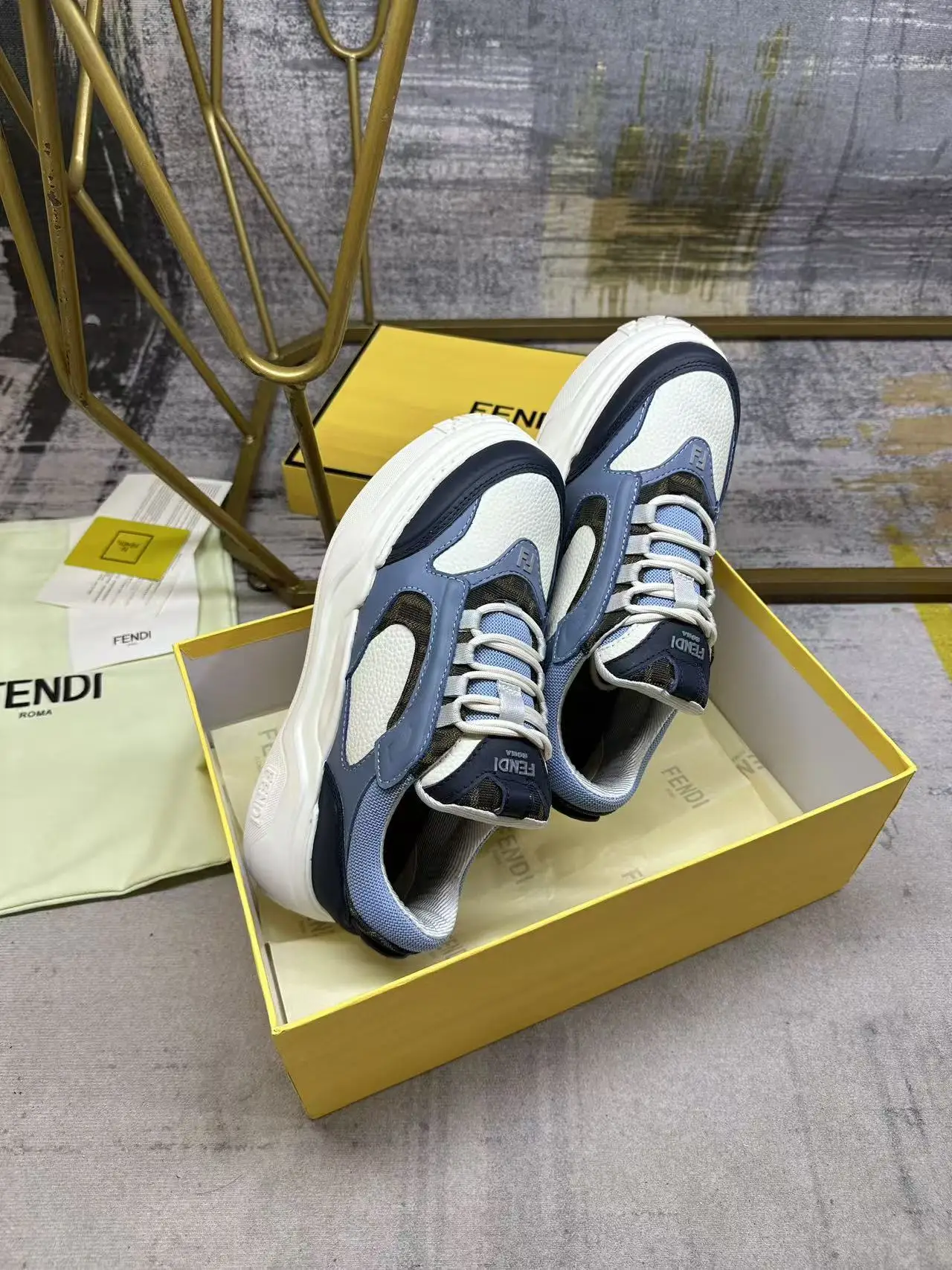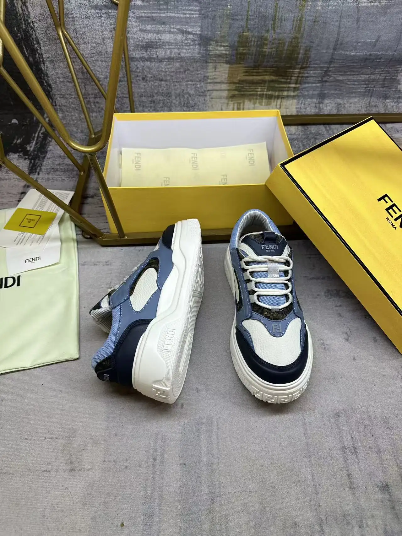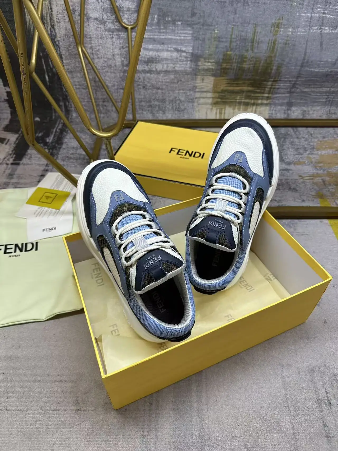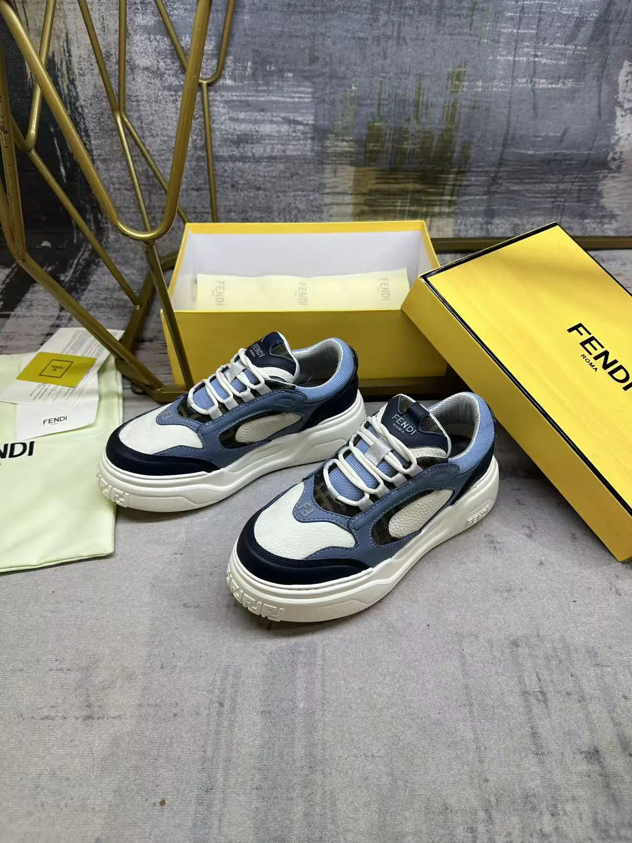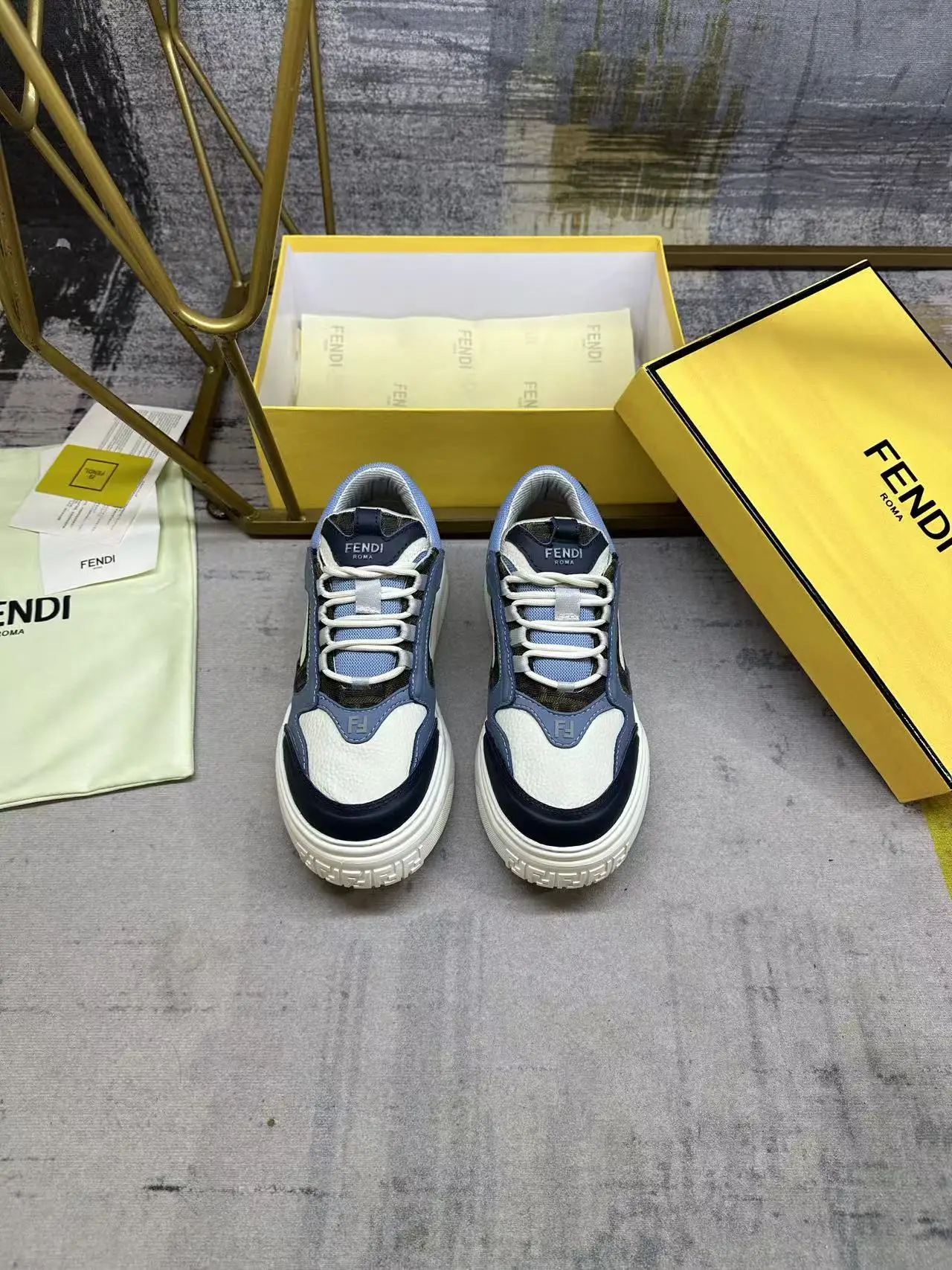 FENDI Force系带低帮鞋 白色全粒面皮革以及浅蓝色和蓝色光滑皮料材质 采用衬垫元素 棕色FF提花和浅蓝色科技布料细节 轻质厚实白色鞋底 鞋头和鞋跟带FF图案细节 男38-45码