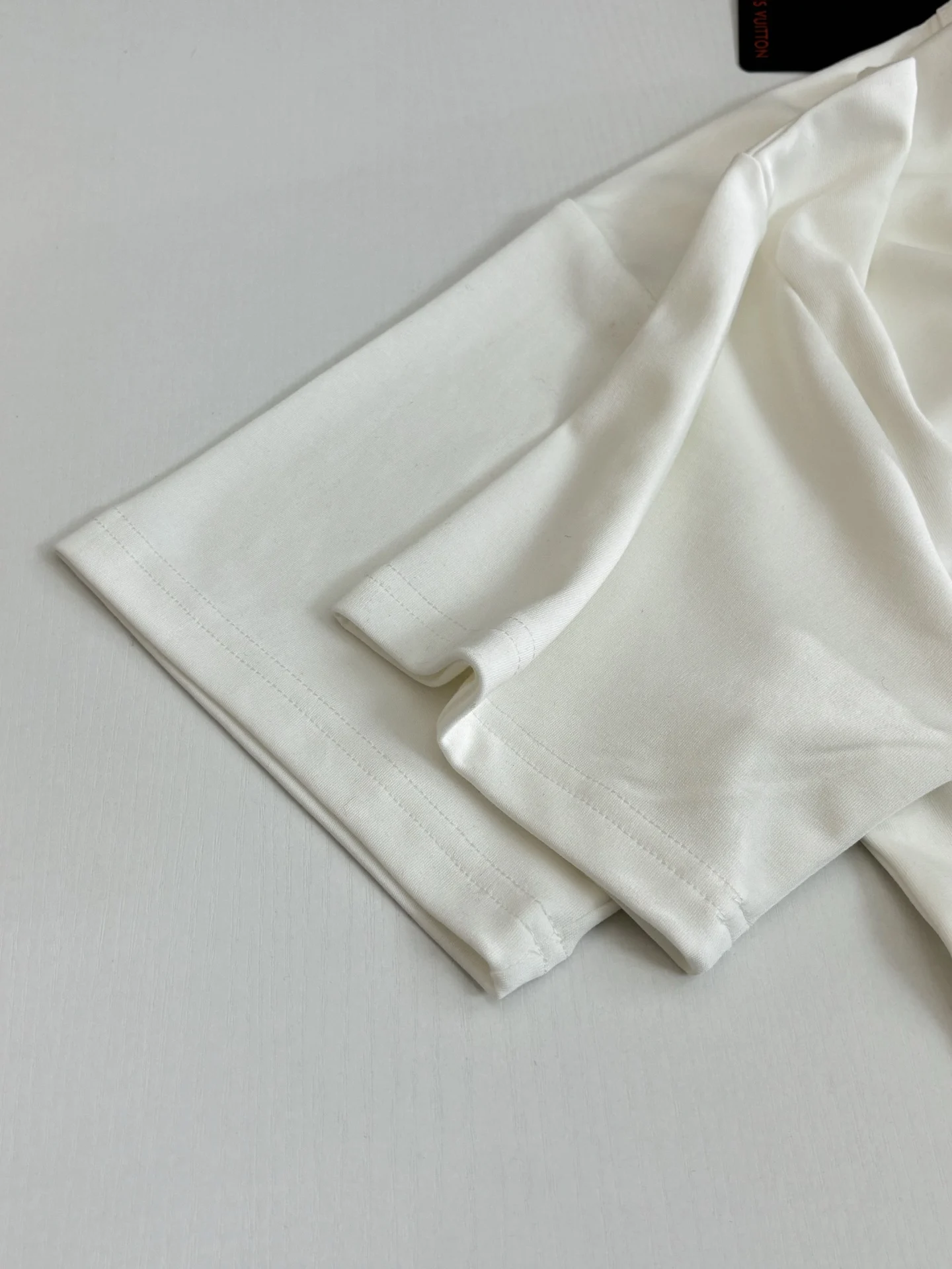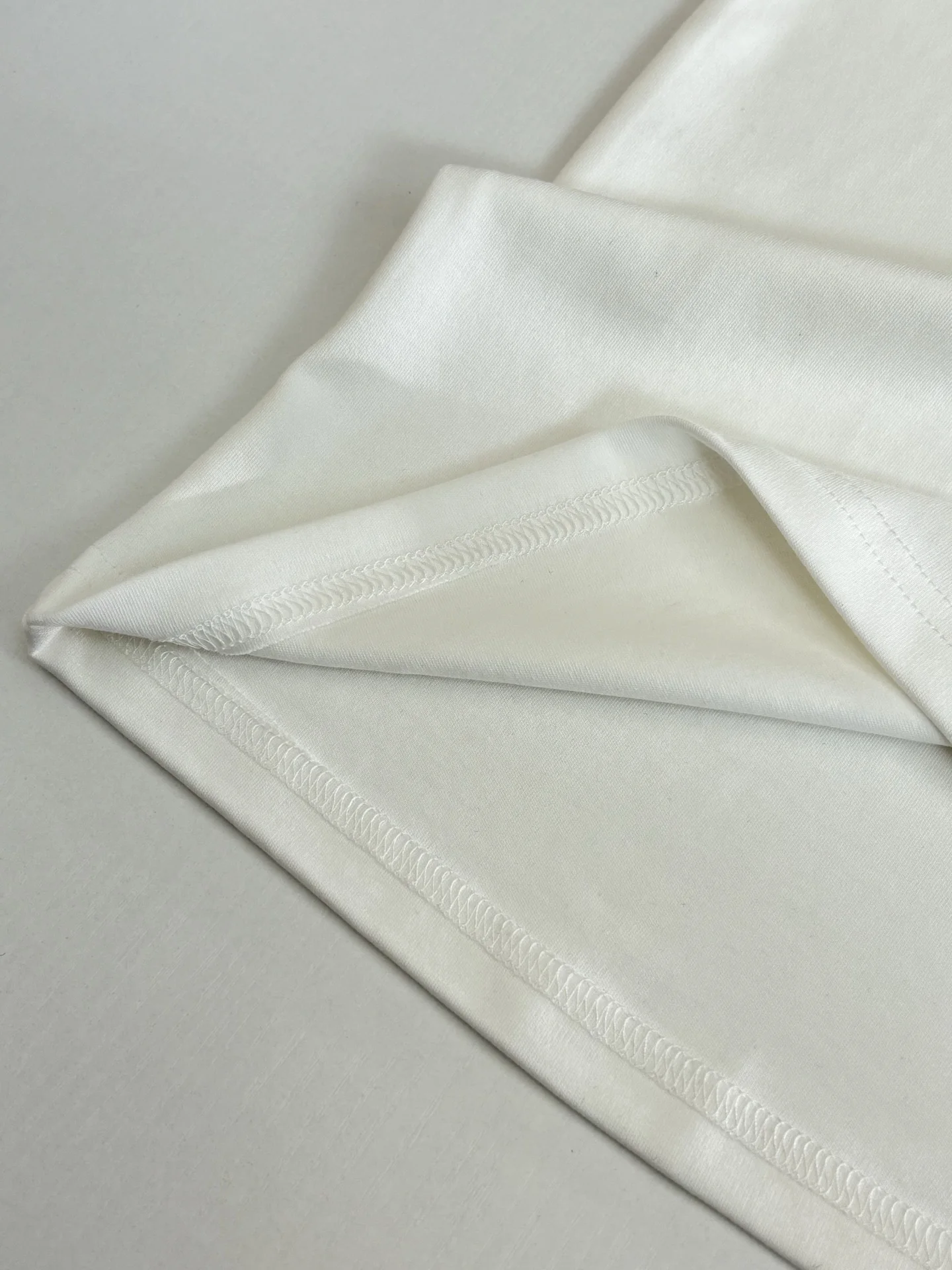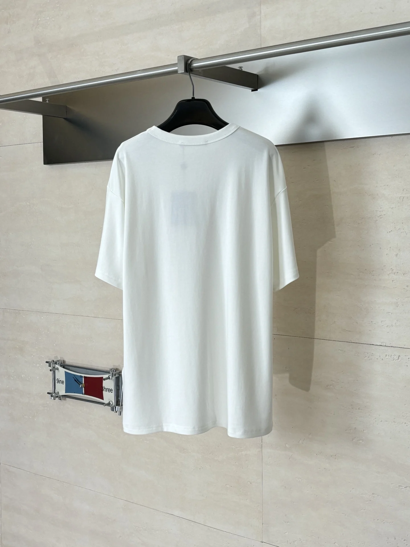 这件白色圆领短袖采用230g重磅双股新疆长绒棉面料 经液氨预缩与丝光烧毛工艺处理 兼具挺括质感与亲肤透气性 领口使用高弹罗纹布配合三本针双线加固 Size S/M/L