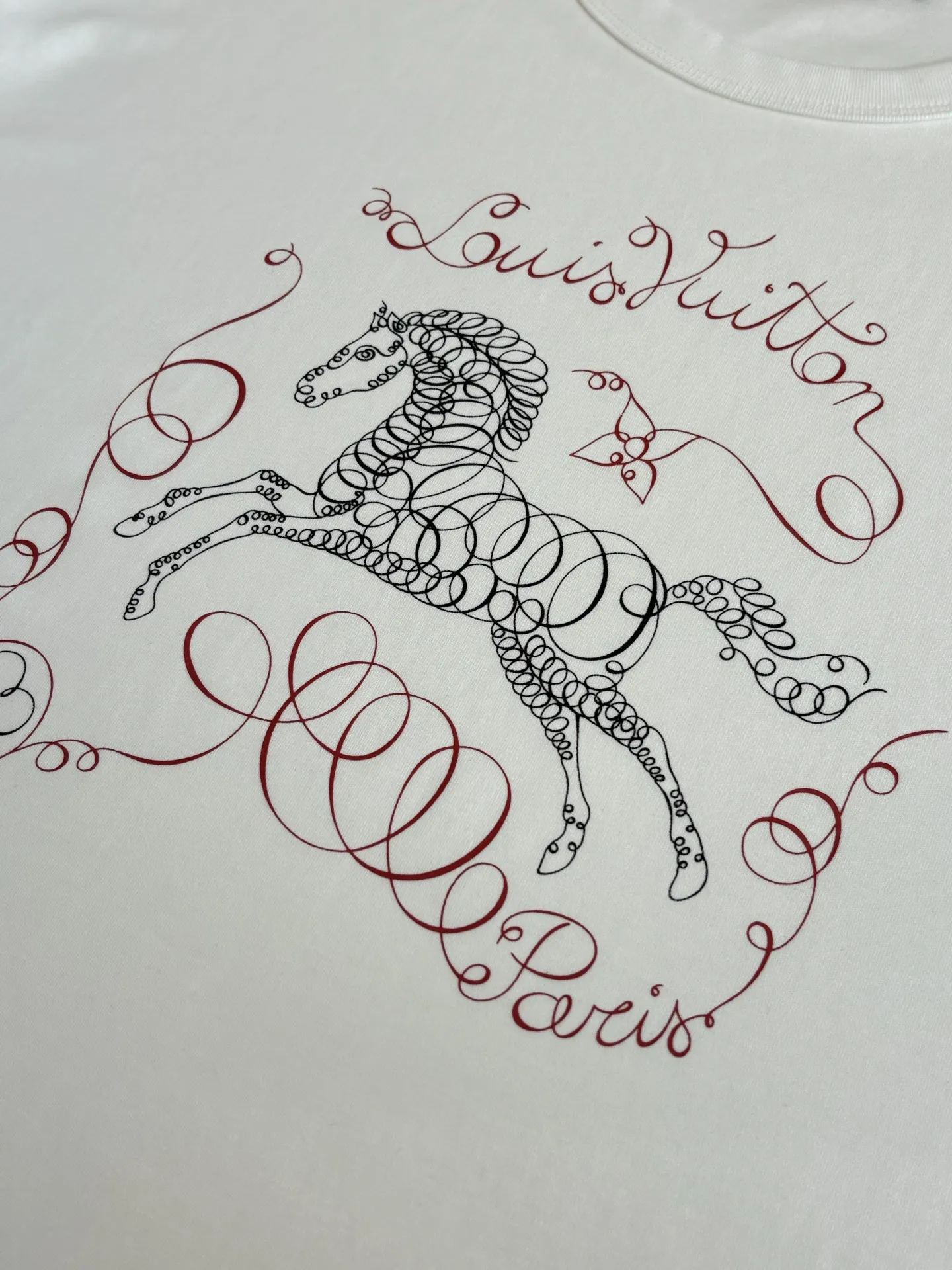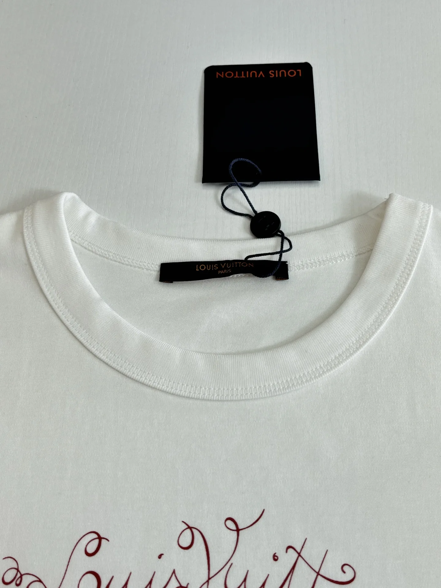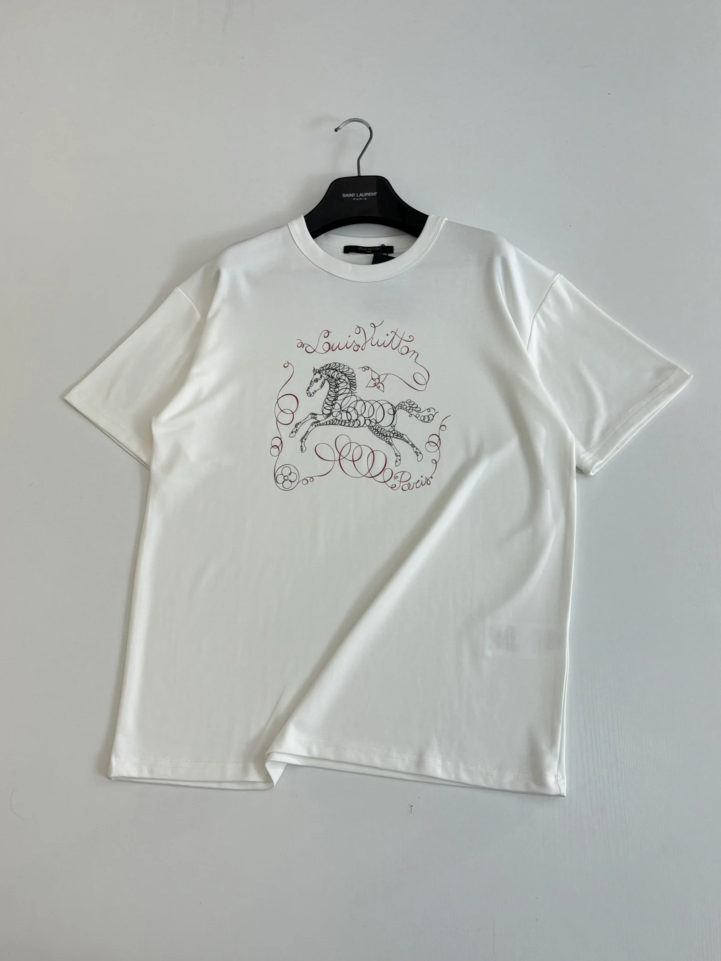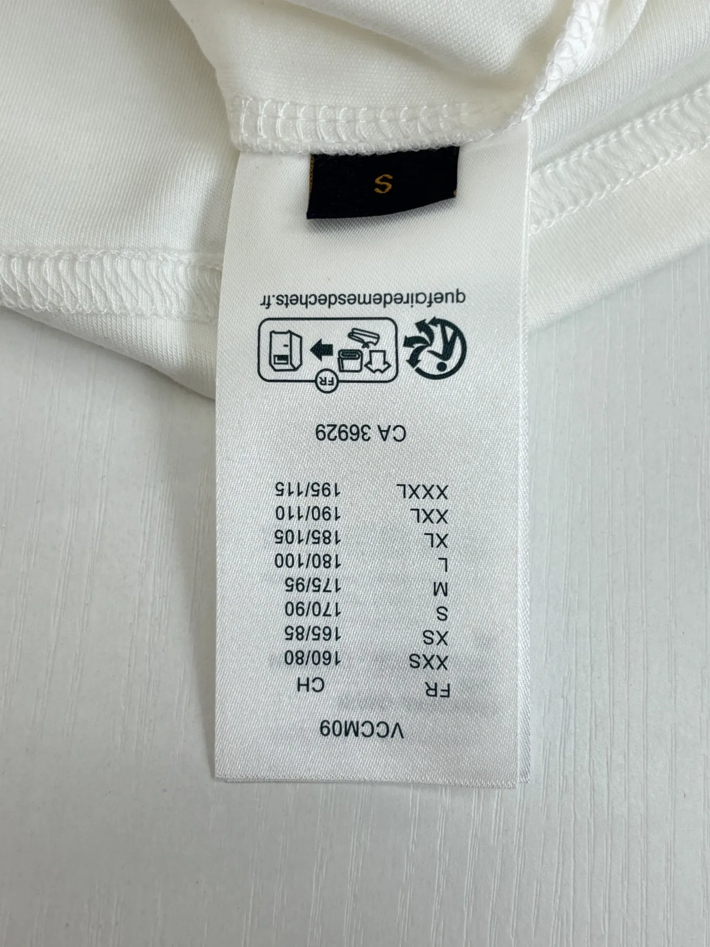这件白色圆领短袖采用230g重磅双股新疆长绒棉面料 经液氨预缩与丝光烧毛工艺处理 兼具挺括质感与亲肤透气性 领口使用高弹罗纹布配合三本针双线加固 Size S/M/L