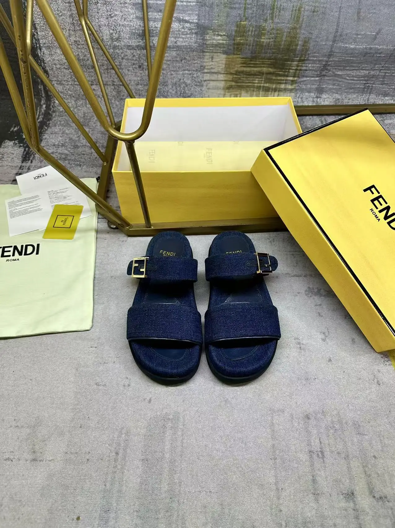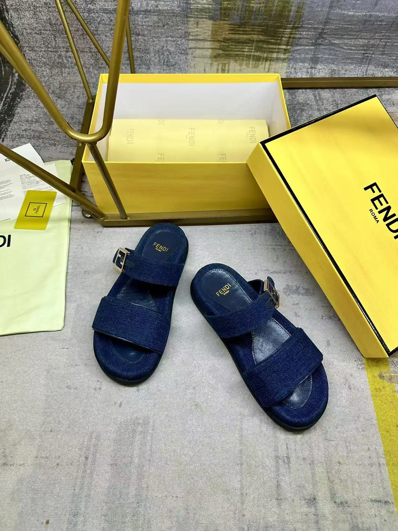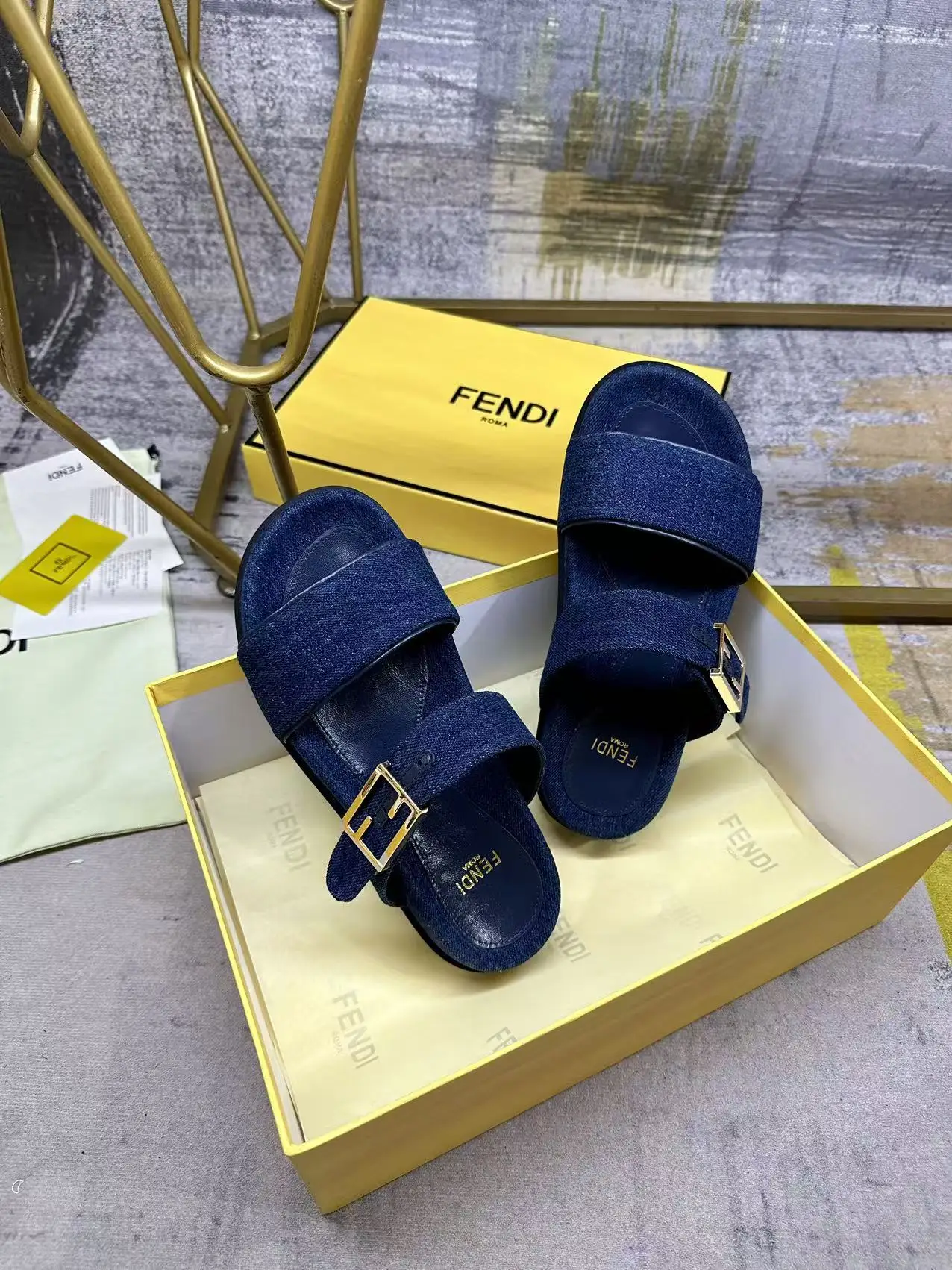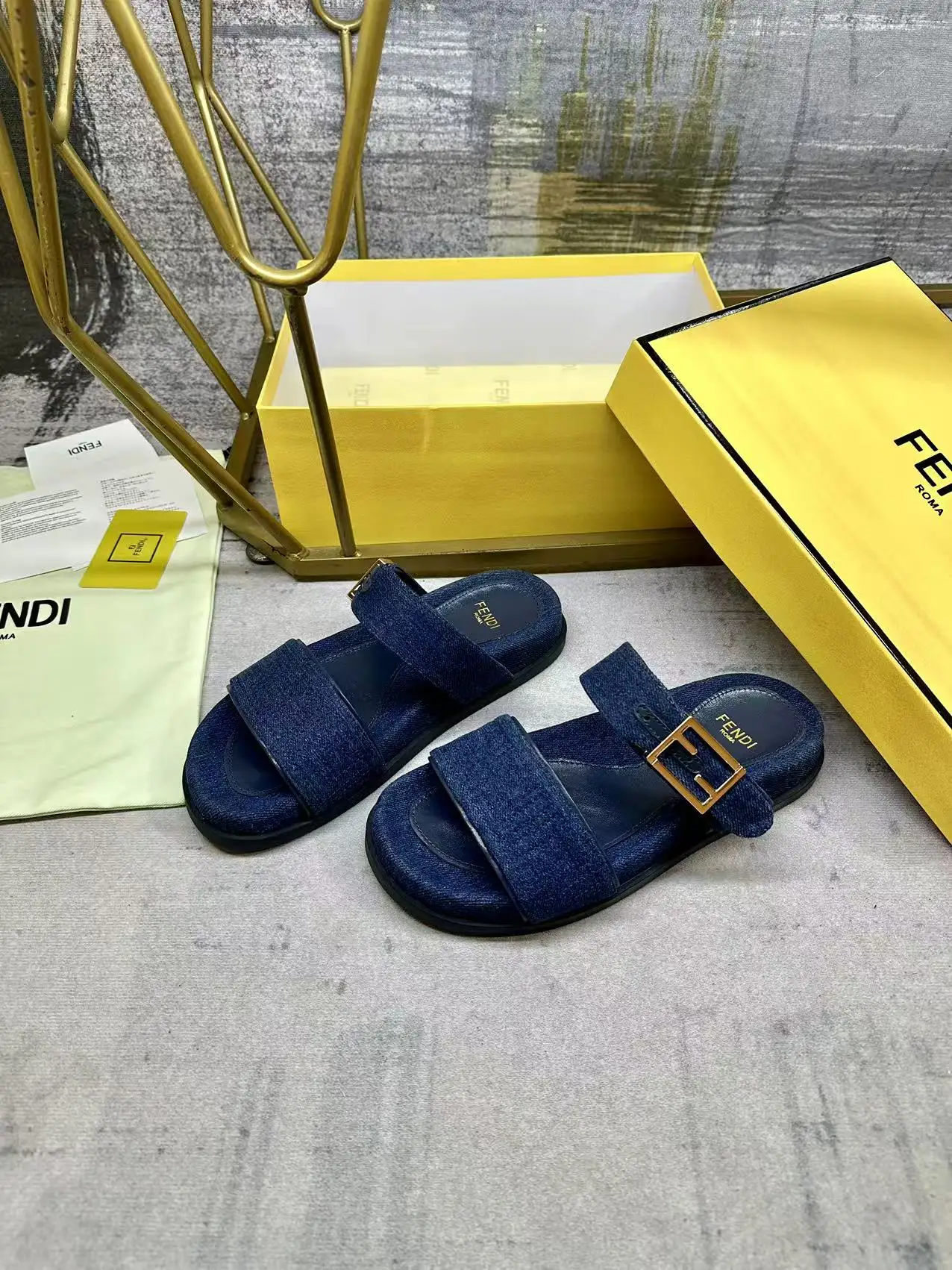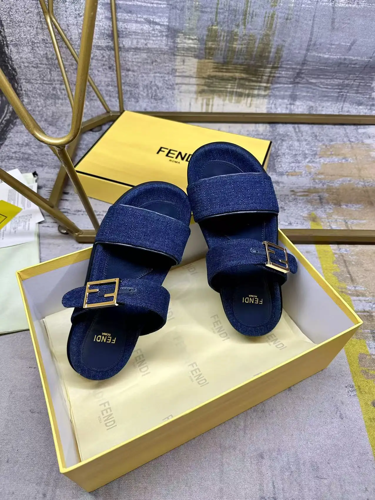 FENDI最新爆款双带平底拖鞋 带FF装饰性搭扣 牛仔布面料 饰带正面饰有FF图案刺绣 蓝色羊皮内里内垫 35-45码