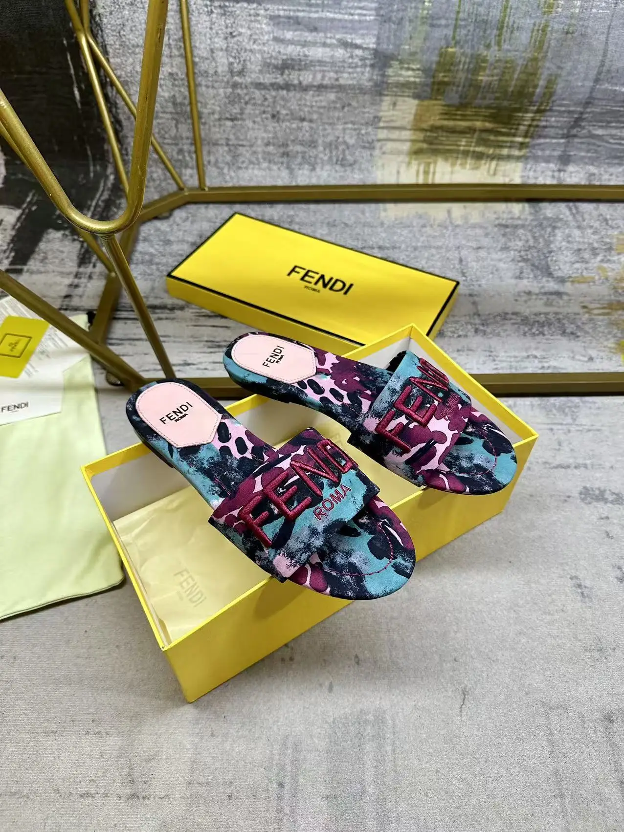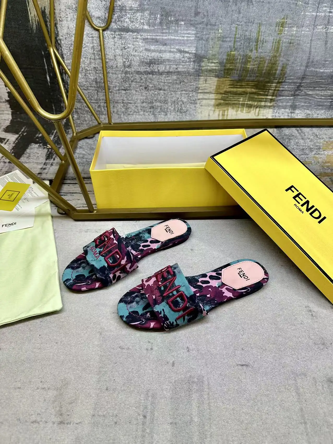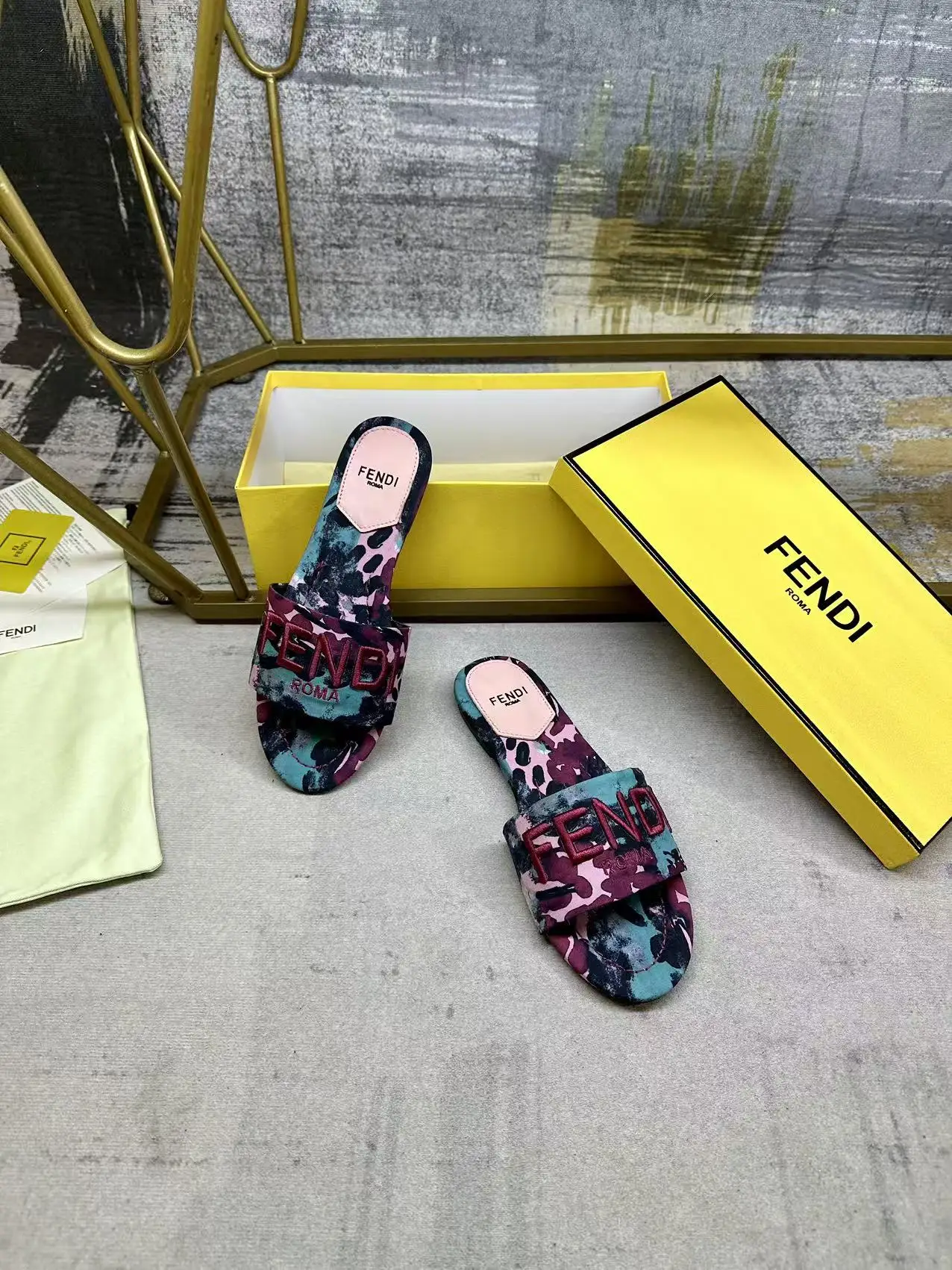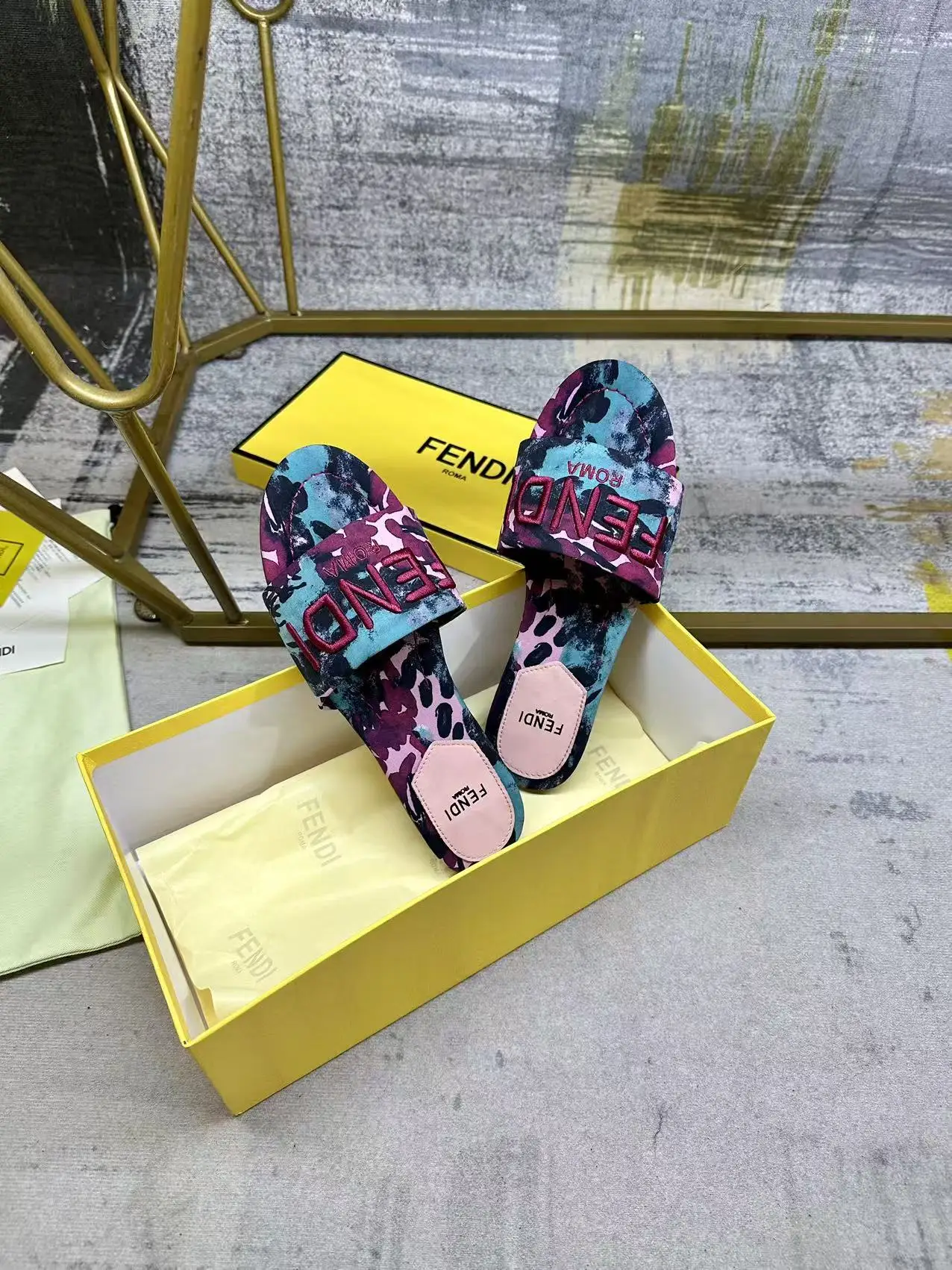 FENDI最新爆款宽带厚平底拖鞋 紫绿色印花图案 同色皮料内里垫脚 紫色FENDI纱线刺绣 35-42码