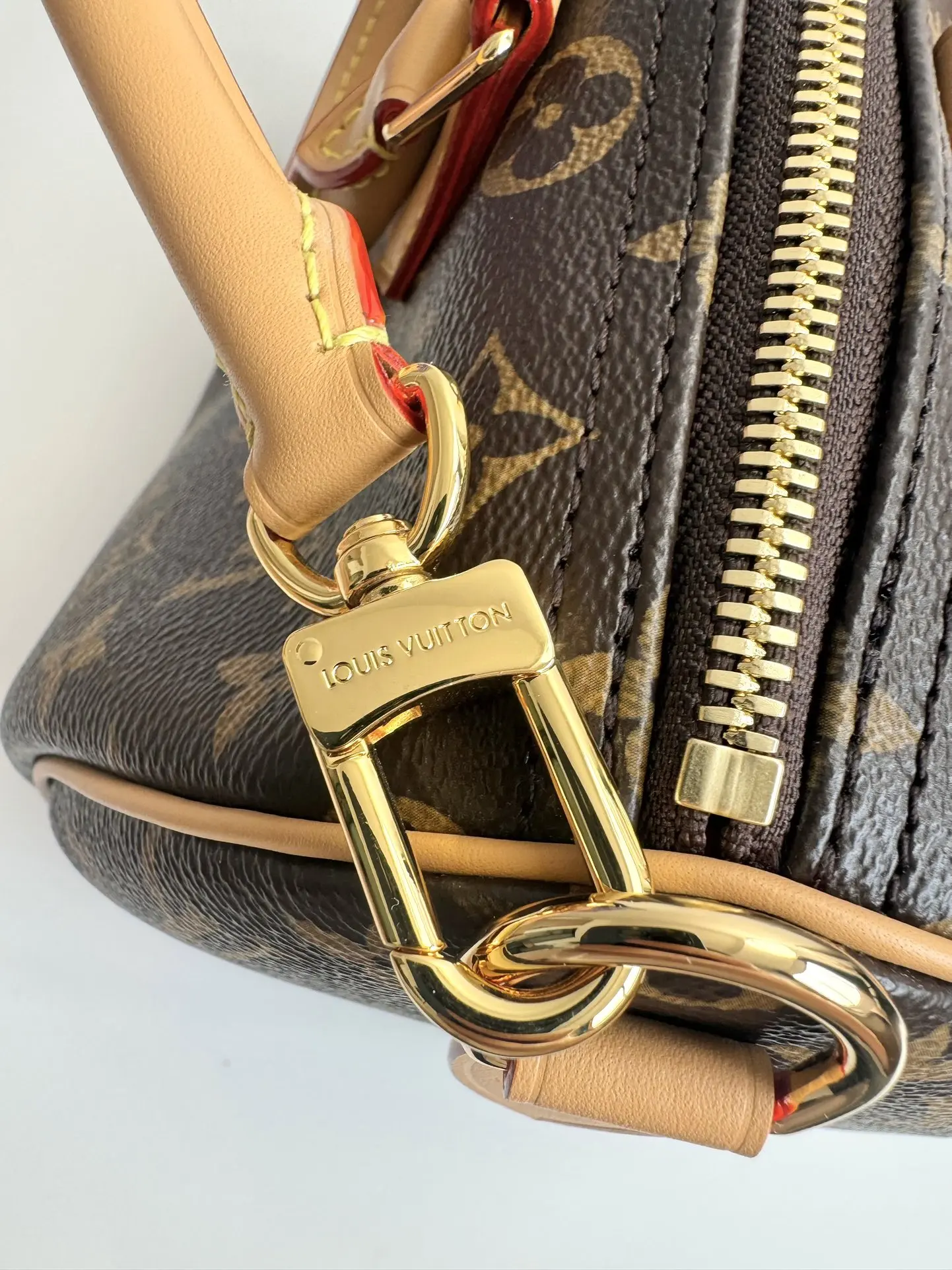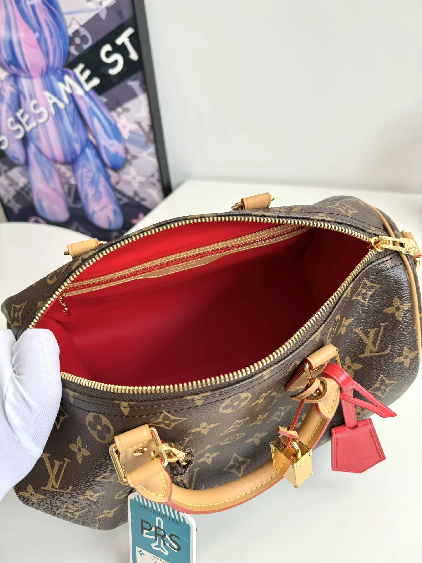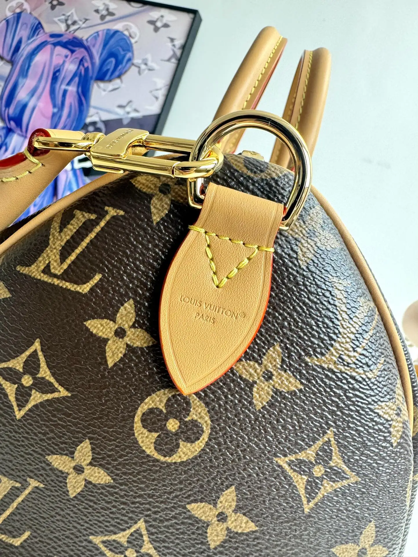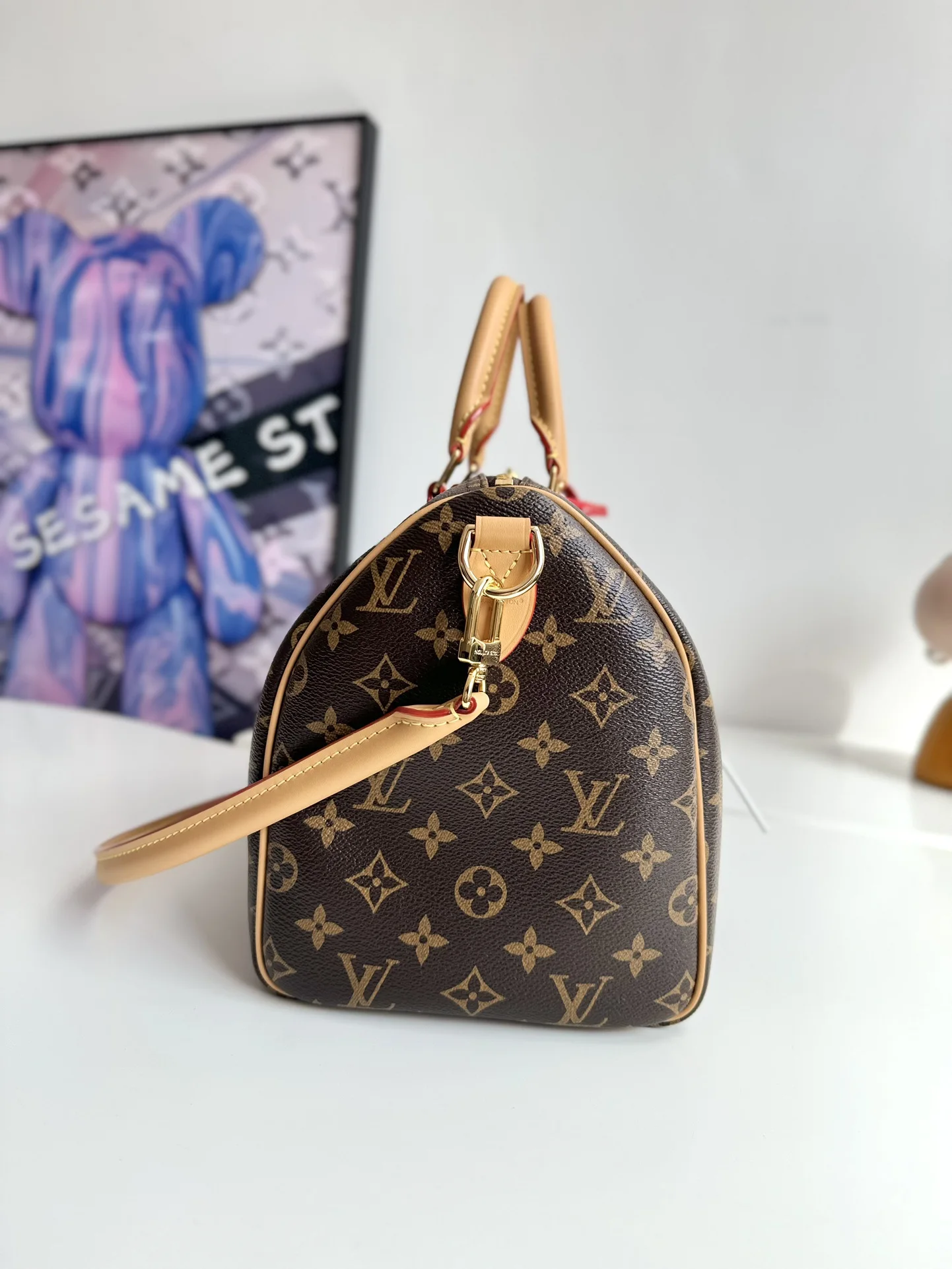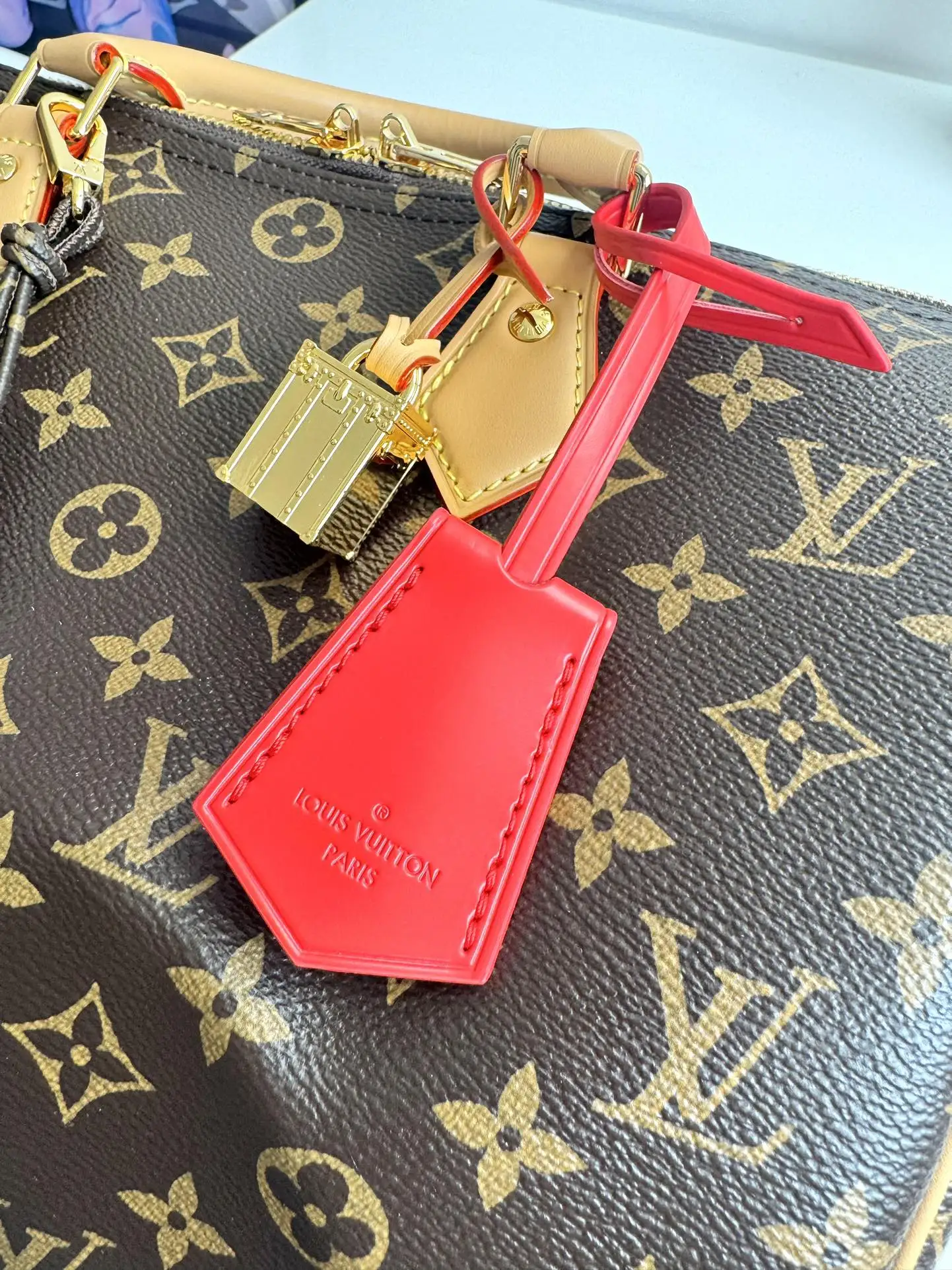 海外原单M11945独家实拍 Speedy Soft 30 Crafty 手袋以惬意之姿相伴旅途 Monogram 涂层帆布带来柔软质感 皮革内衬与钥匙包融入瞩目笔触 登机牌和硬箱装饰彰显玩趣巧思 拉链内袋可妥善存放护照和其他重要物品 Toron 手柄再添华美一笔 尺寸 30×21×17cm
