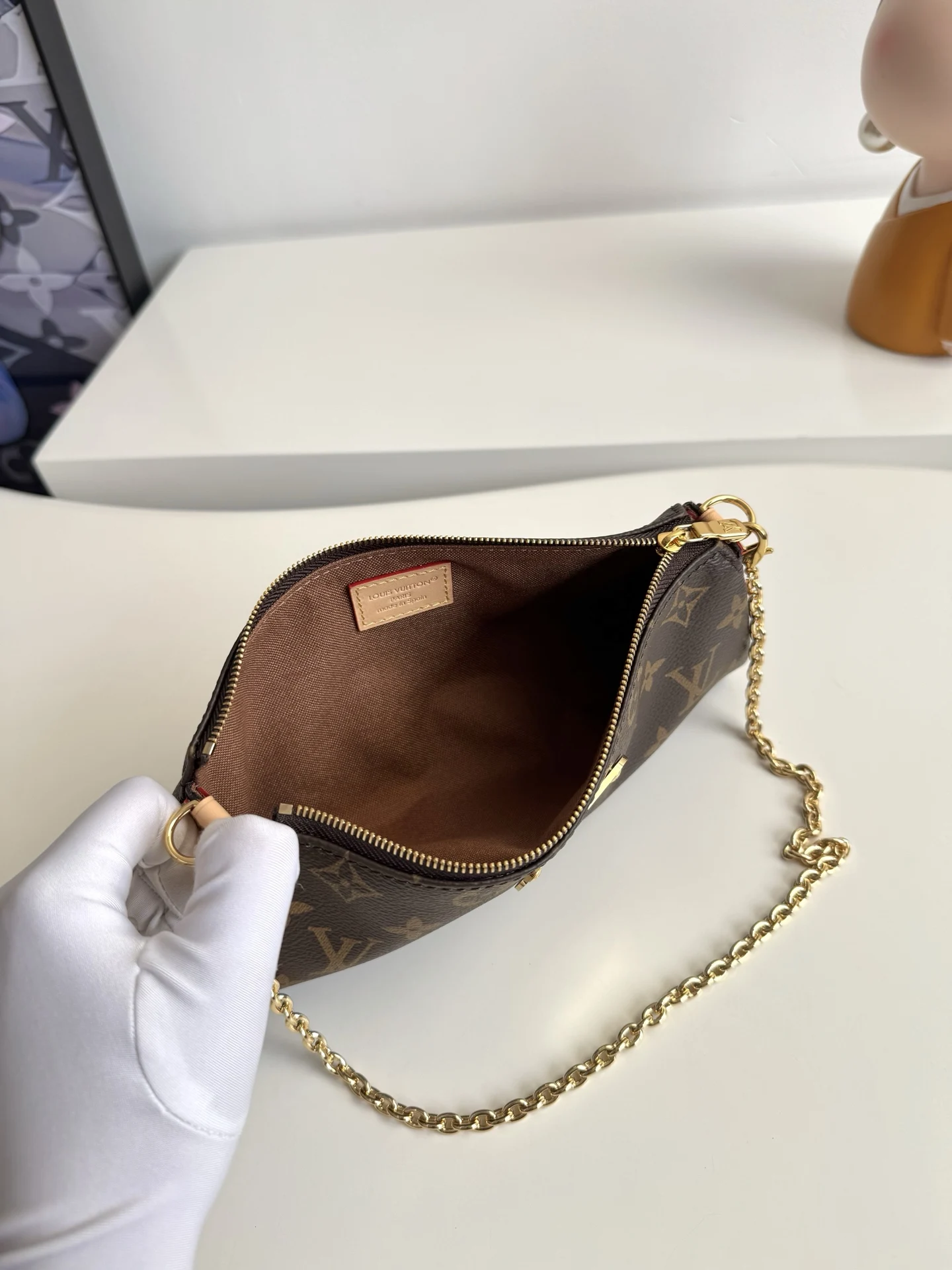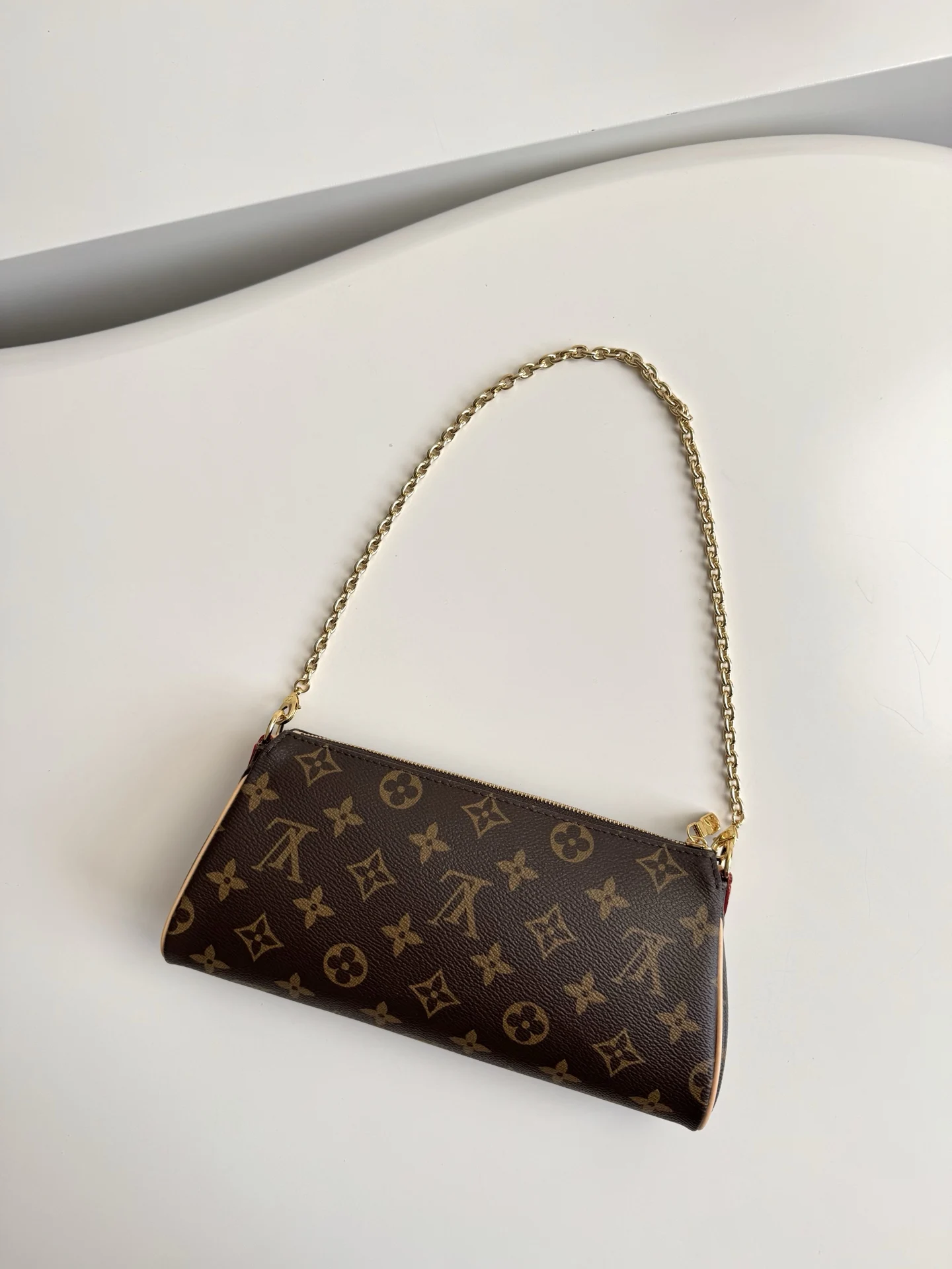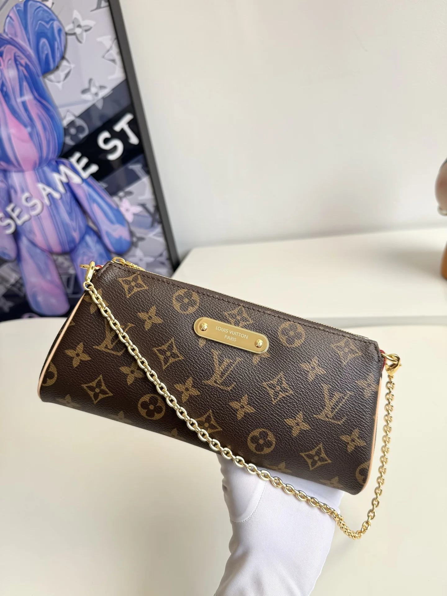 海外原单M13567独家实拍 本款 Pochette Eva 手袋为品牌 Monogram 帆布搭配撞色皮革饰边 以别致笔触传递典雅风范 铭纹标识牌和可拆卸链条相得益彰 恰宜构型便于收纳短款夹和化妆品等日常所需 尺寸 27×11×5cm