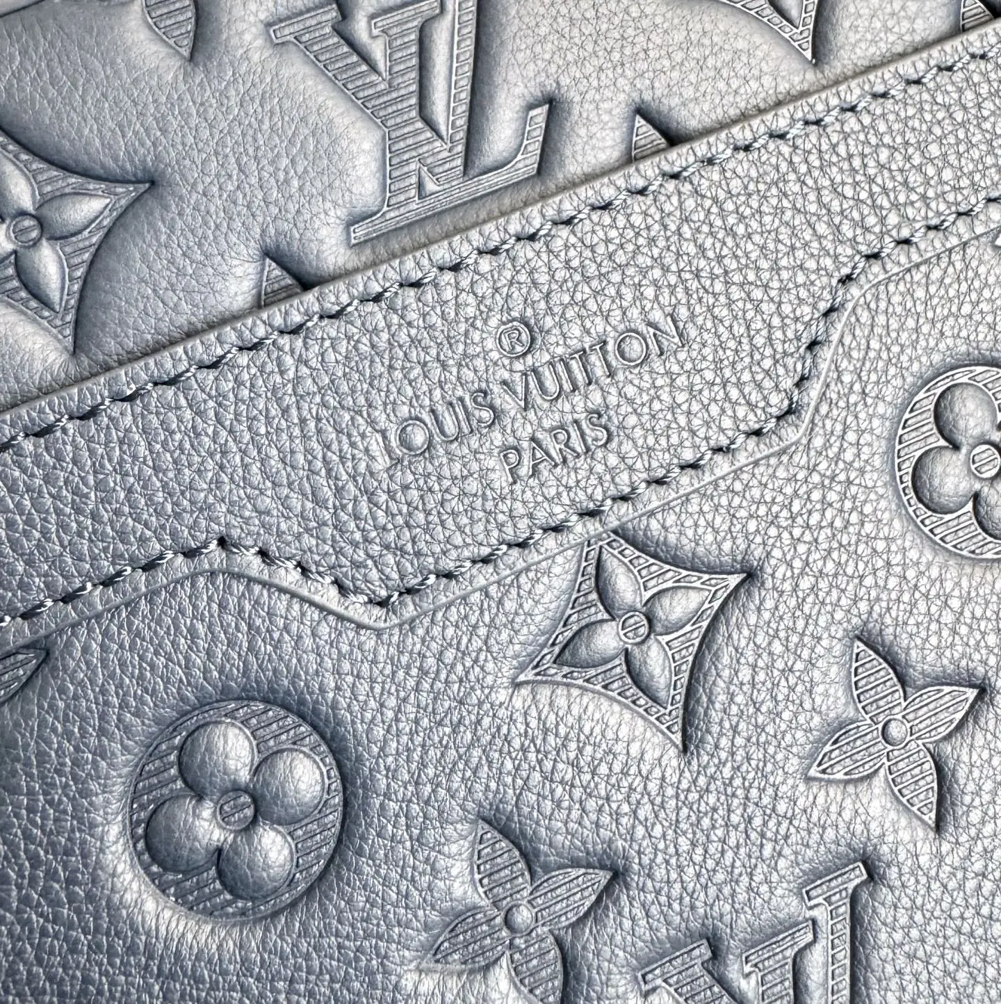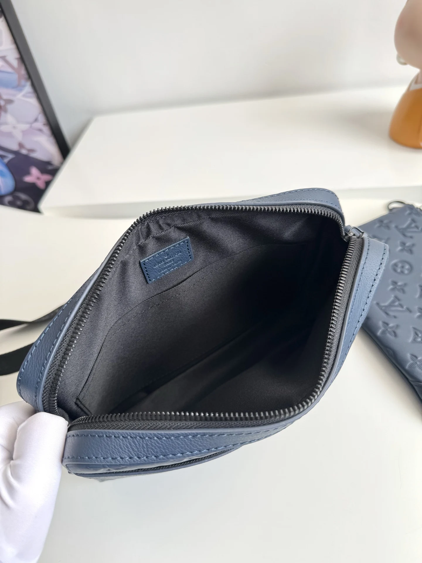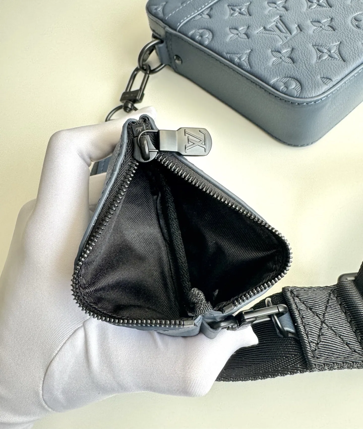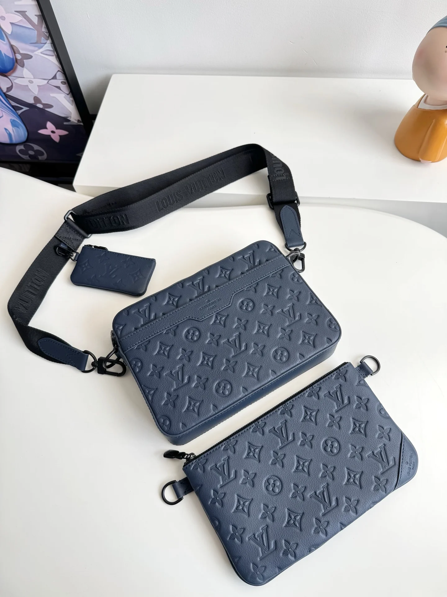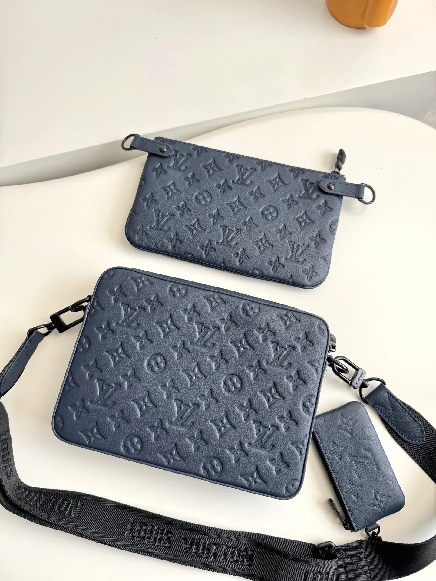 海外原单M14785独家实拍 本款 Trio 邮差包取材柔软 Monogram Shadow 压纹牛皮革 为摩登 Monogram 压纹图案浸染活力色调 贴身构型融入主袋和可拆卸拉链前袋 肩带配有可拆卸零包 尺寸 25×18.5×7cm