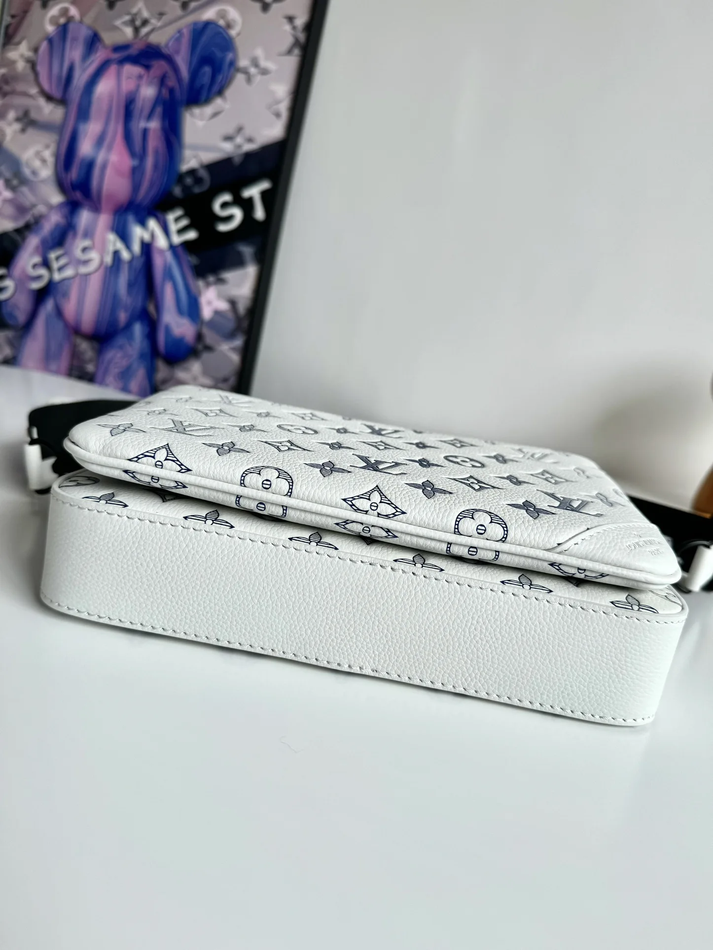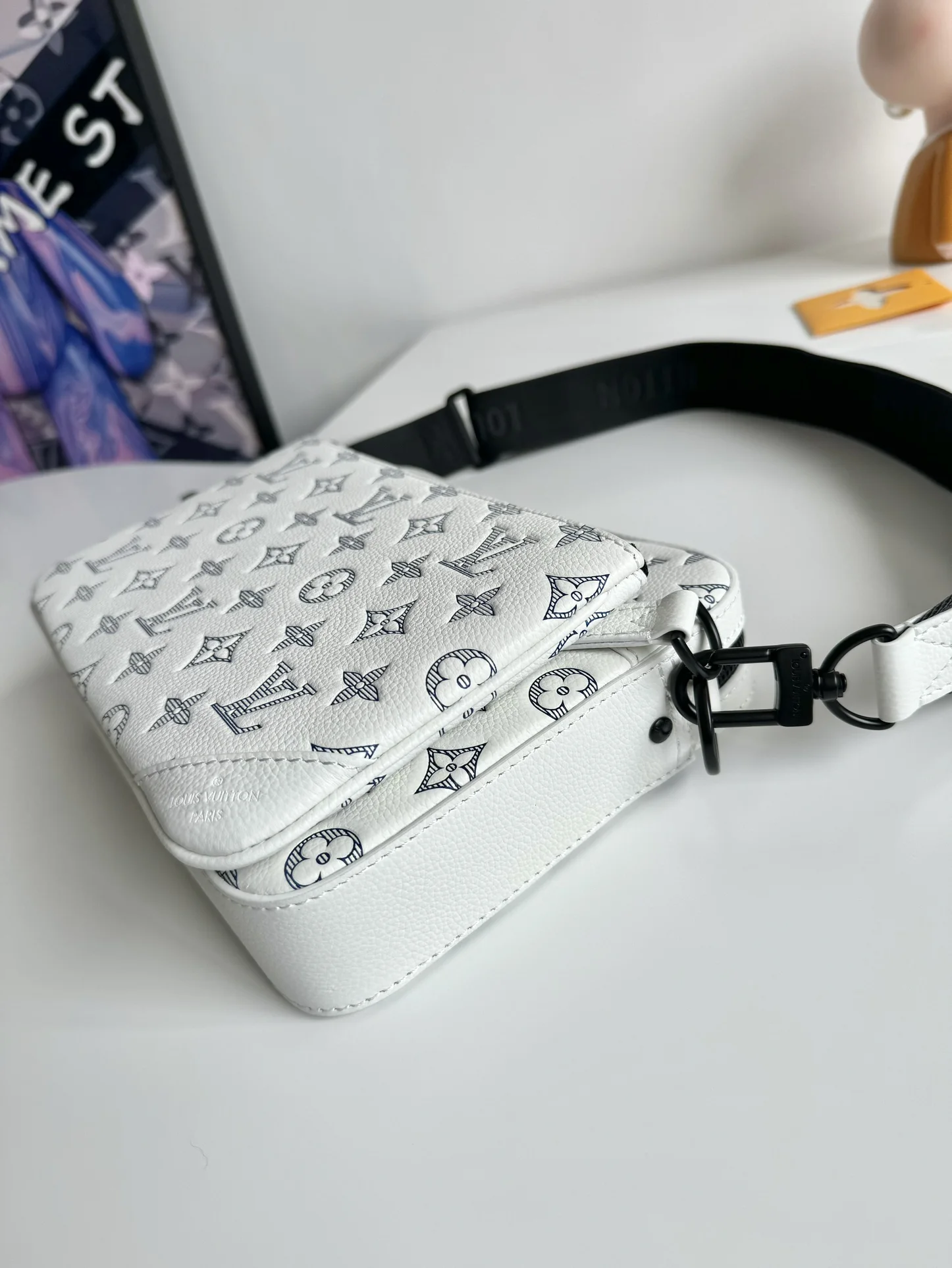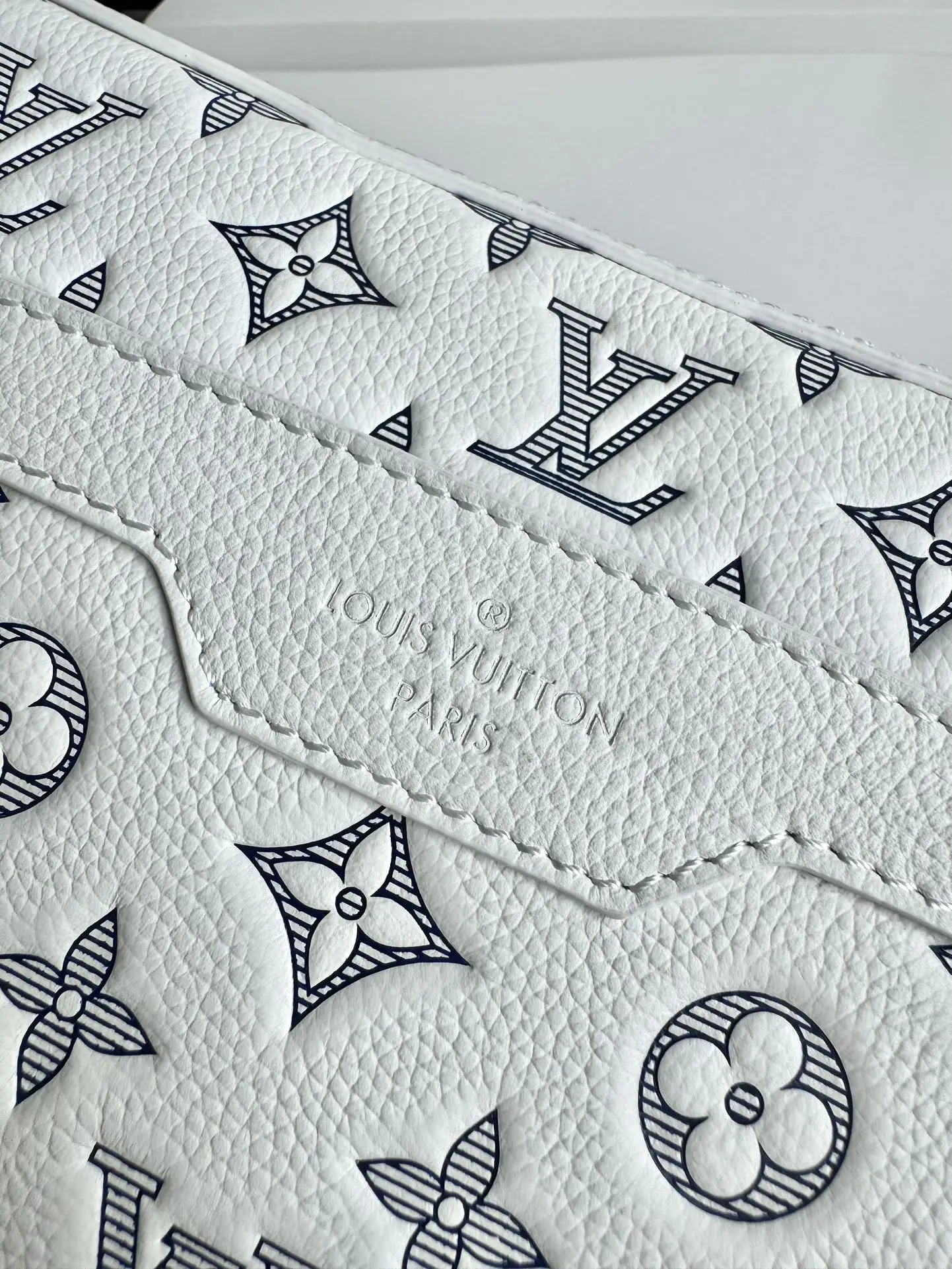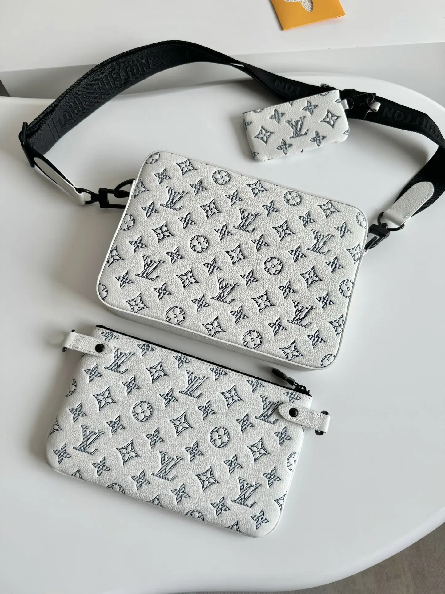 海外原单M24754独家实拍 本款 Trio 邮差包取材 Monogram Shadow 牛皮革 先后采用压印和印花工艺描绘 Monogram 图案 以哑光效果彰显俊朗气息 零包 主隔层和可拆卸前袋均可单独使用 实现三合一功能 尺寸 25×18.5×7cm
