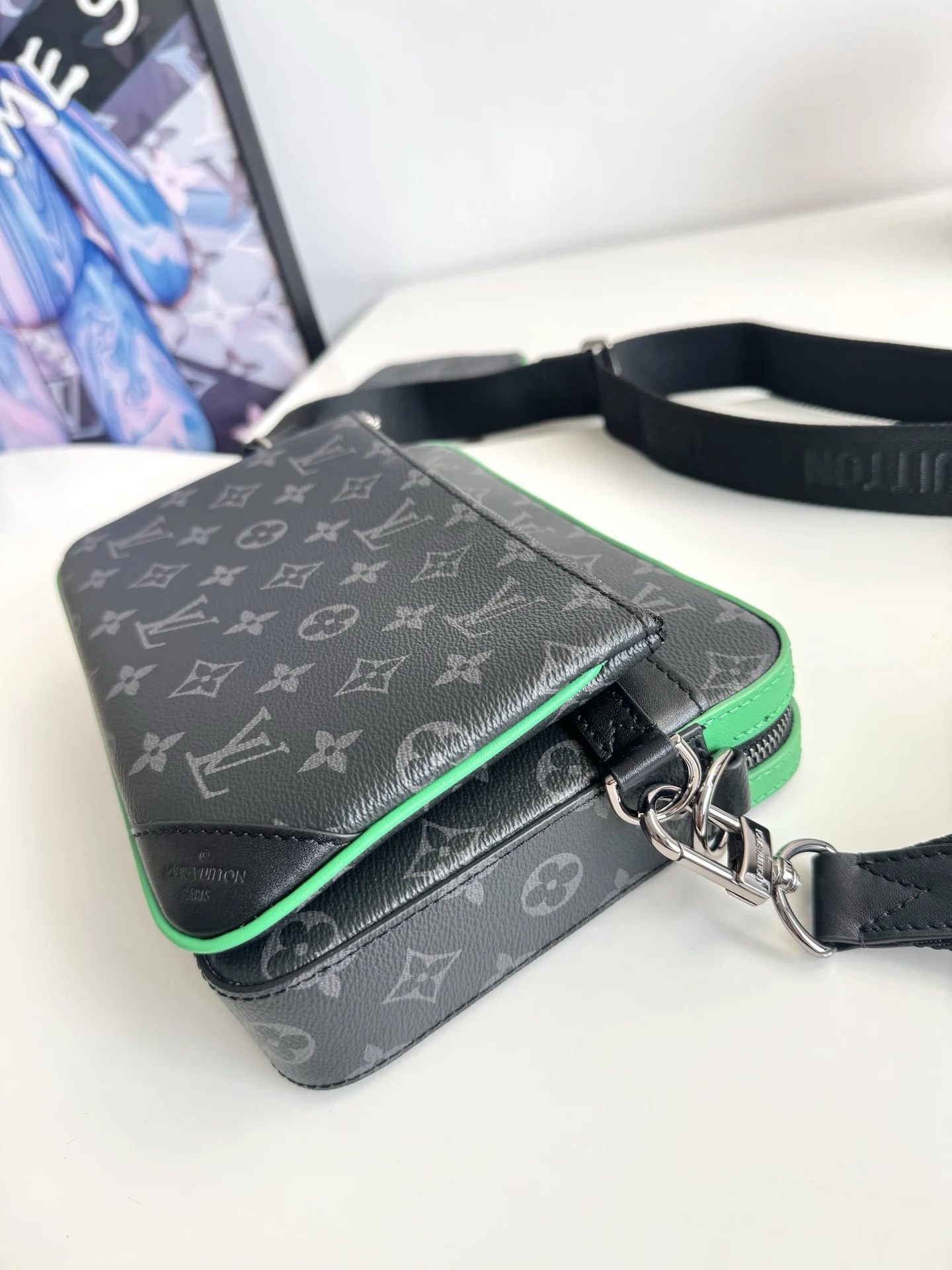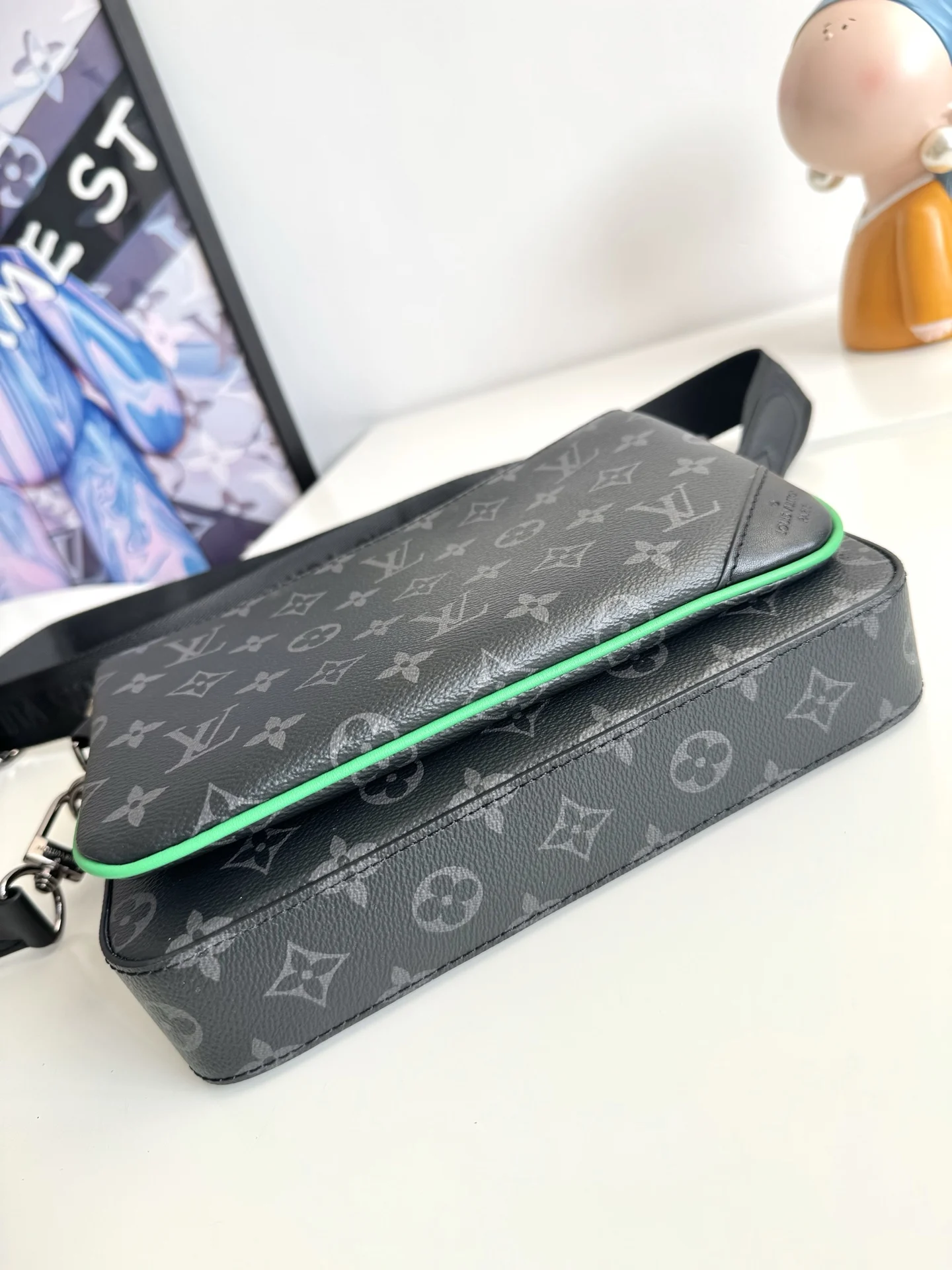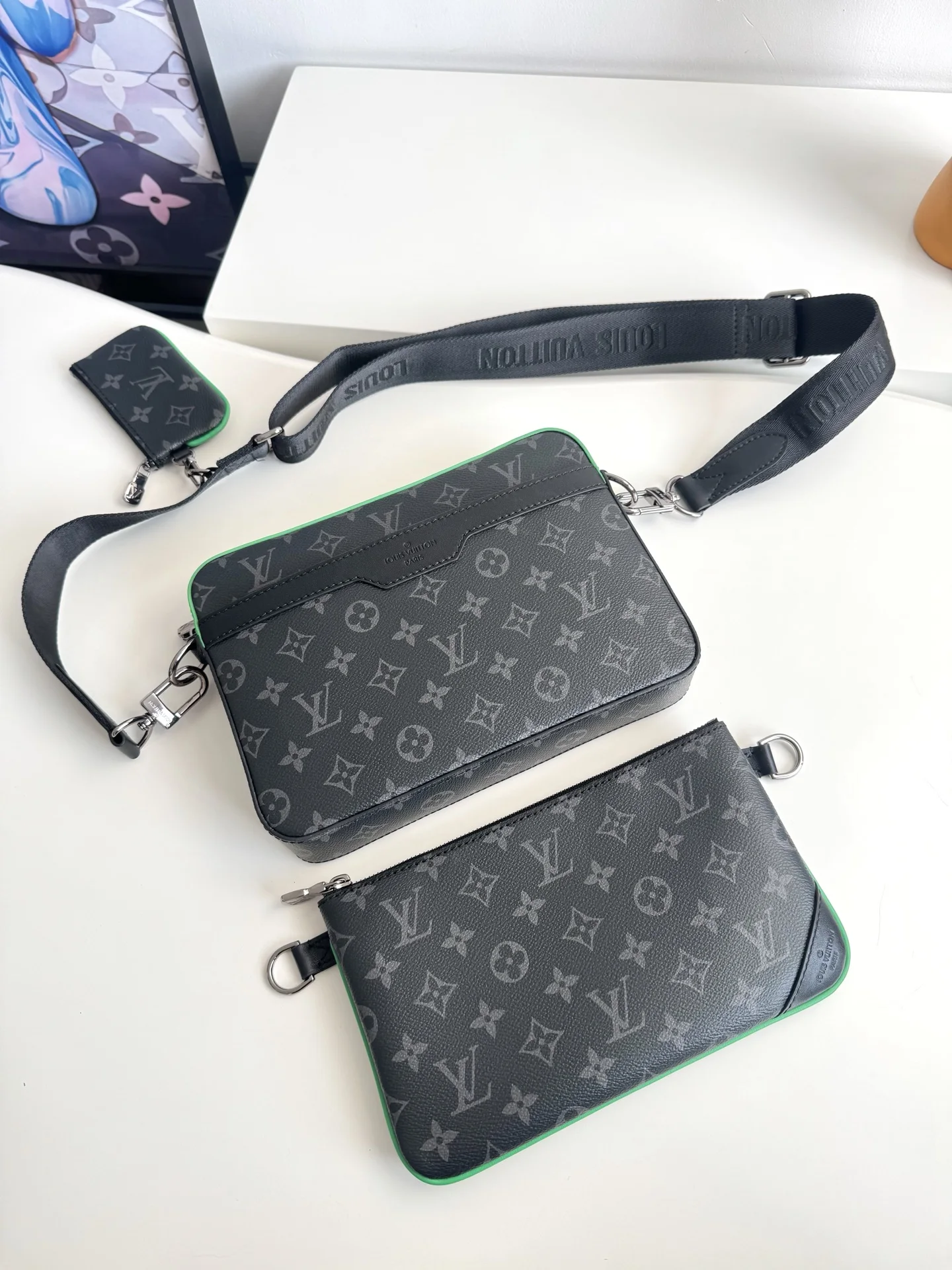 海外原单M26052独家实拍 本款 Trio 邮差包取材 Monogram Eclipse 涂层帆布 以鲜明牛皮革彰显摩登风尚 拉链前袋固定于主隔层 肩带处配有小号零包 二者均可取下单独使用 尺寸 25×18.5×7cm
