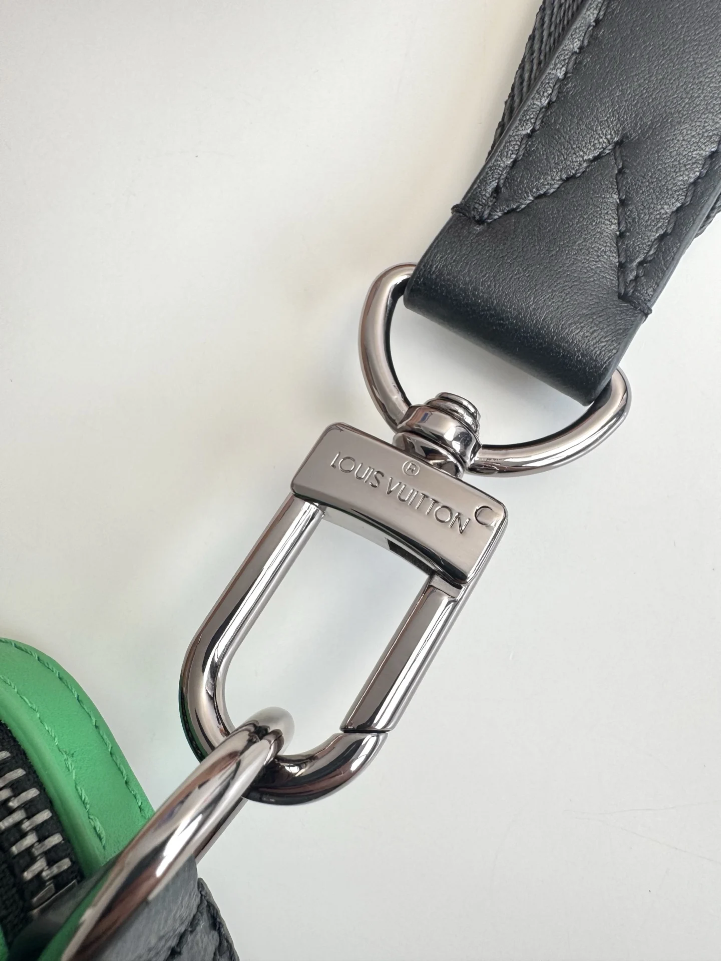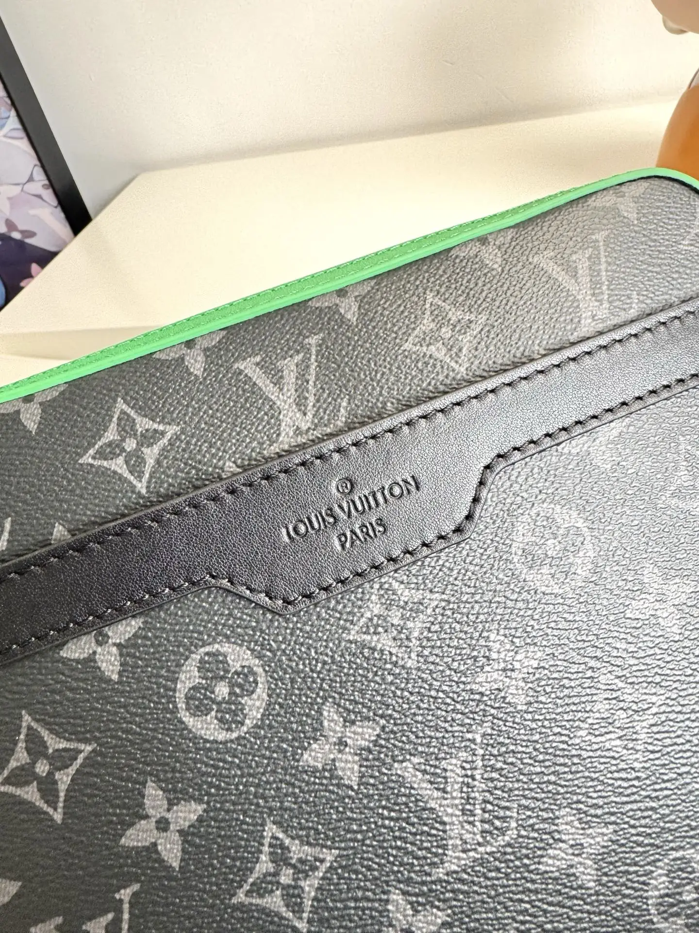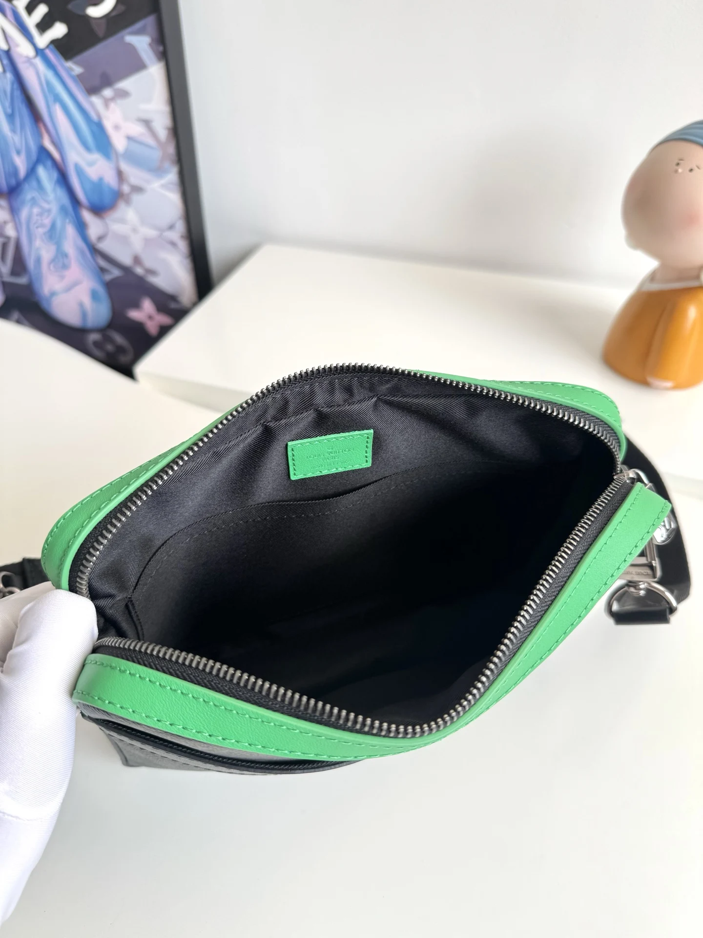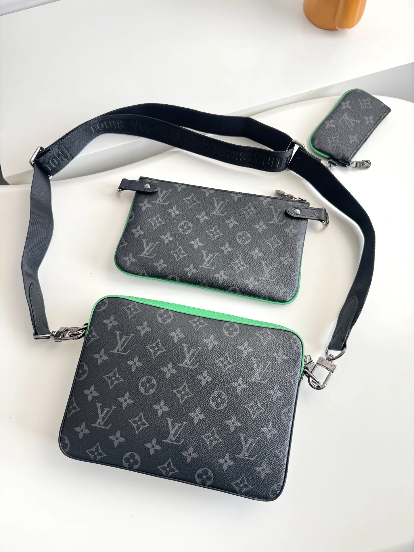 海外原单M26052独家实拍 本款 Trio 邮差包取材 Monogram Eclipse 涂层帆布 以鲜明牛皮革彰显摩登风尚 拉链前袋固定于主隔层 肩带处配有小号零包 二者均可取下单独使用 尺寸 25×18.5×7cm