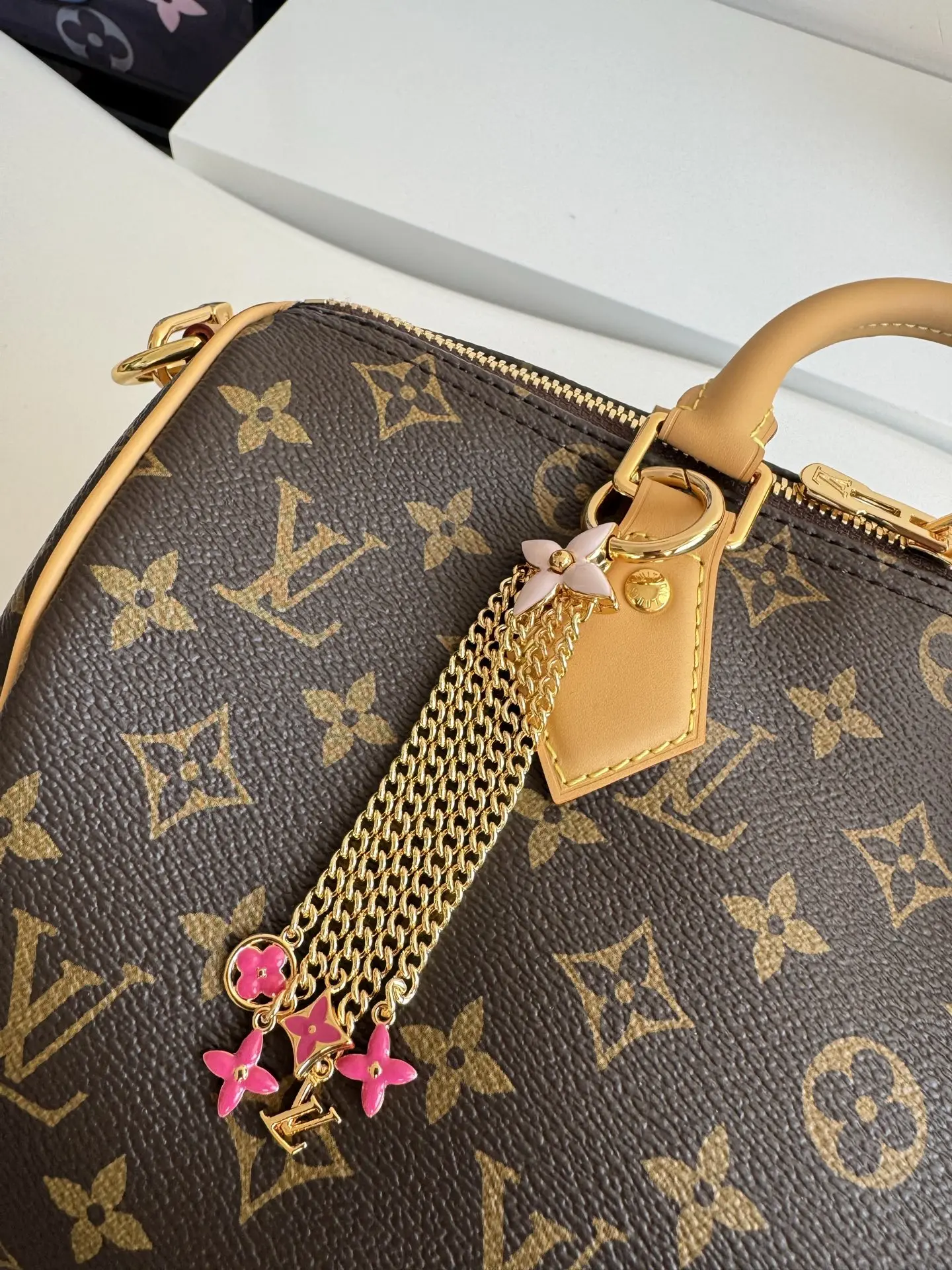 海外原单M26498独家实拍 路易比通特别设计的Speedy Soft Bandouliere 30 将愉悦的感觉和传统素结合起来 重新诠释了标志性的风格 象征性的单体帆布材质设计 加上色彩缤纷的皮革材质的带子 以象征好运和永恒青春的韩国诺丽盖为灵感的香菜等多种真饰品为特色 尺寸 30×21×17cm