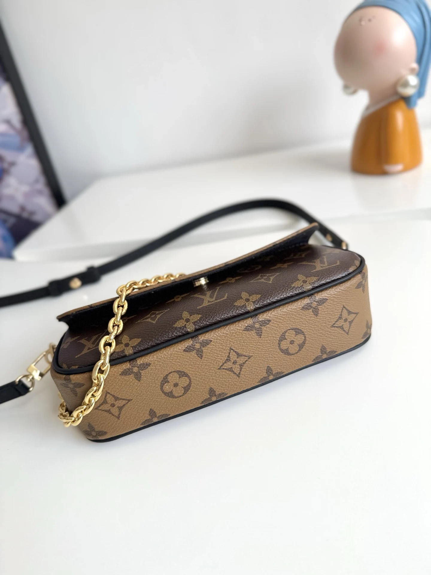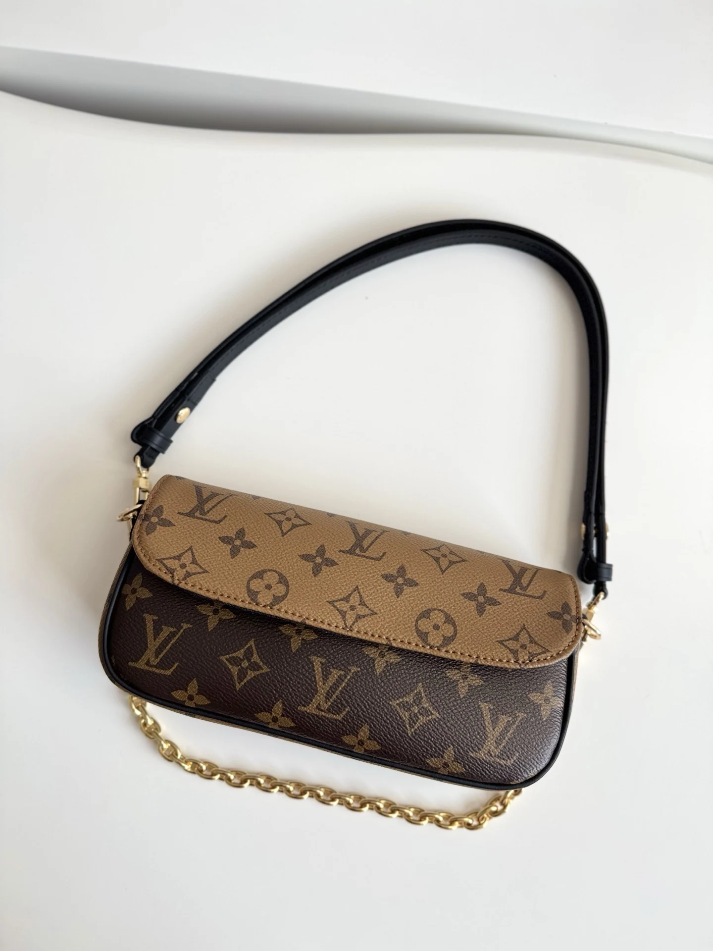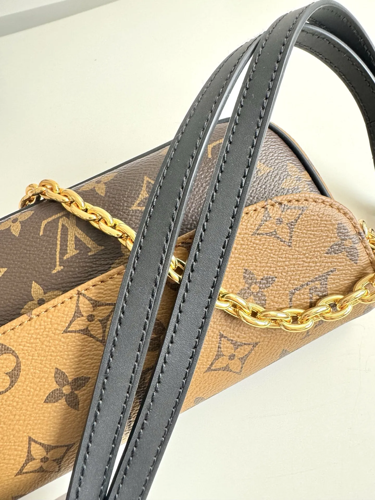 海外原单M26587独家实拍 本款 Wallet On Chain Ivy 手袋取材 Monogram Reverse 帆布 巧妙展现当季定向思维 可拆卸金属链条与 LV 字母相得益彰 齐整内里设有贴袋和卡位 可稳妥收纳日常所需 尺寸23.5×12×4cm