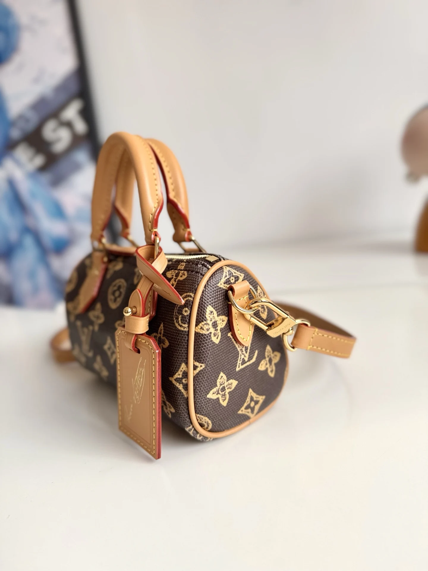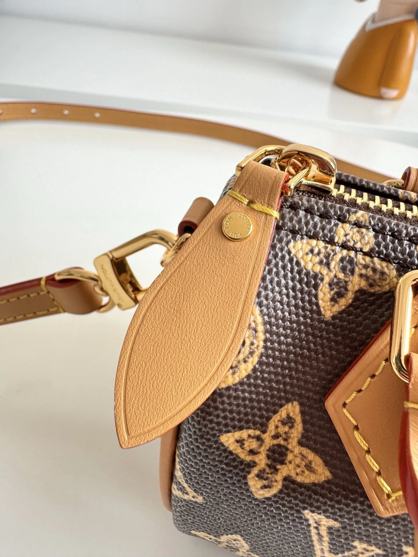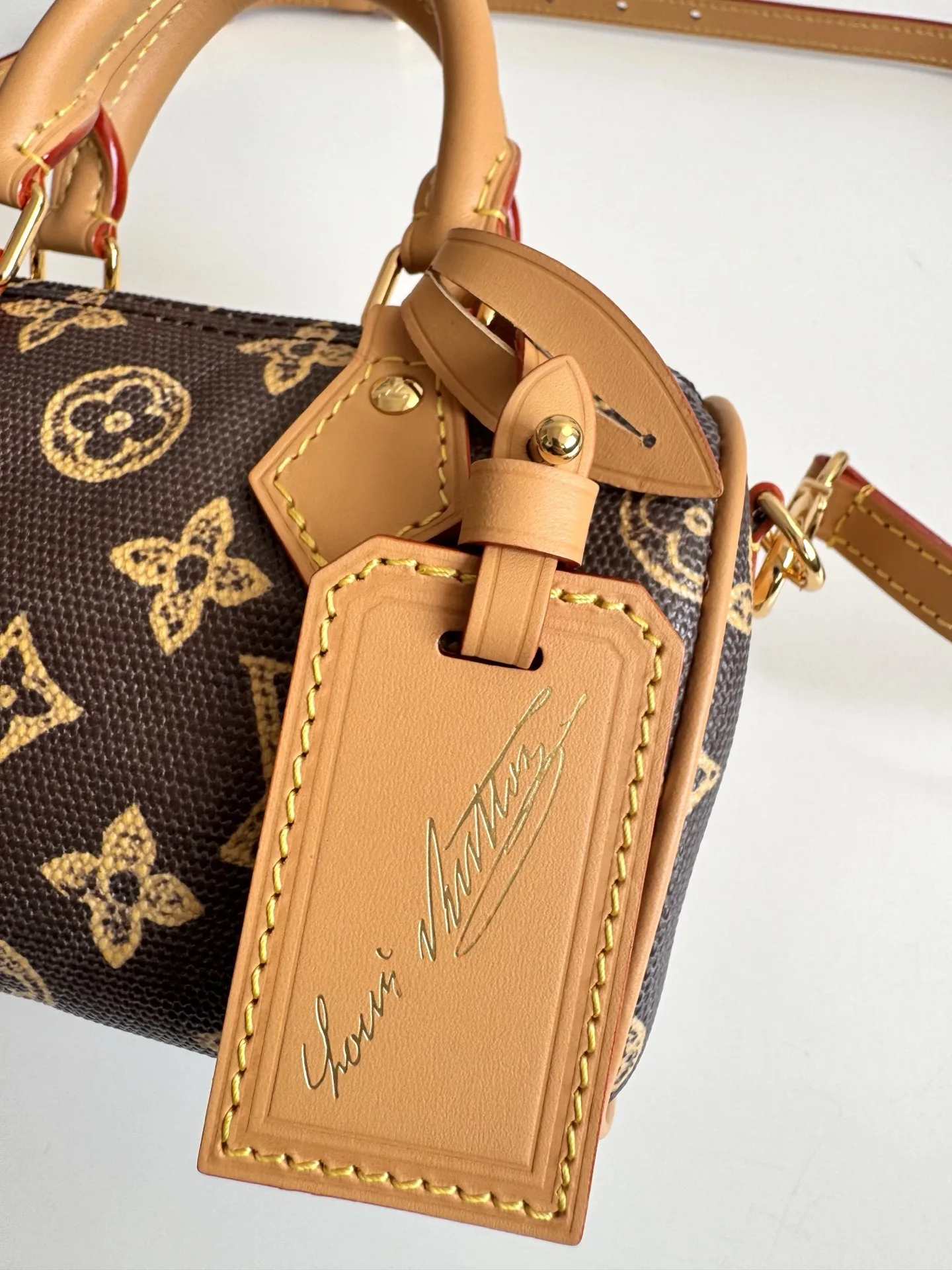 海外原单M27610独家实拍 经典 Nano Speedy 手袋为庆贺路易威登 Monogram 图案的 130 岁诞辰 此次选择以 Monogram Origine 帆布塑造雅致构型 搭配金属件和庆贺系列专属标签 取下肩带即可手提 可容纳小号夹等日常所需 尺寸 16×10×7.5cm