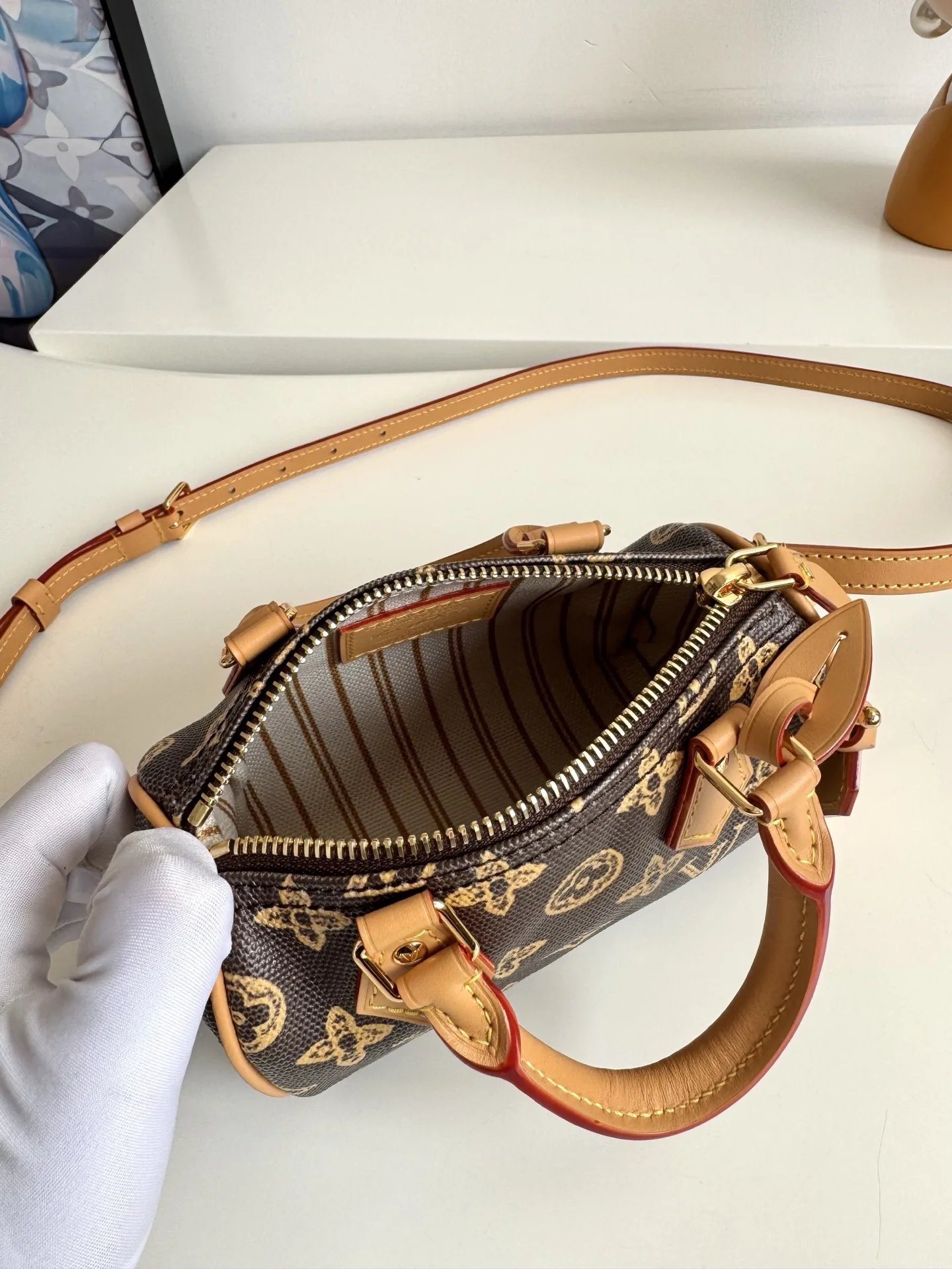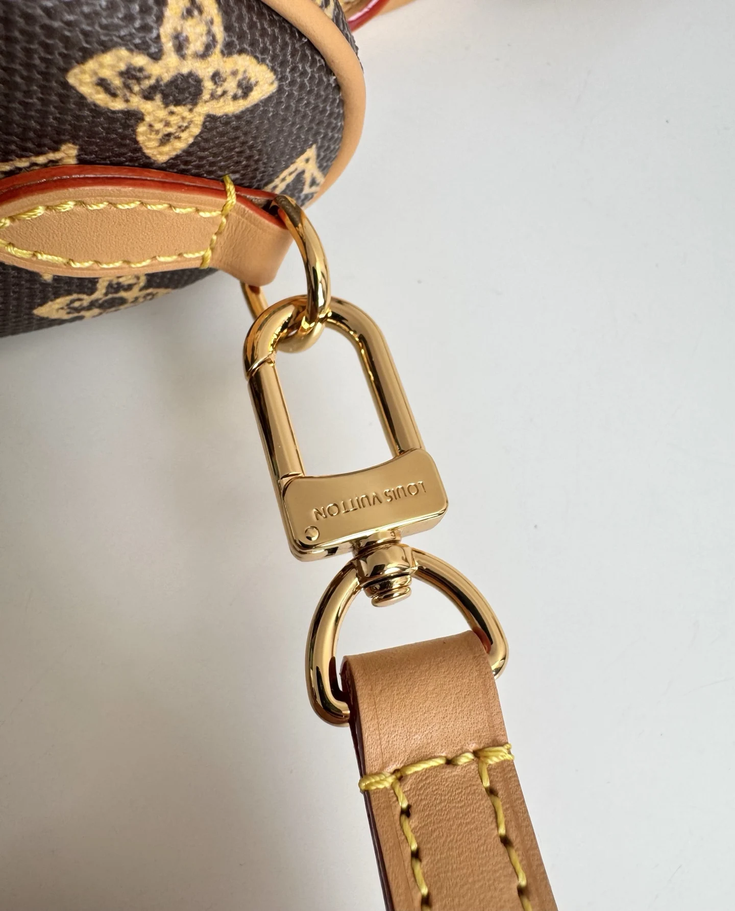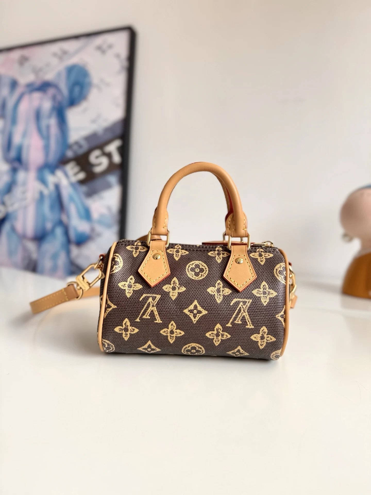 海外原单M27610独家实拍 经典 Nano Speedy 手袋为庆贺路易威登 Monogram 图案的 130 岁诞辰 此次选择以 Monogram Origine 帆布塑造雅致构型 搭配金属件和庆贺系列专属标签 取下肩带即可手提 可容纳小号夹等日常所需 尺寸 16×10×7.5cm