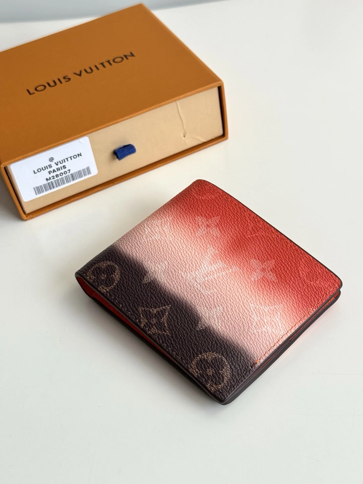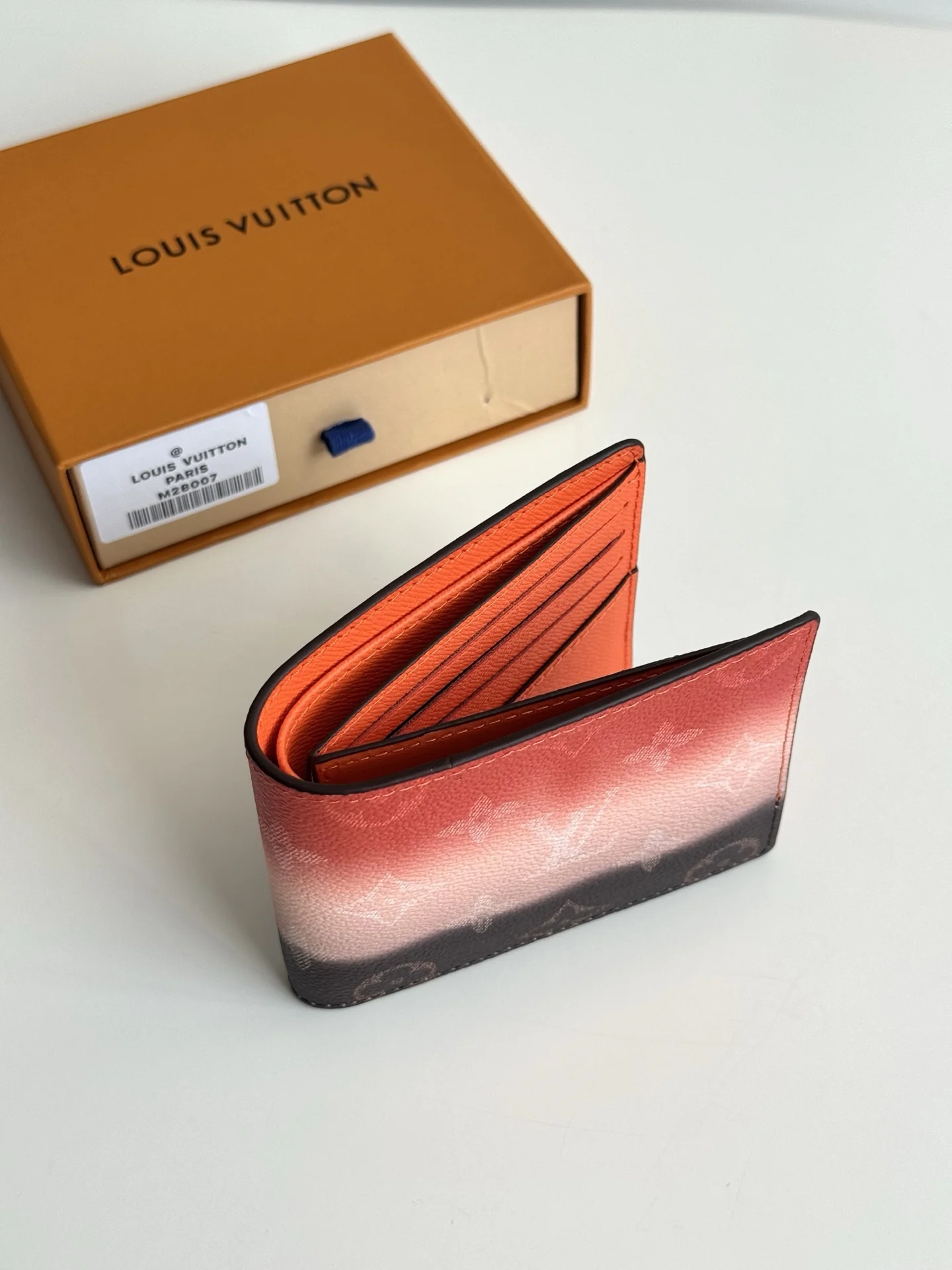 海外原单M28007独家实拍 本款 Slender 夹取材渐变效果 Monogram Pigment 涂层帆布 令色彩自上而下地浓淡变幻 并优雅过渡至底部的经典 Monogram 图案 柔软牛皮革内里设有卡片夹层和票据隔层 纤巧构型可轻松收入多数口袋 尺寸 11×8.5×2cm
