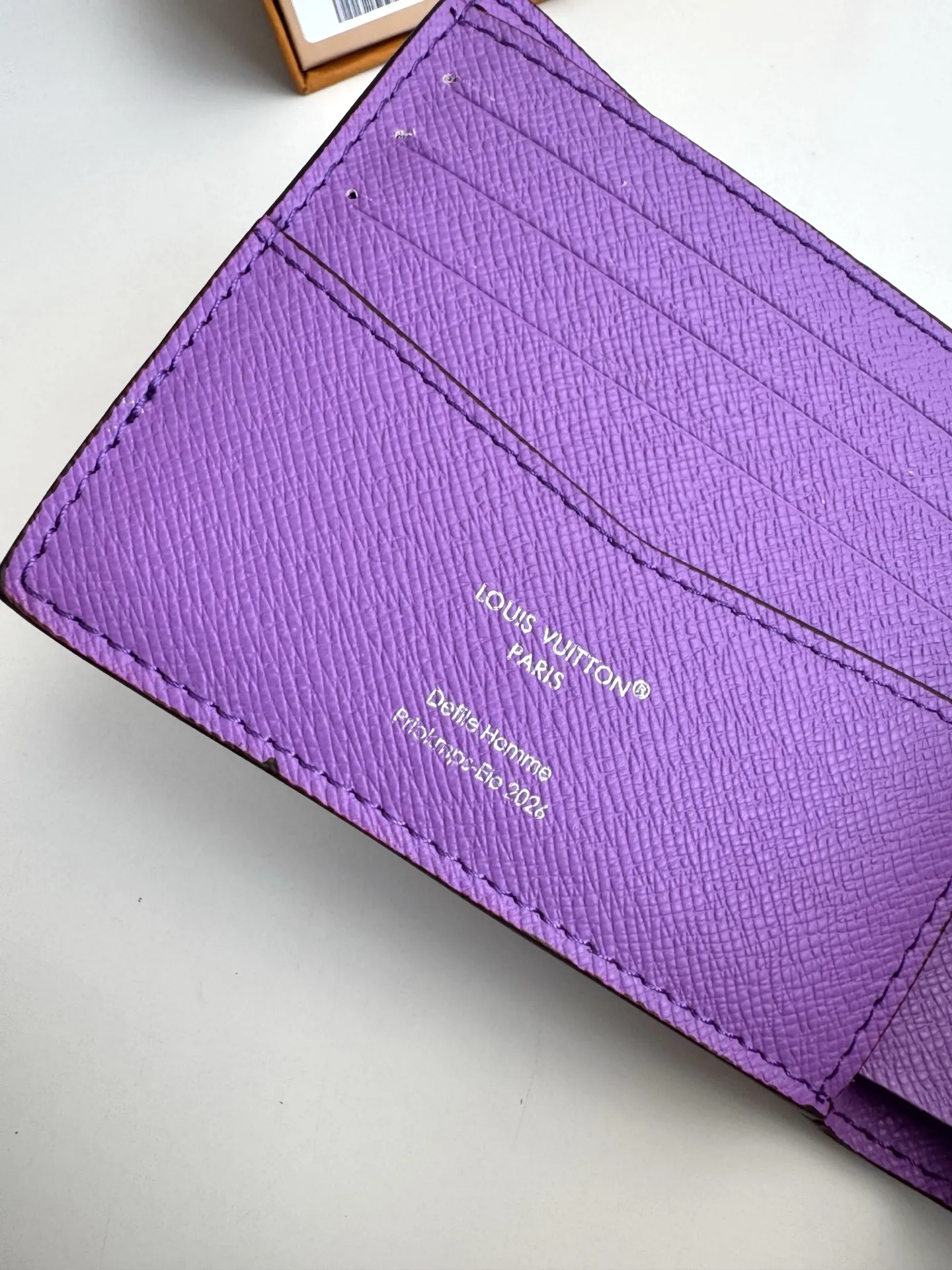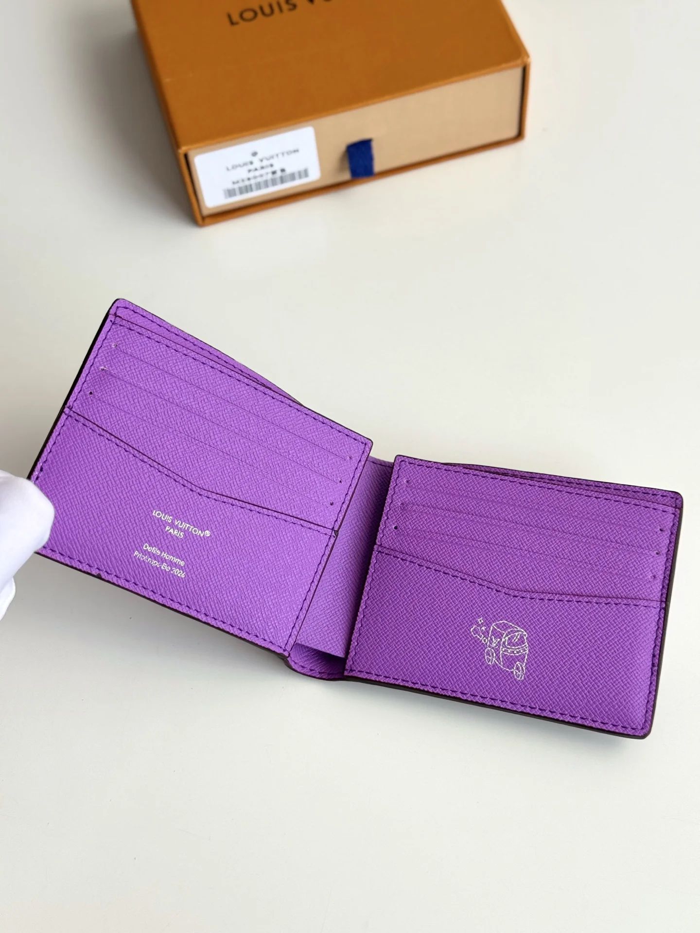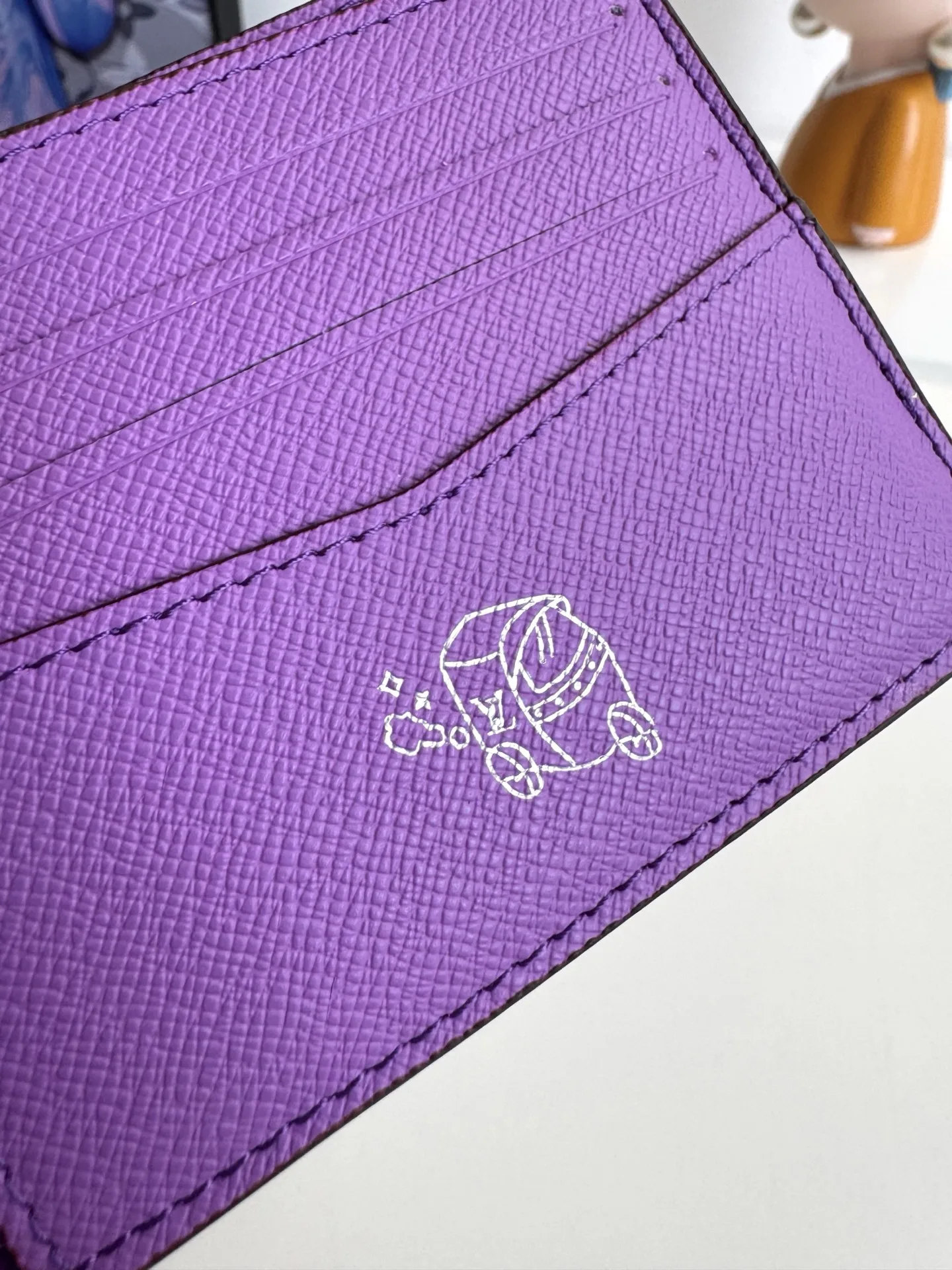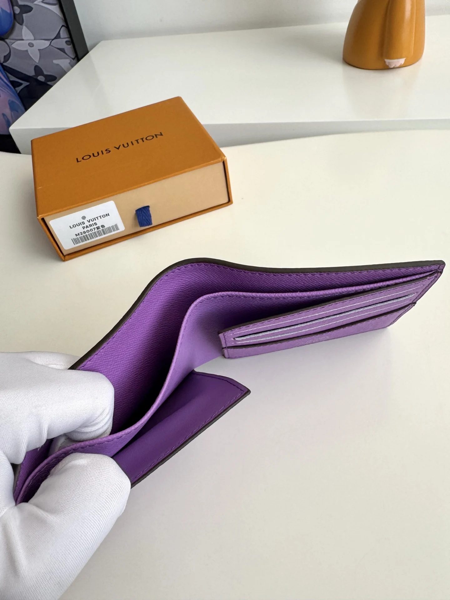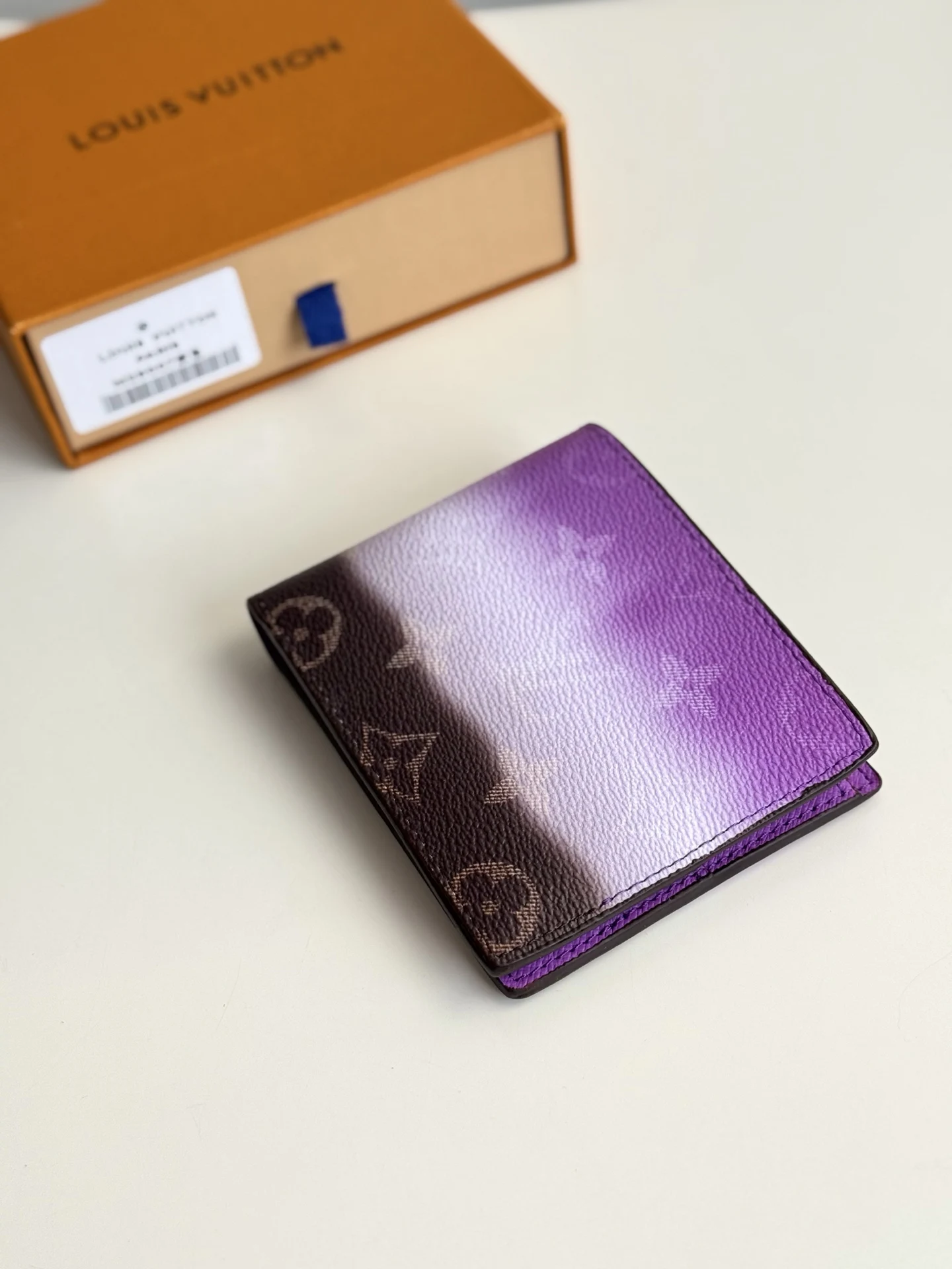 海外原单M28007紫独家实拍 本款 Slender 夹取材渐变效果 Monogram Pigment 涂层帆布 令色彩自上而下地浓淡变幻 并优雅过渡至底部的经典 Monogram 图案 柔软牛皮革内里设有卡片夹层和票据隔层 纤巧构型可轻松收入多数口袋 尺寸 11×8.5×2cm