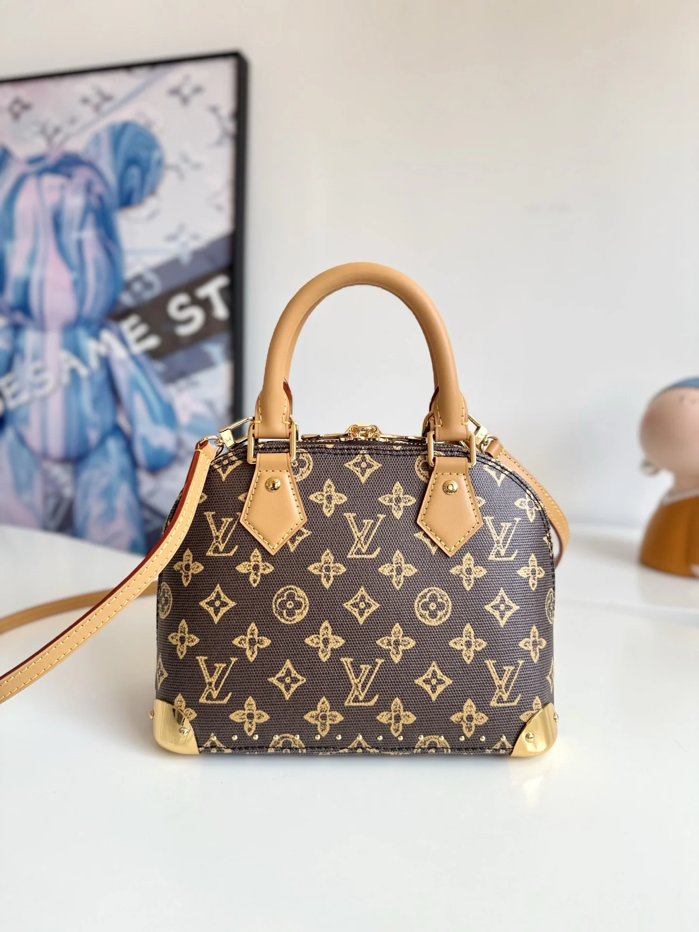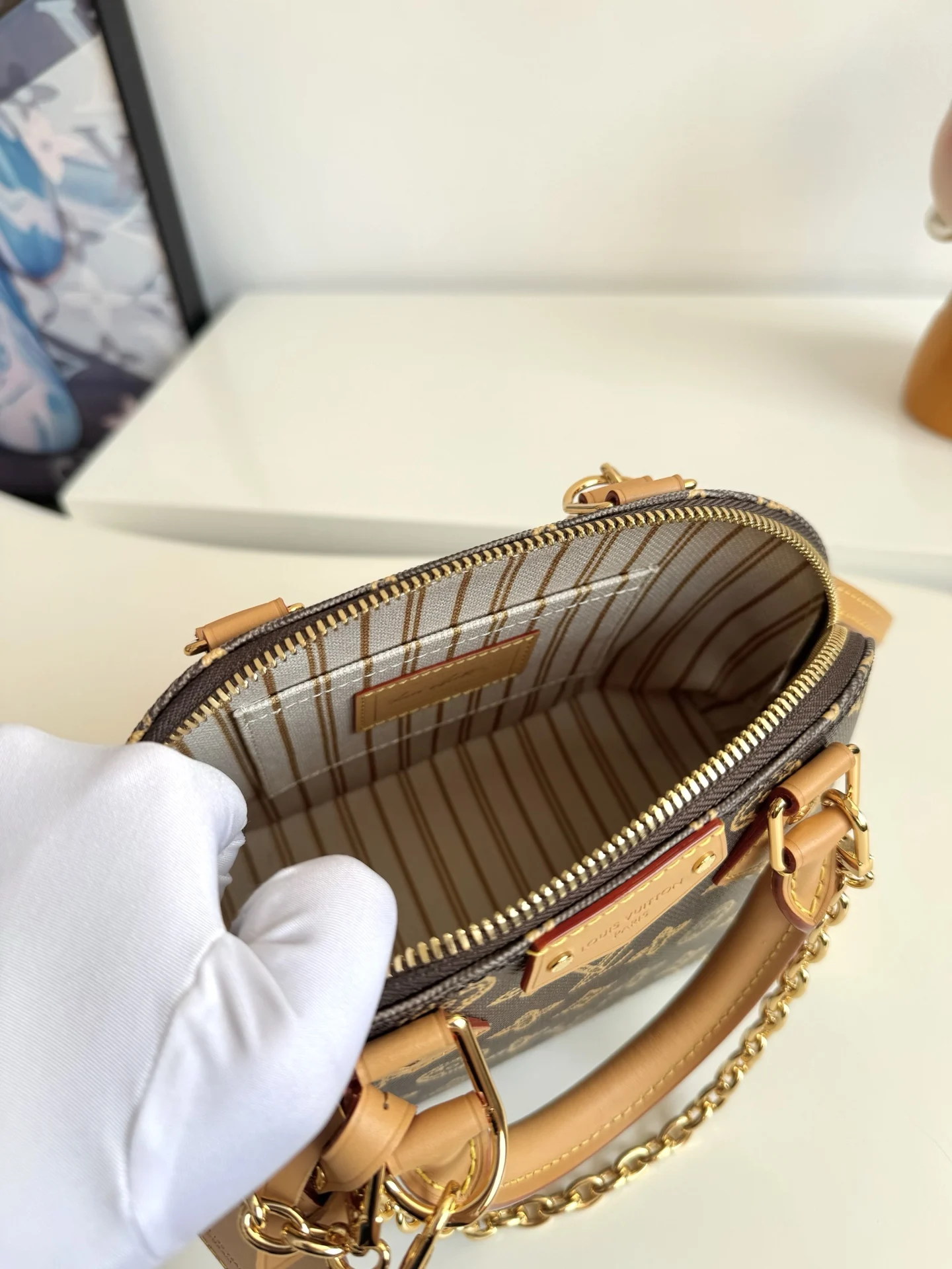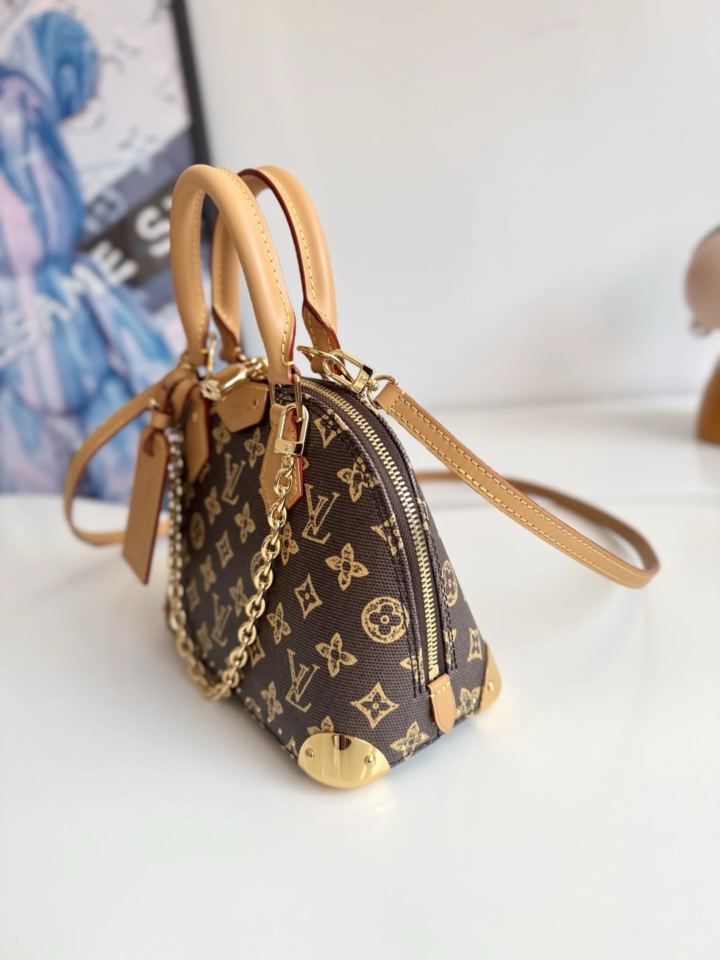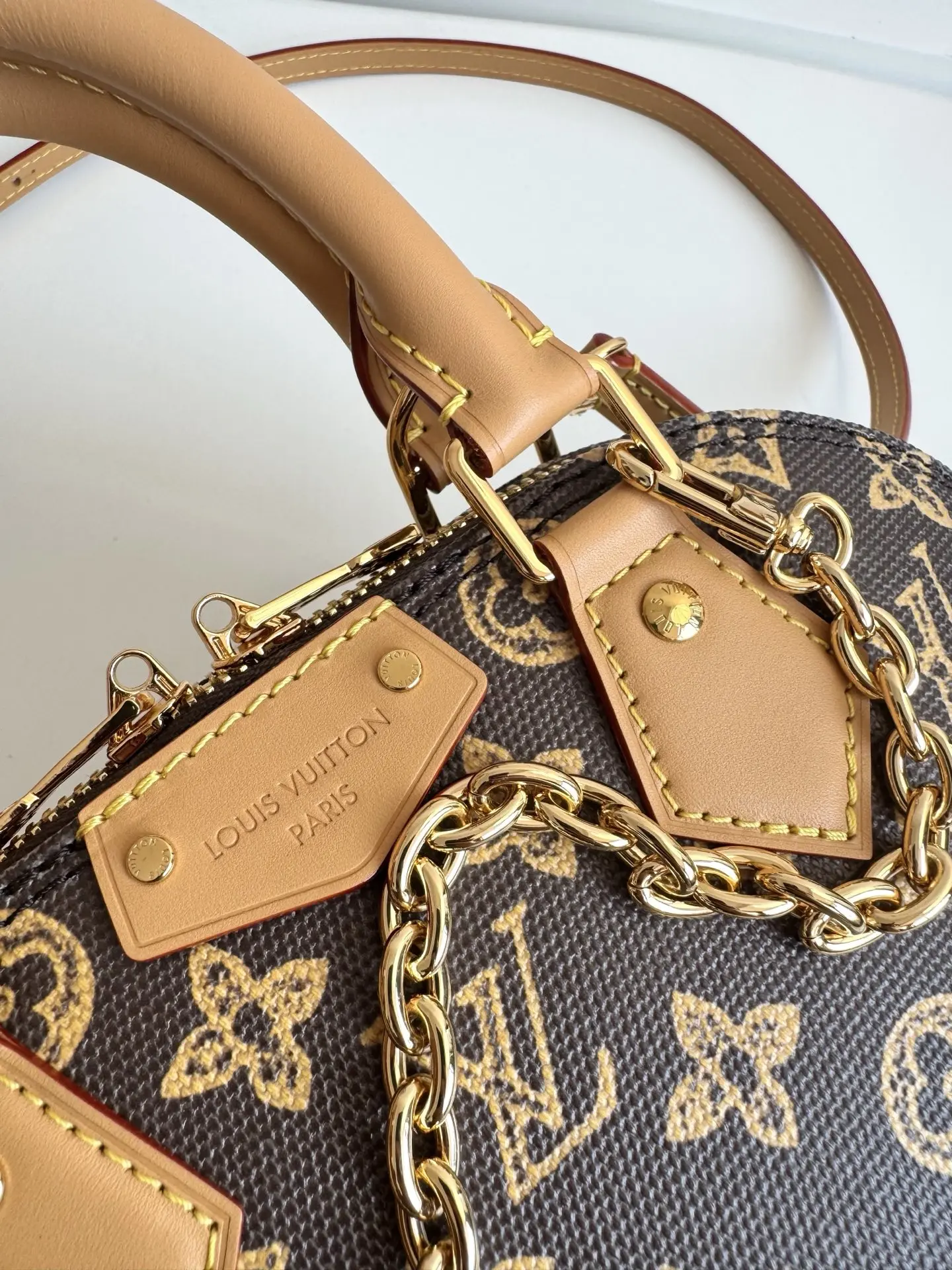 海外原单M28105独家实拍 本款 Alma Trunk BB 手袋向路易威登 1908 年的典藏设计汲取灵感 将传统素焕新为 Monogram Origine 图案 与链条 挂锁和金属包角互为映衬 紧凑构型方便手提 肩背或斜挎 尺寸 22×19×11cm