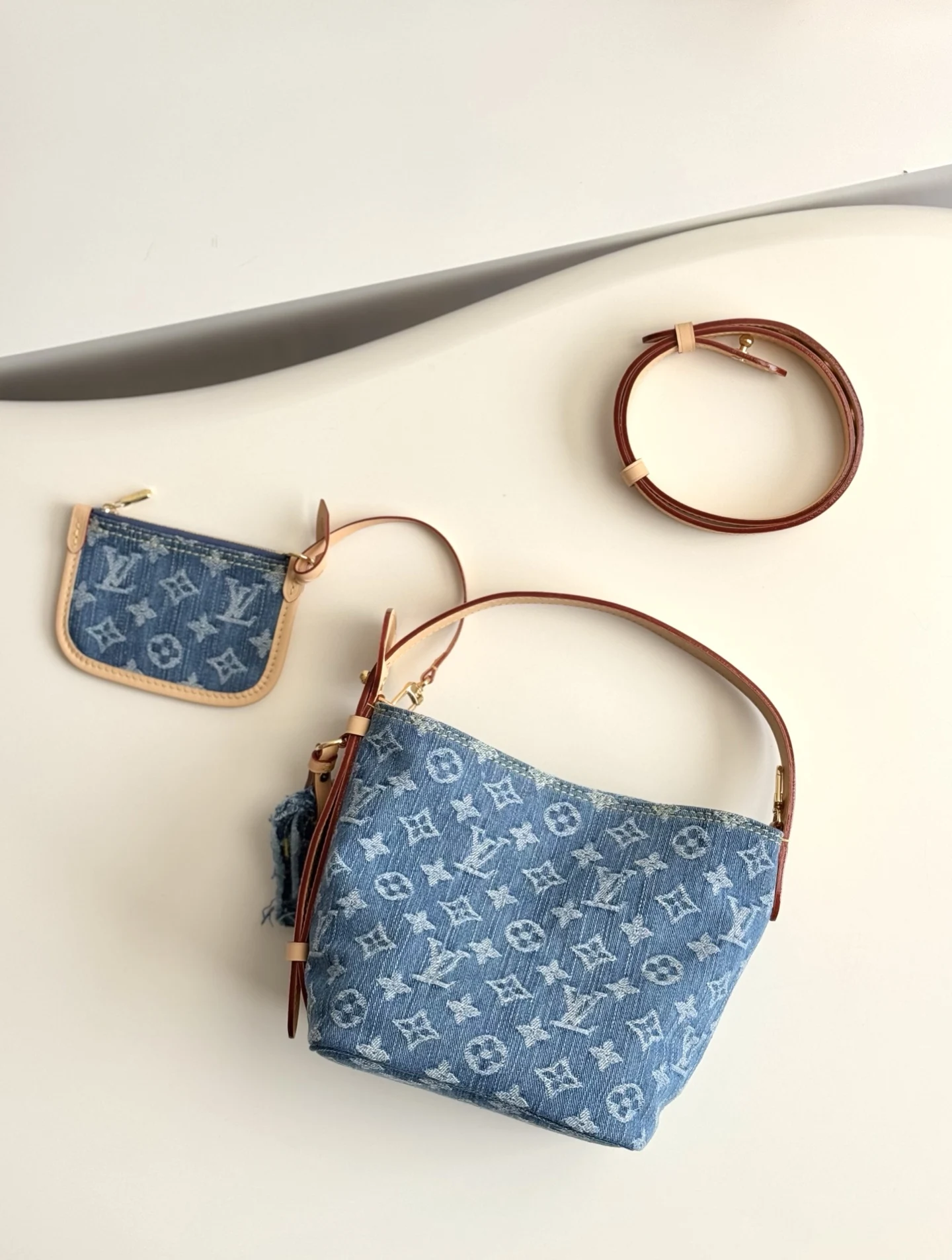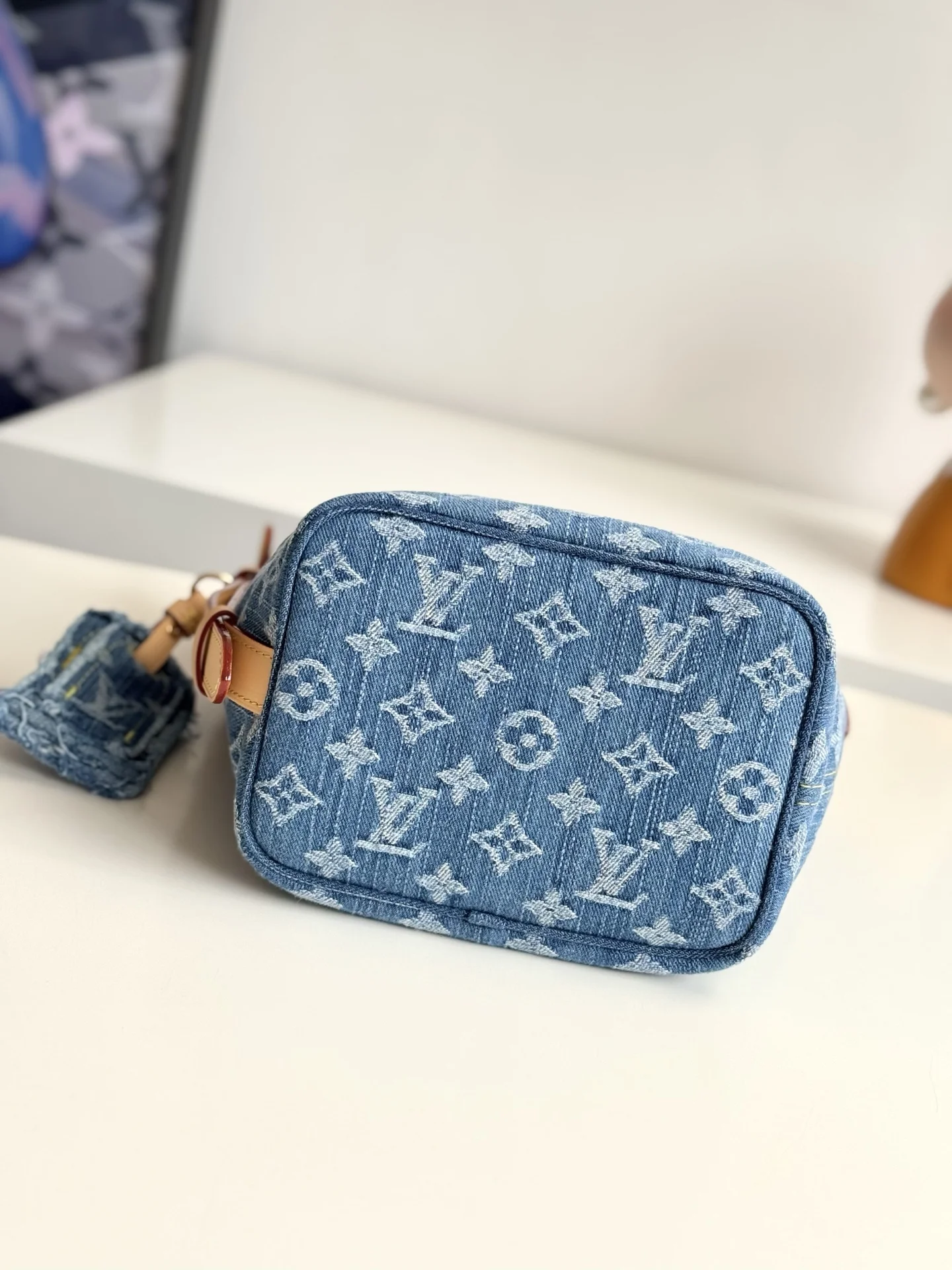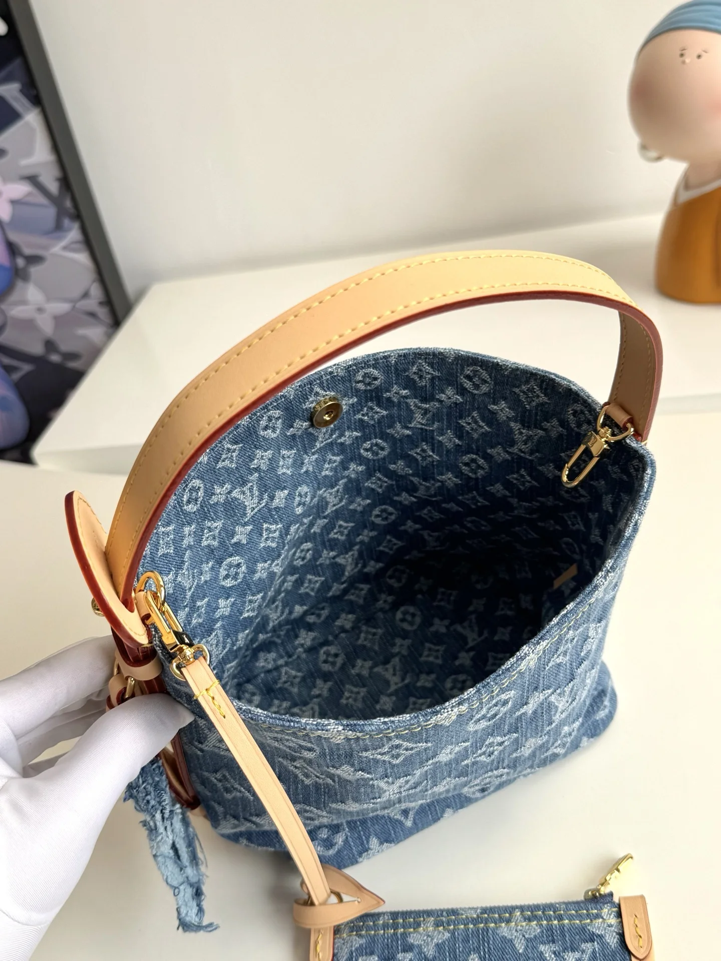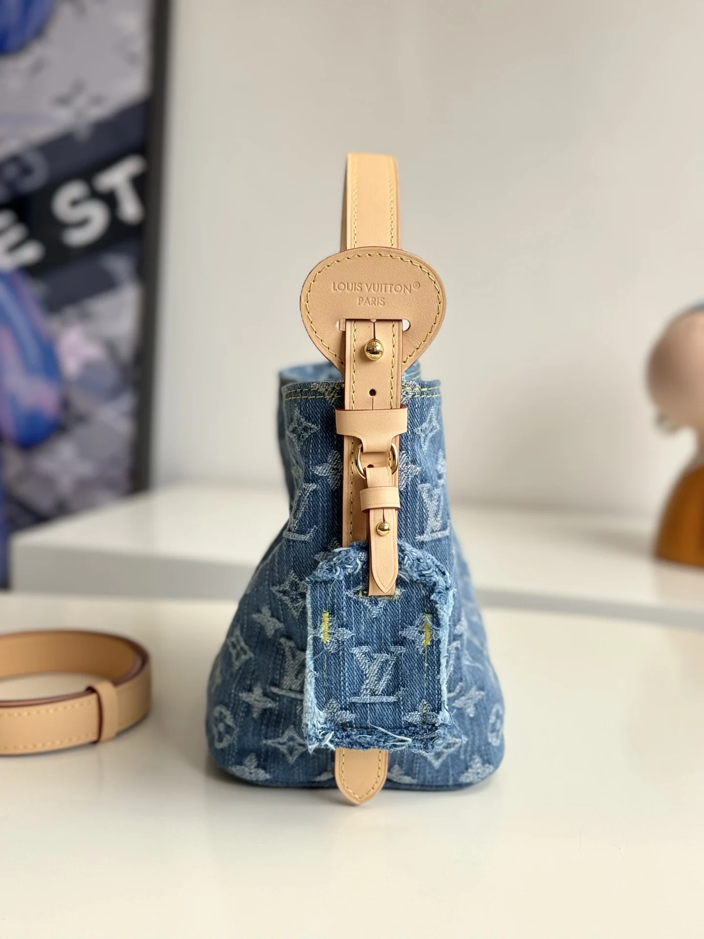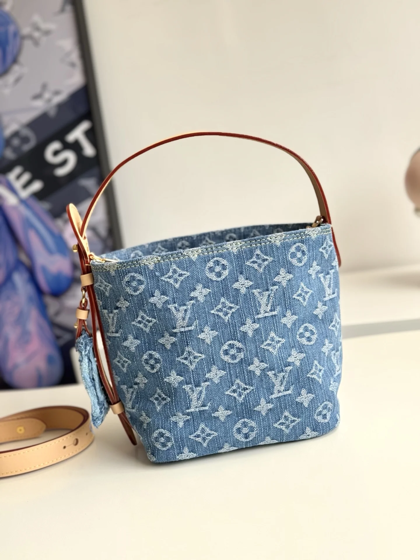 海外原单M28107独家实拍 All In BB 手袋取材丹宁布焕新呈现 为 Denim Rendez-Vous 系列添注现代洒脱气息 水桶包构型巧搭撞色皮革饰边与标志性 LV 名牌 致意路易威登典藏硬箱 百搭设计实现多种背携方式 可拆卸拉链内袋增添实用巧思 尺寸 18×16×12cm