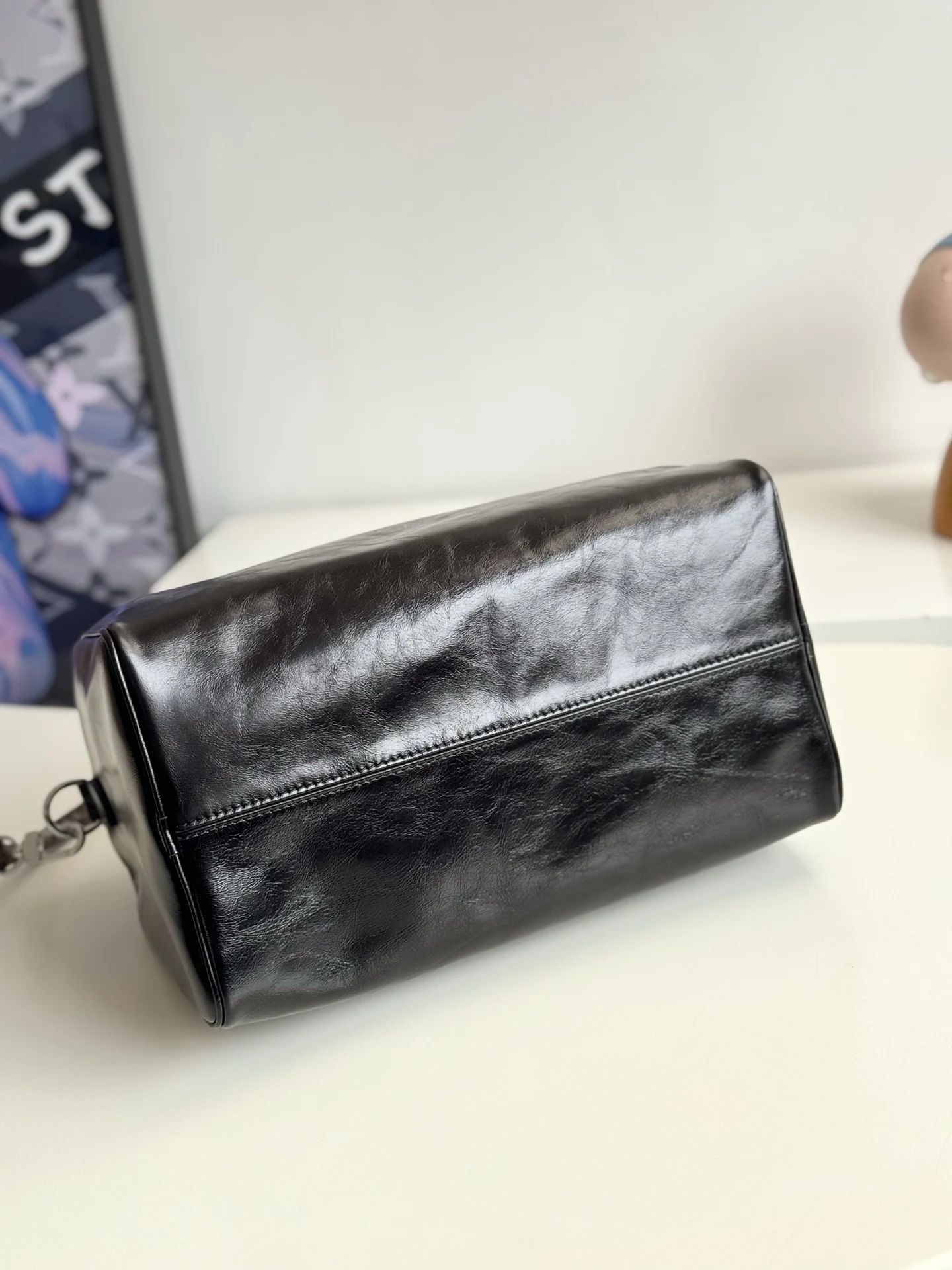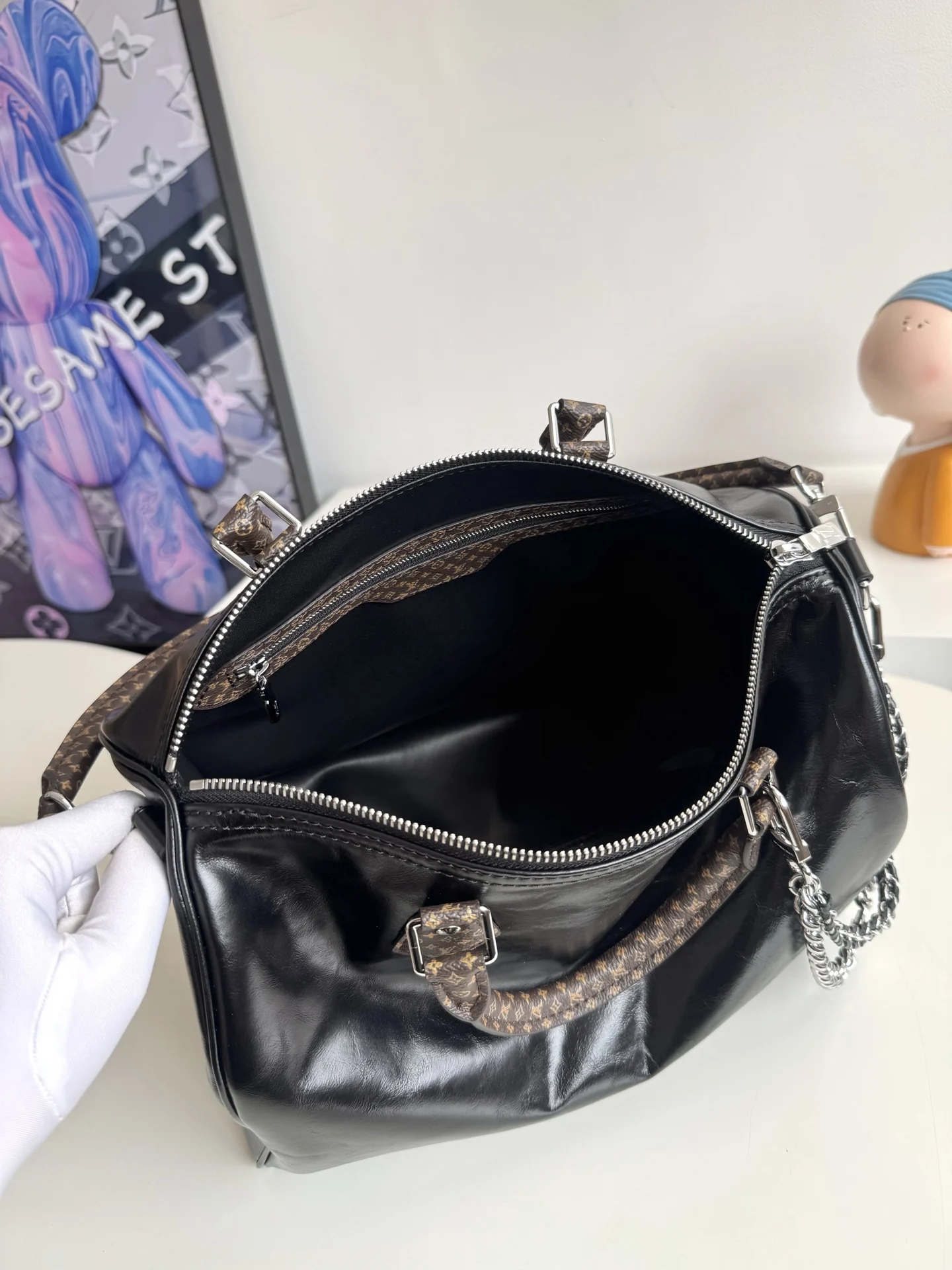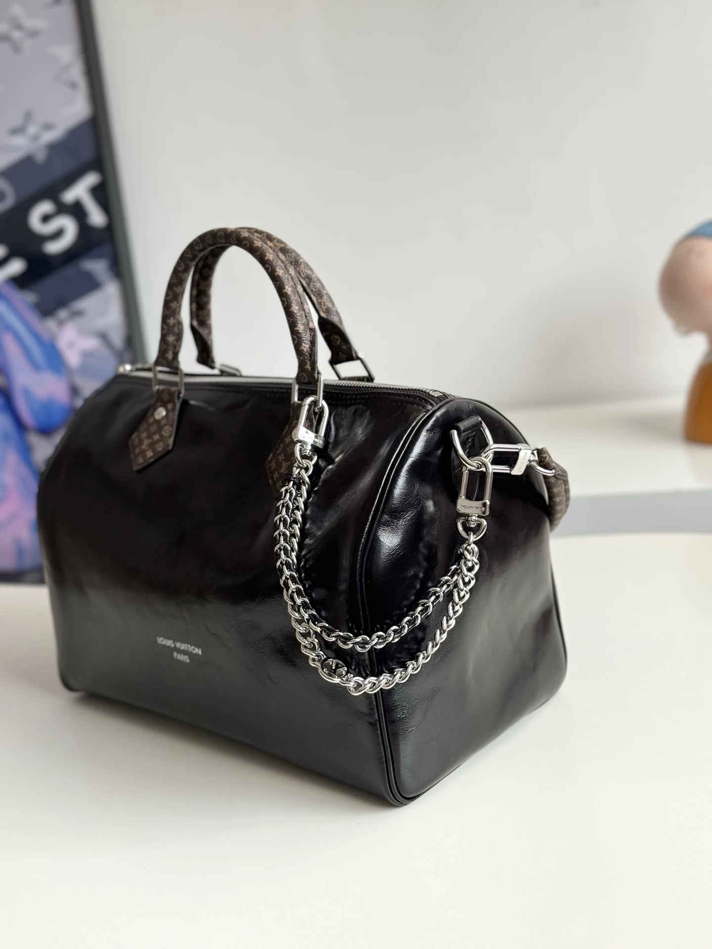 海外原单M29419独家实拍 本款 Speedy Soft 30 手袋质感轻盈 以潮酷摇滚风格演绎经典设计 打造时尚瞩目的个性之作 采用光泽感褶皱皮革精制 搭配迷你 Monogram 图案帆布饰边 专为都市生活而设计 背携方式多样 独具一格的链条点缀 LV Circle 标识 平添考究格调 充裕空间可容纳笔记本电脑等日常所需 尺寸 30×21×17cm