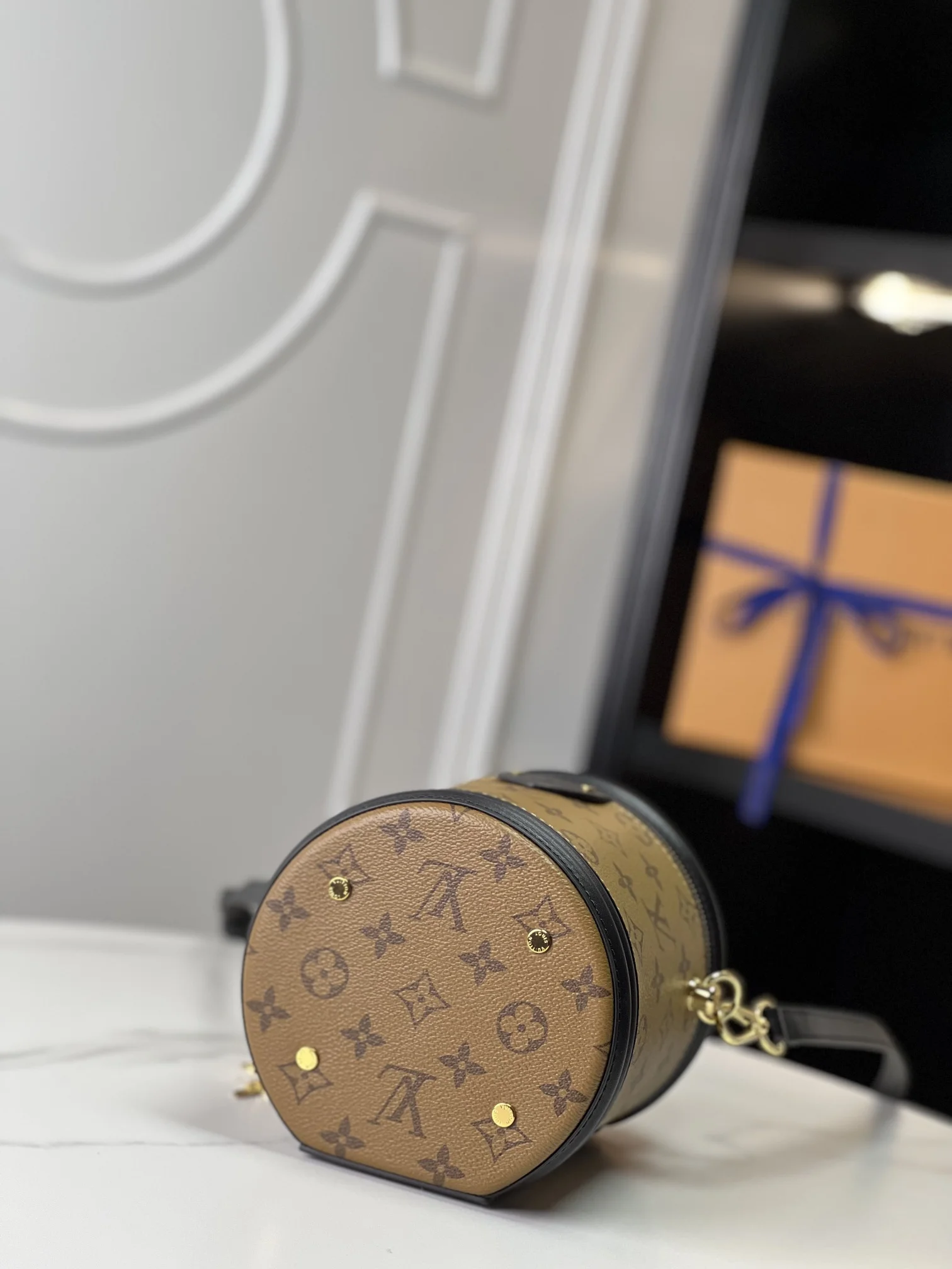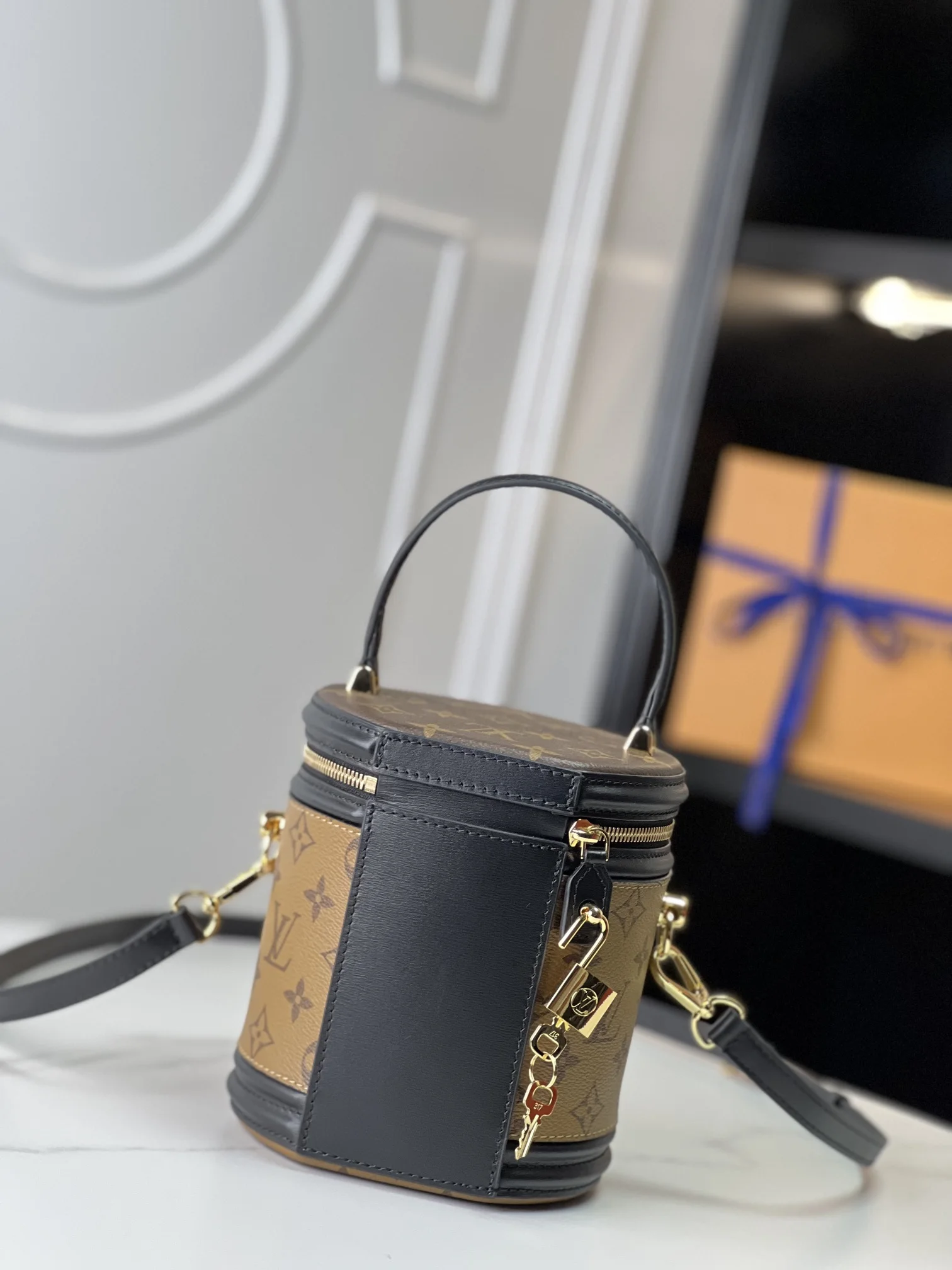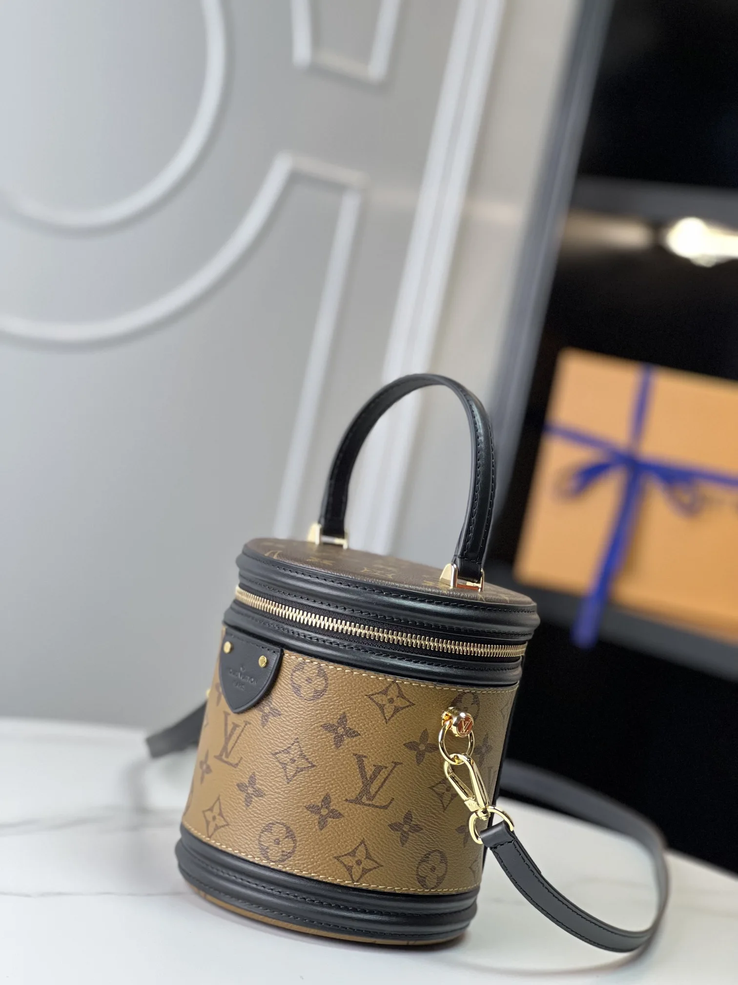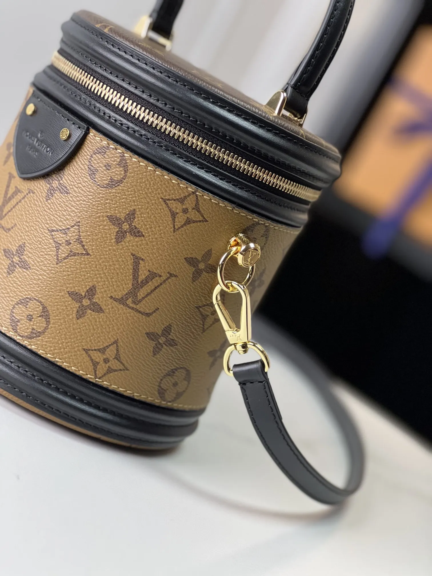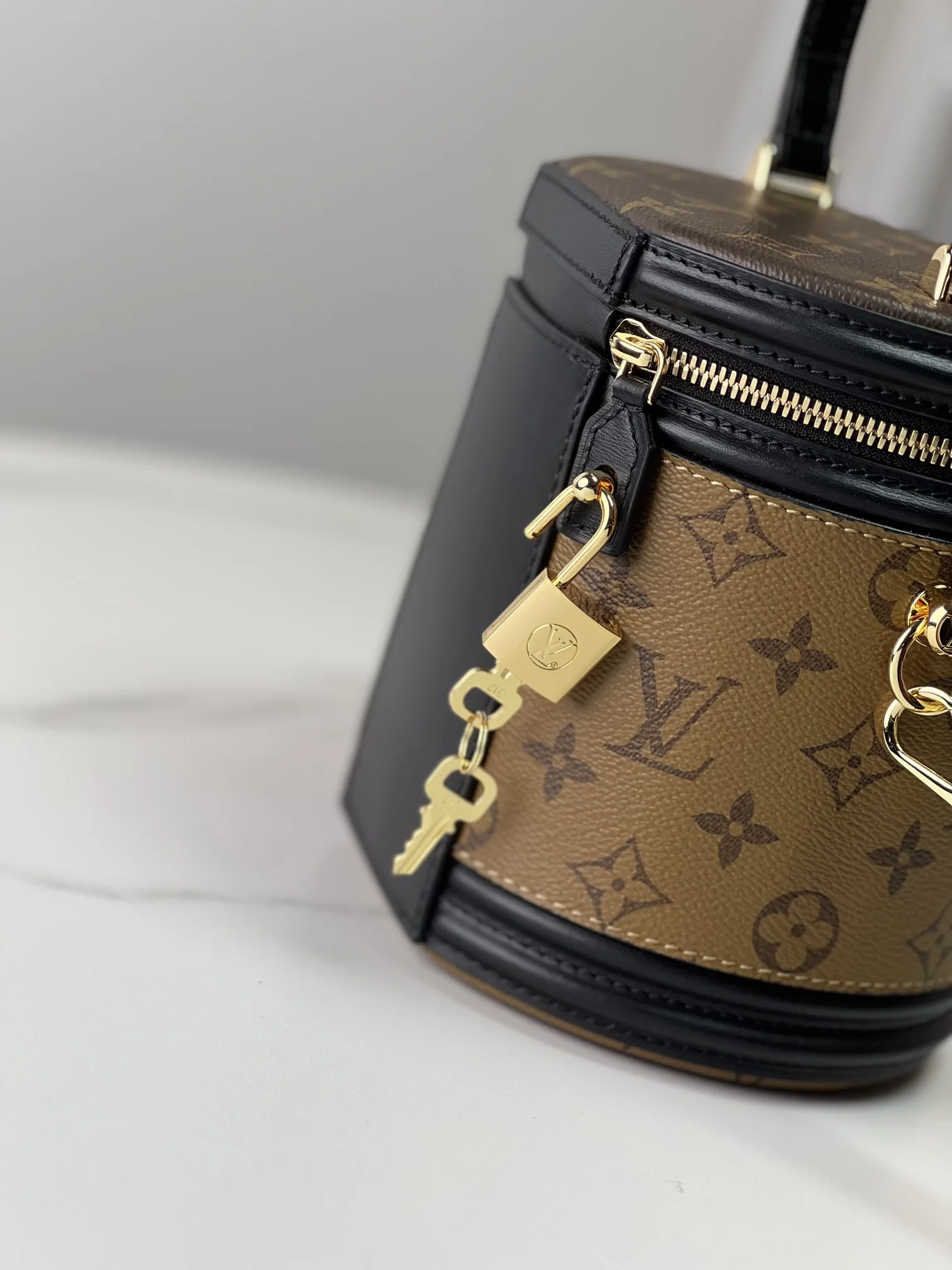海外原单M43986独家实拍 借鉴历史悠久的LV Cannes 化妆箱造型 女装艺术总监Nicolas Ghesquiere以此款半硬质手袋重现昔日经典的魅力 小号尺寸 Monogram与Monogram Reverse涂层帆布混合面料 充满路易威登传统特色的外观设计 十分雅致 配有顶部手柄和可脱卸皮革肩带 提供多种背携方式 尺寸 15×17×15cm
