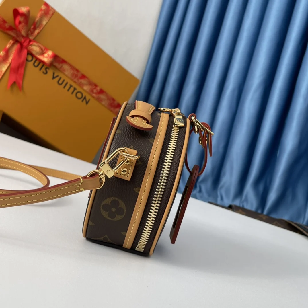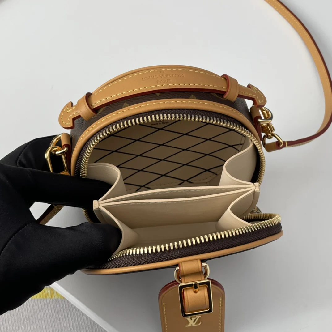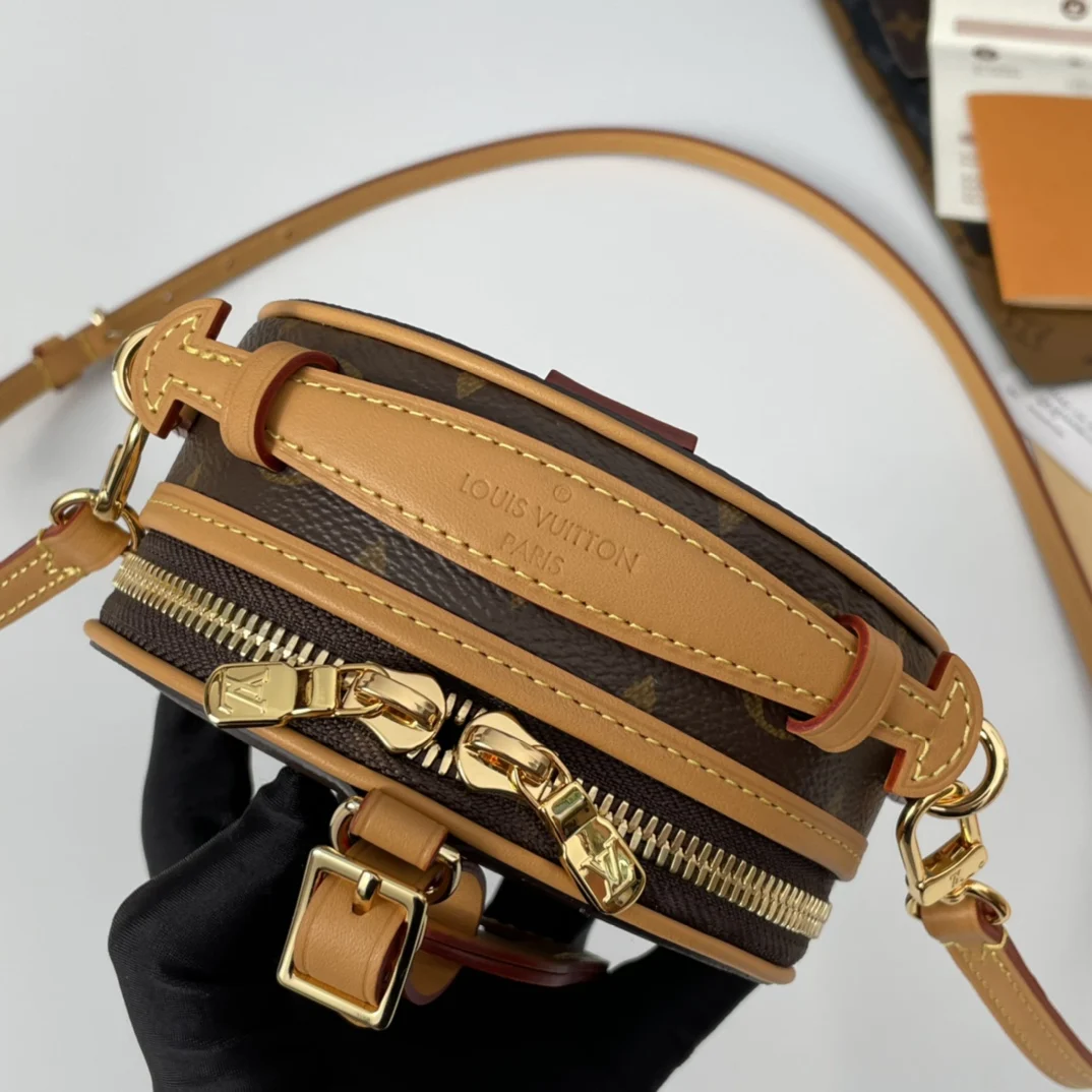 海外原单M44699独家实拍 Boite Chapeau 迷你包选用 Monogram Reverse 涂层帆布 点缀 Malletage 绗缝内衬 致敬品牌传统细节 打开拉链展现考究内里 配有大号风琴隔层 配有可拆卸肩带 可系于腰间 手持或肩背 尺寸 13×12×6.5cm