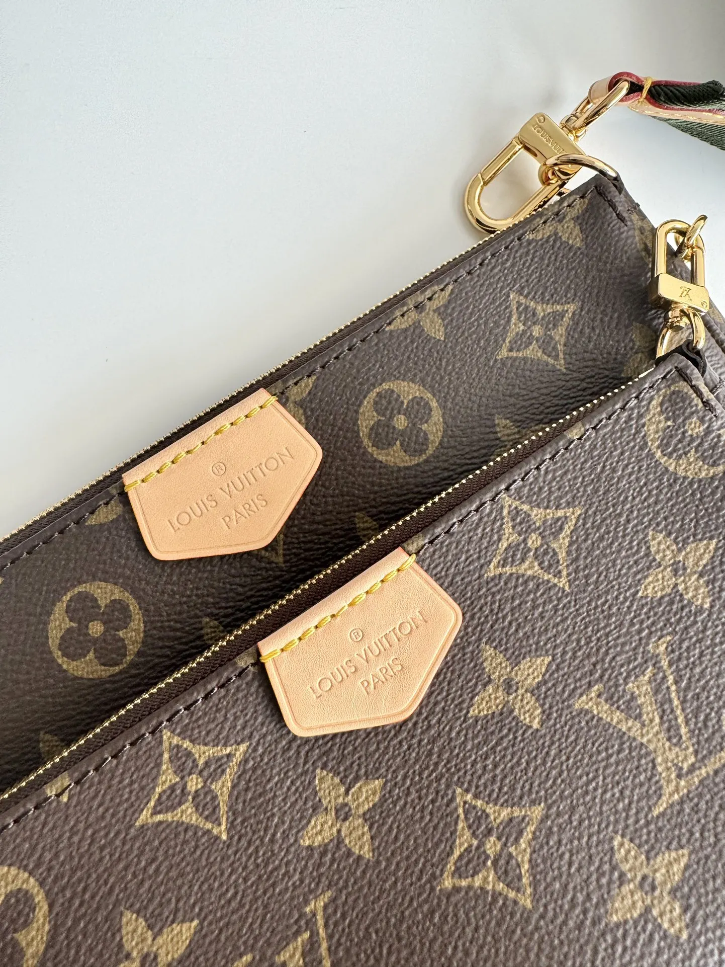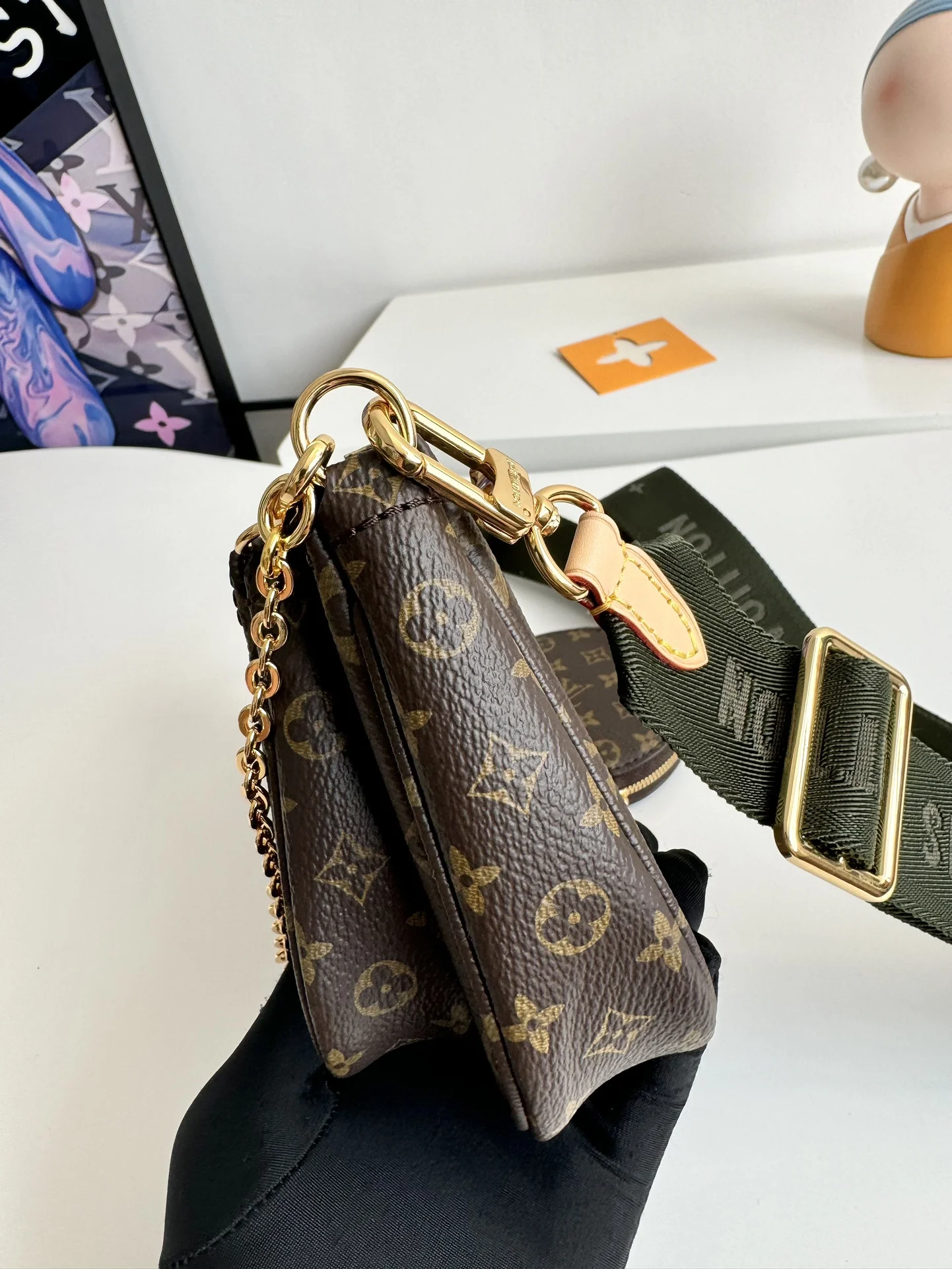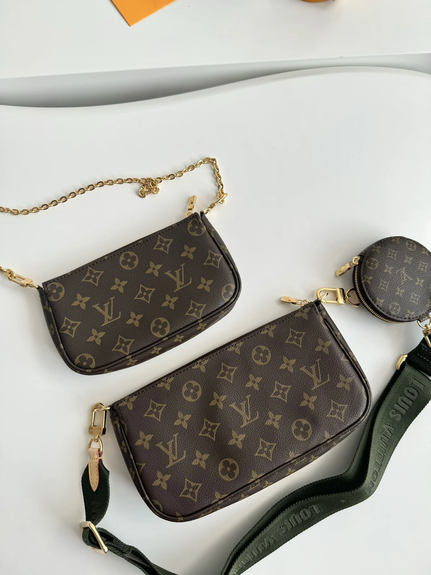 海外原单M44813独家实拍 Multi Pochette Accessories 手袋以 Monogram 帆布构筑三件合一的活力设计 另配备多个口袋和隔层 可调节金色链条与路易威登铭纹提花肩带提供斜挎等多种背携方式 尺寸 24×16×6cm