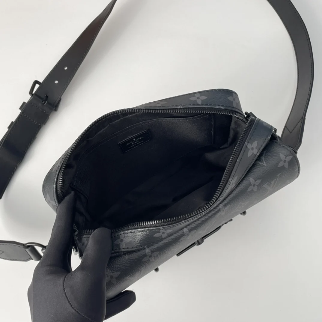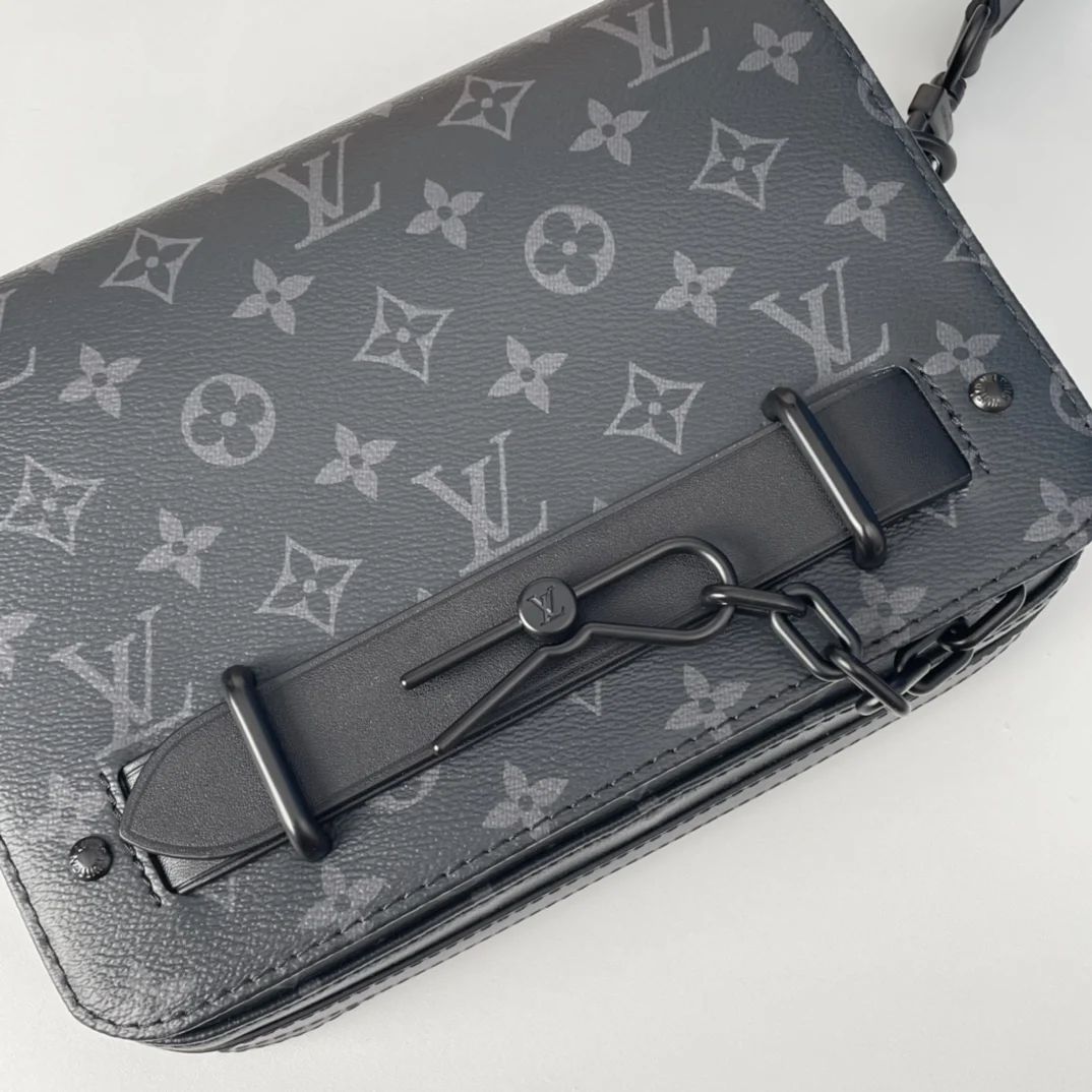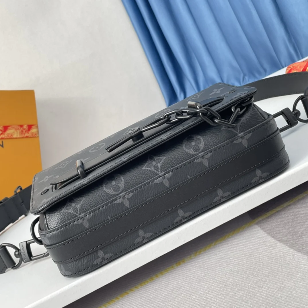 海外原单M45585独家实拍 此新款 Steamer 邮差包为 New Classics 系列注入品牌传统素 造型精美 标志性的 Monogram Eclipse 帆布与 Steamer 风格链条等经典素相得益彰 配有可脱卸肩带 便于背携 拉链隔层收纳空间充裕 搭配前袋翻盖和磁铁锁扣 确保物品安全无虞 尺寸 23.5×17×6cm