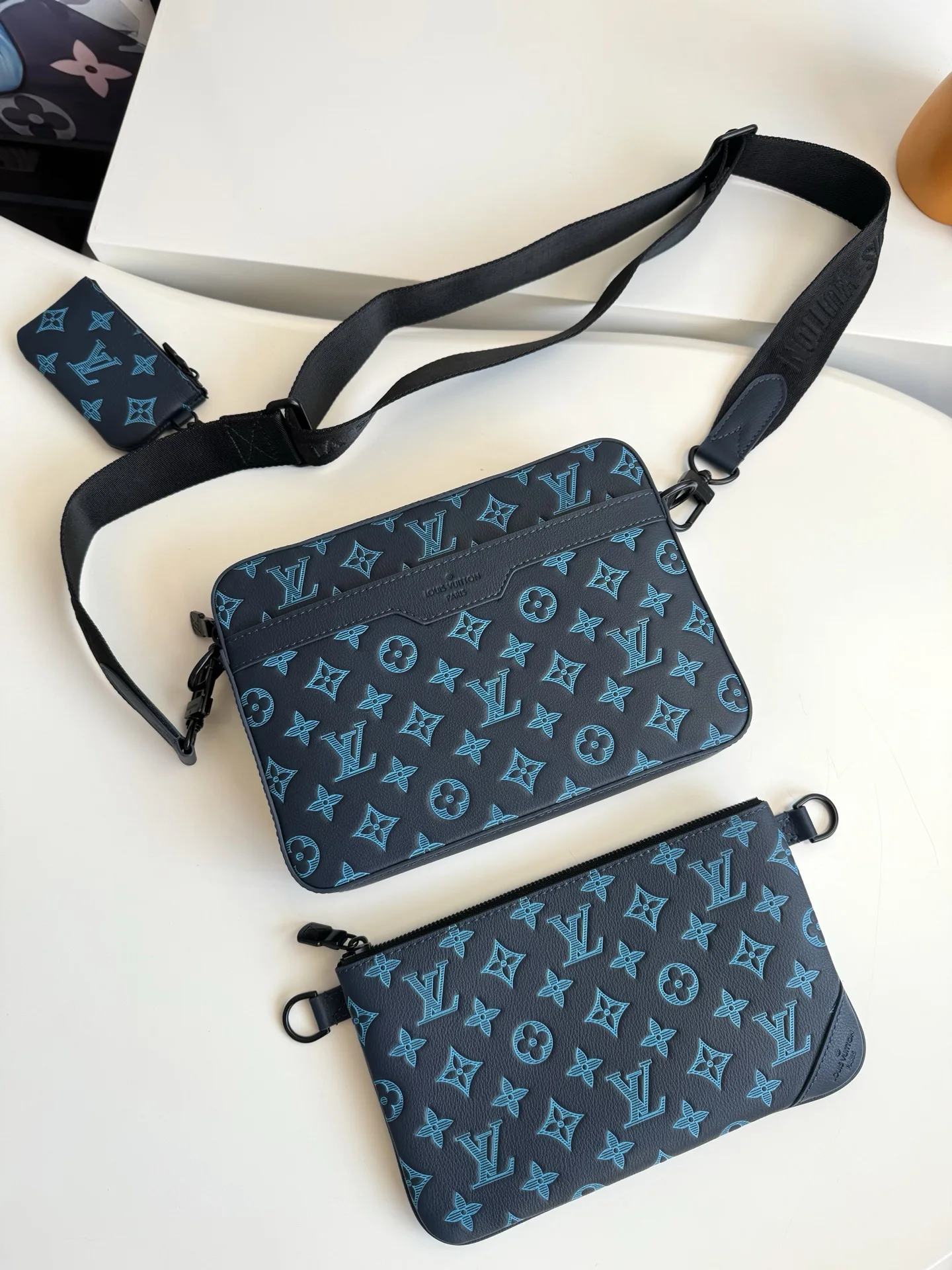 海外原单M46604独家实拍 本款 Trio Messenger 邮差包取材柔软 Monogram Shadow 牛皮革 搭配 Monogram Shadow 皮革袢带与主袋 拉链前袋 肩带与点缀其上的零包均可拆卸 肩带亦可调节 确保背携舒适贴合 尺寸 25×18.5×7cm